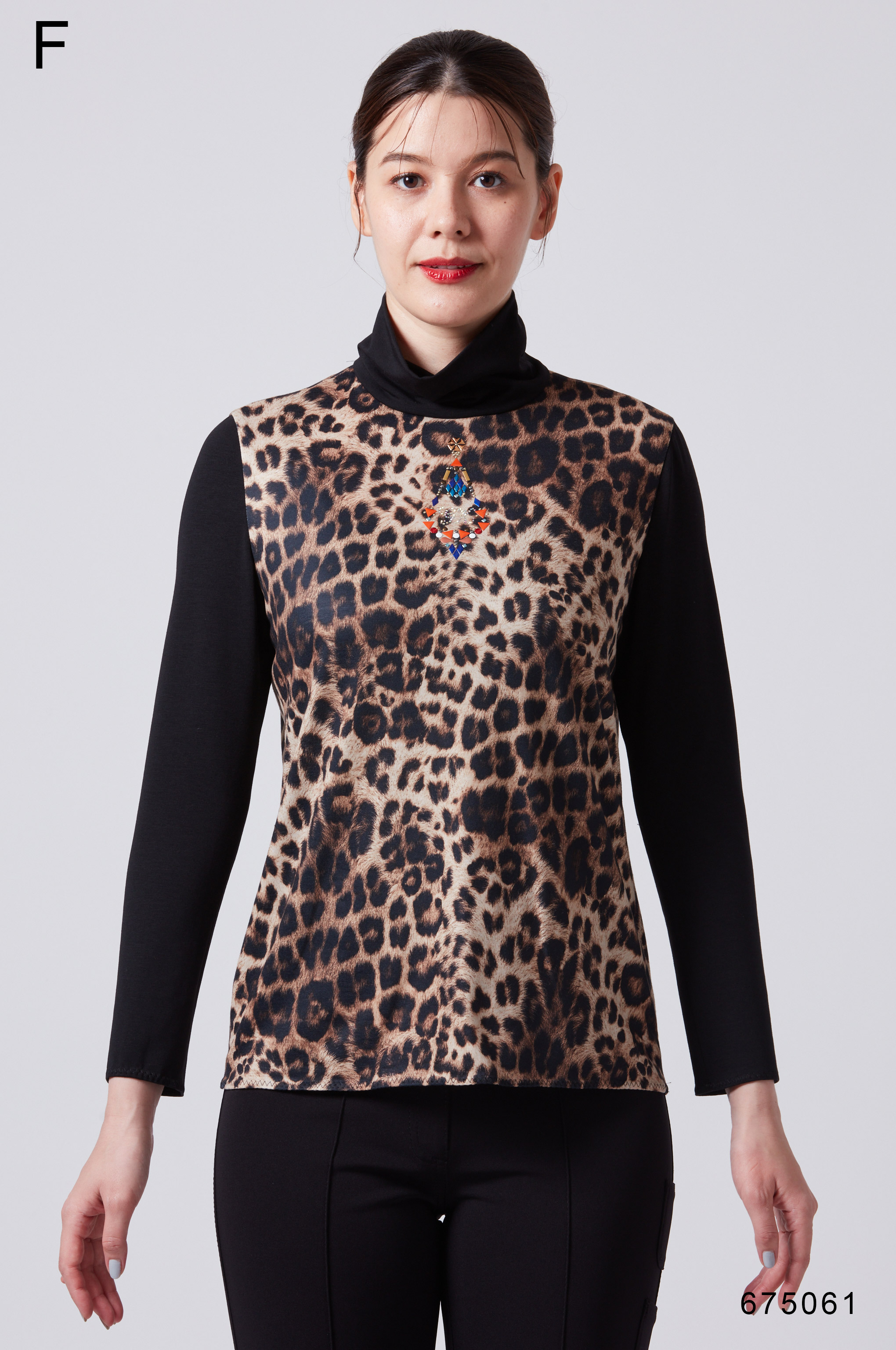 こちらの原型Tシャツは、伸縮性のある素材を使用し、ヒョウ柄と無地の組み合わせが特徴です。ゆるめのルーズ衿が着心地を良くし、前後身頃のデザインがおしゃれなアクセントとなっています。