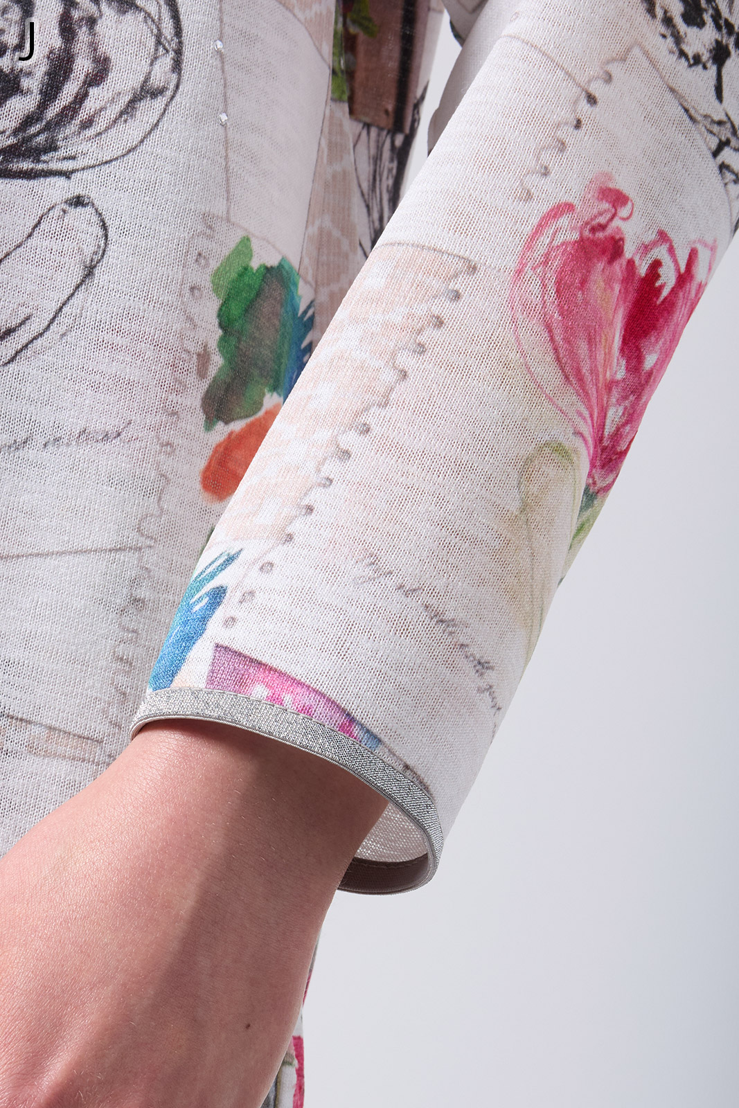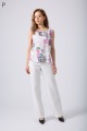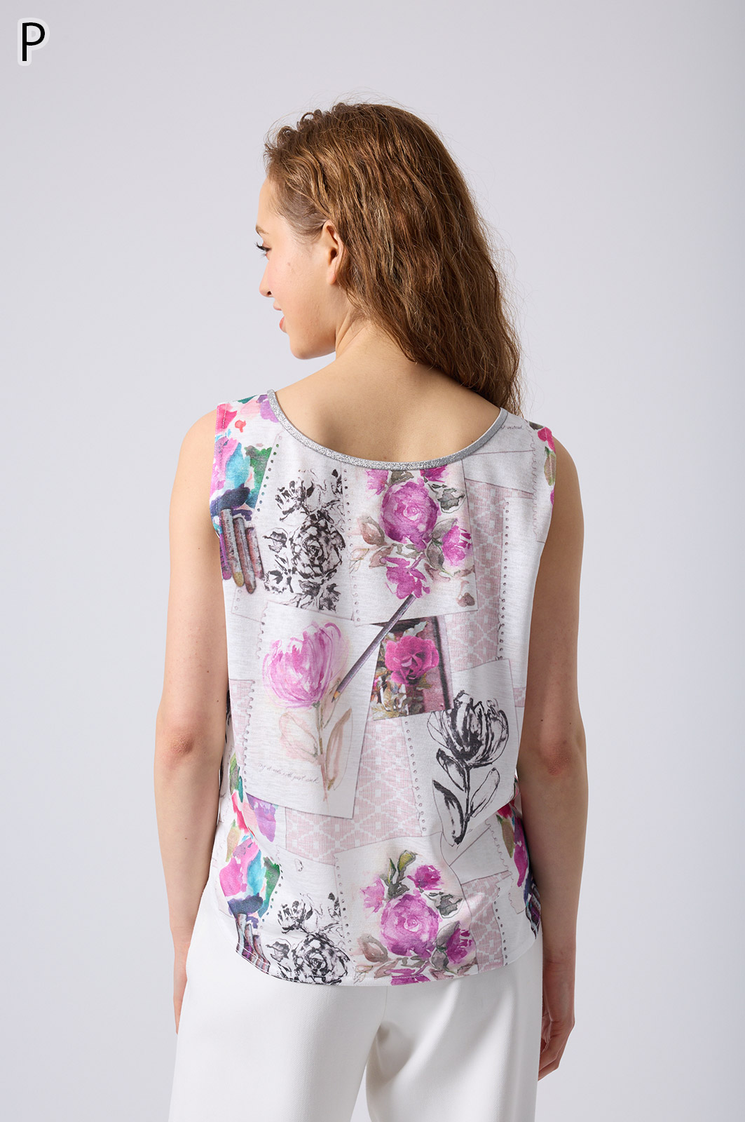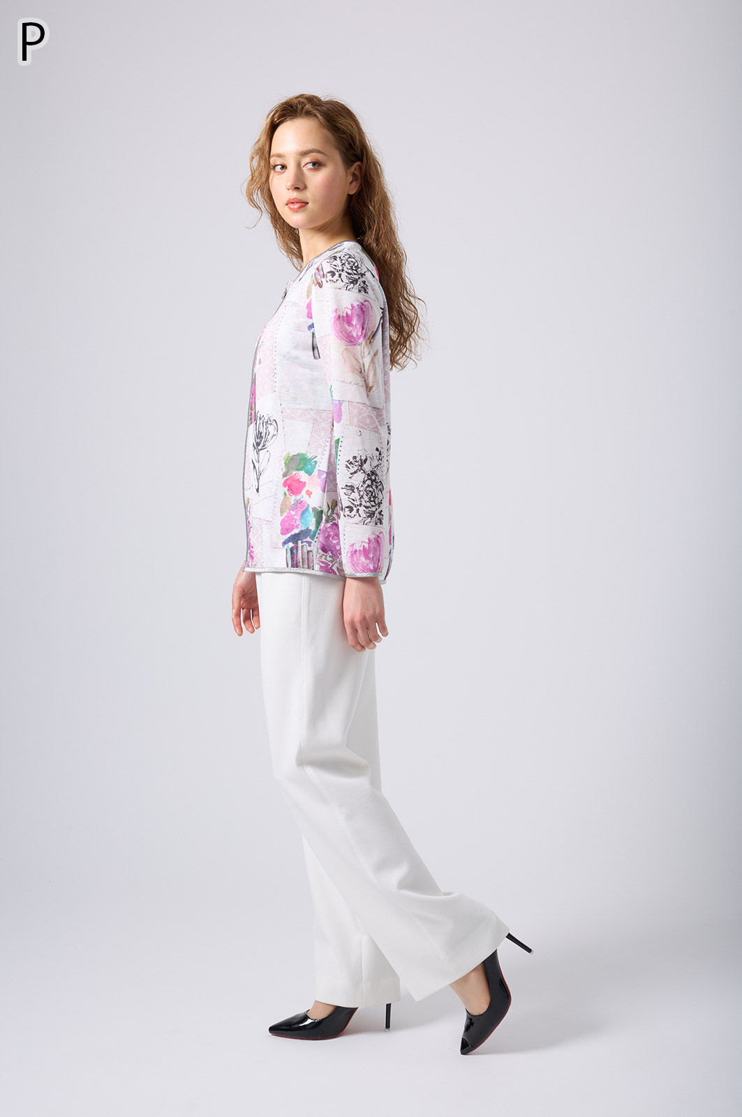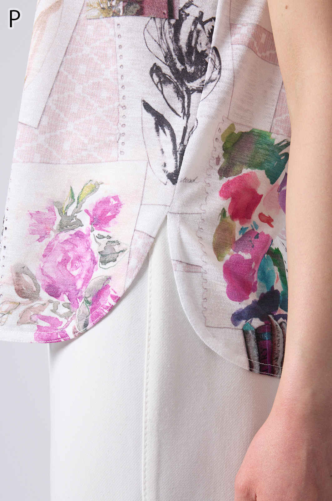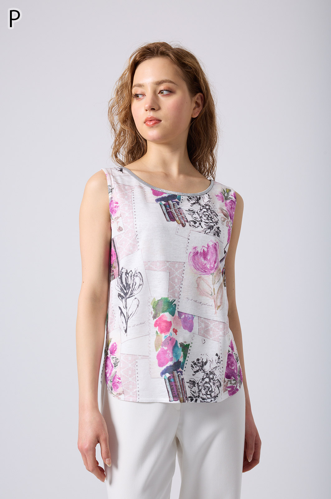 スケッチブックから飛び出したようなお花が舞うデザインが魅力的なポリエステルニット素材のアイテム。同柄のタンクトップとブラウスはセットでも単品でも楽しめます。部分使いのラメストレッチテープがアクセントとなり、華やかさを引き立てます。