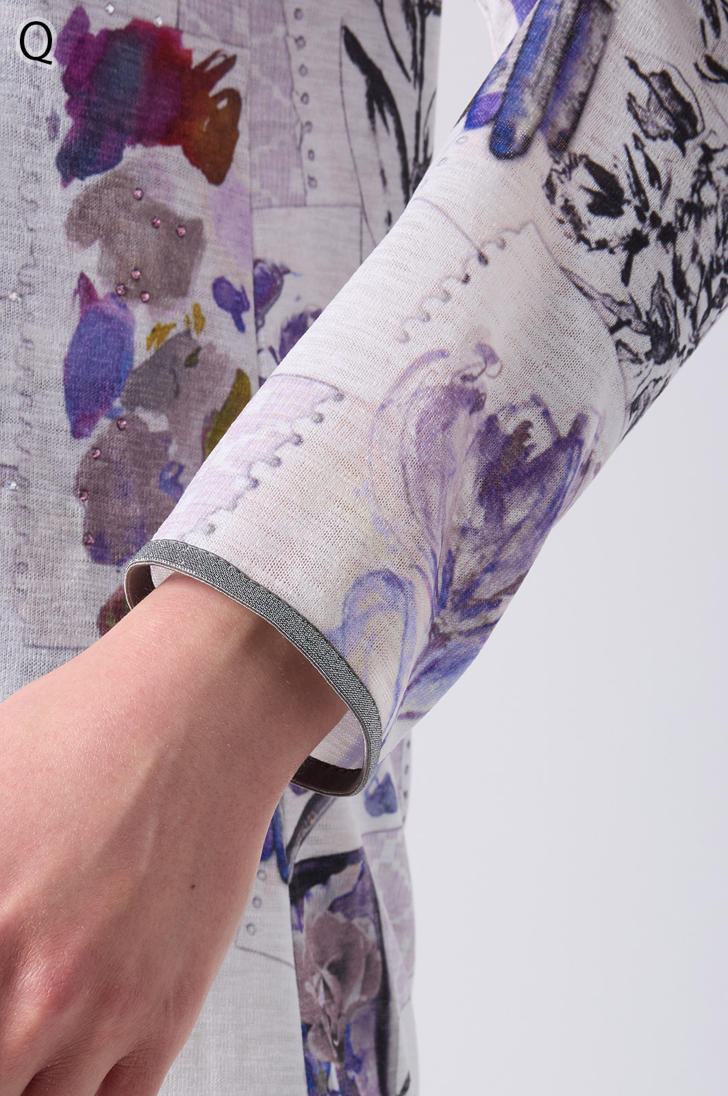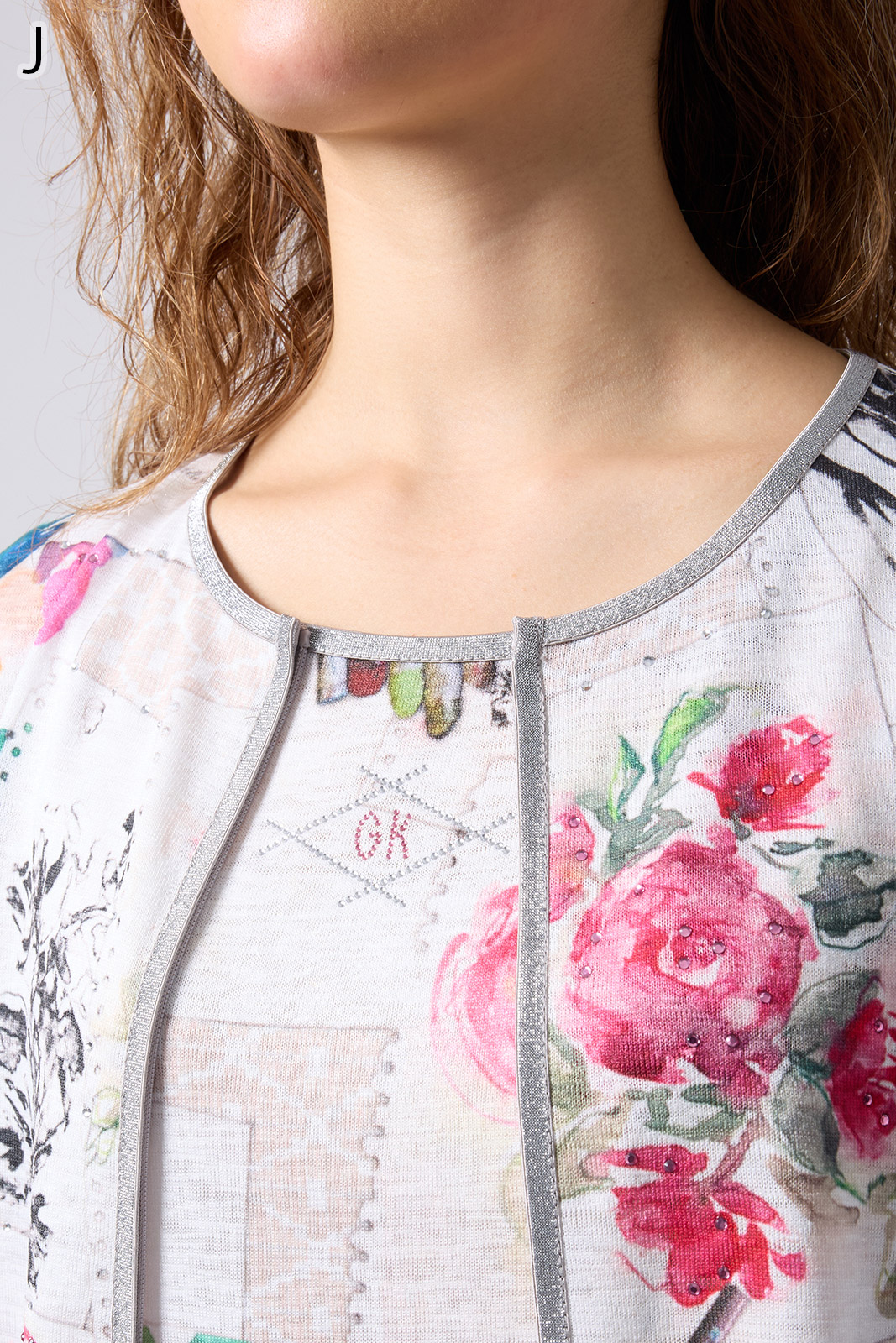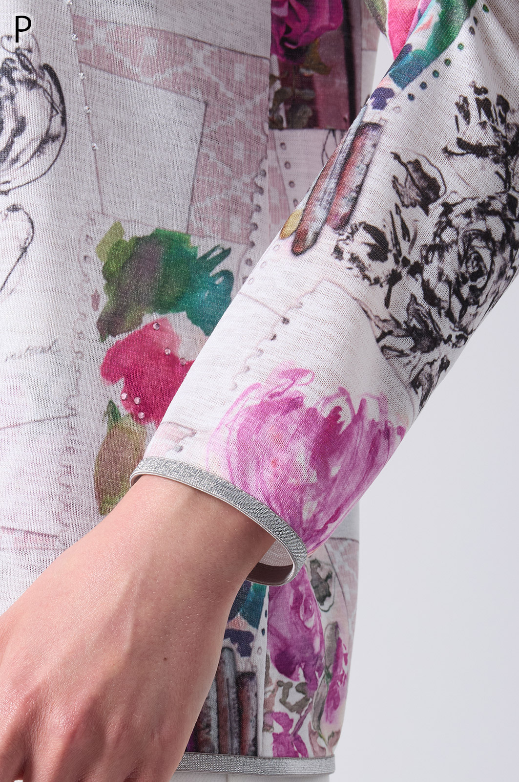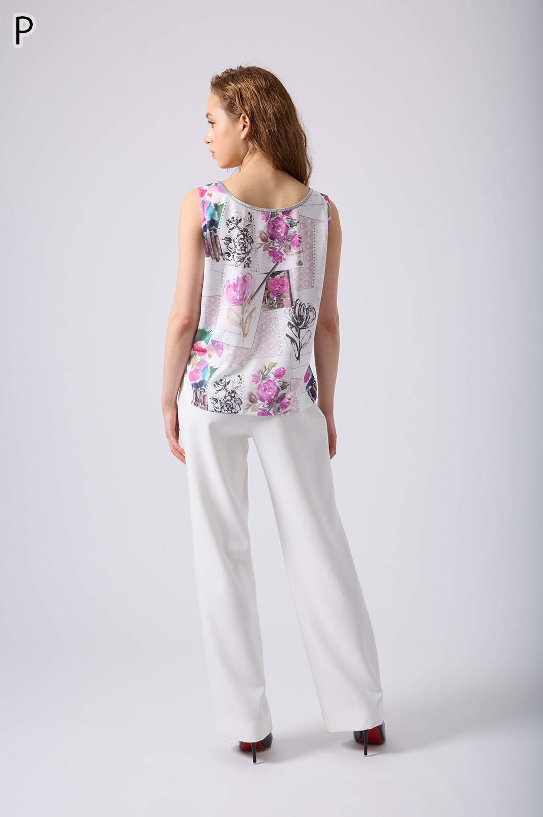 スケッチブックから飛び出したようなお花が舞うデザインが魅力的なポリエステルニット素材のアイテム。同柄のタンクトップとブラウスはセットでも単品でも楽しめます。部分使いのラメストレッチテープがアクセントとなり、華やかさを引き立てます。