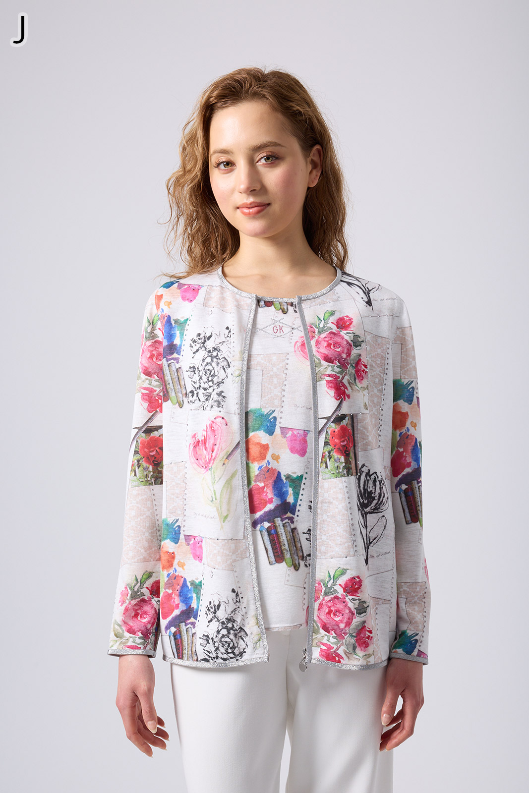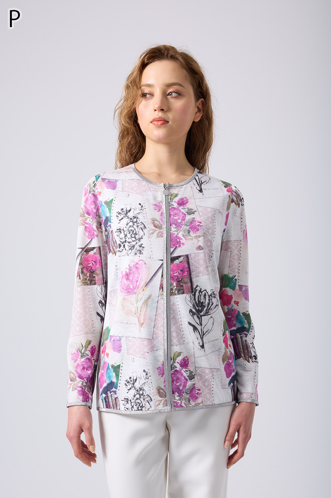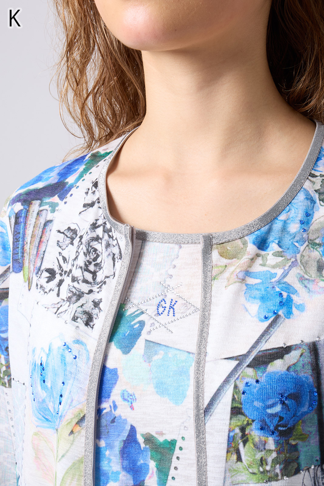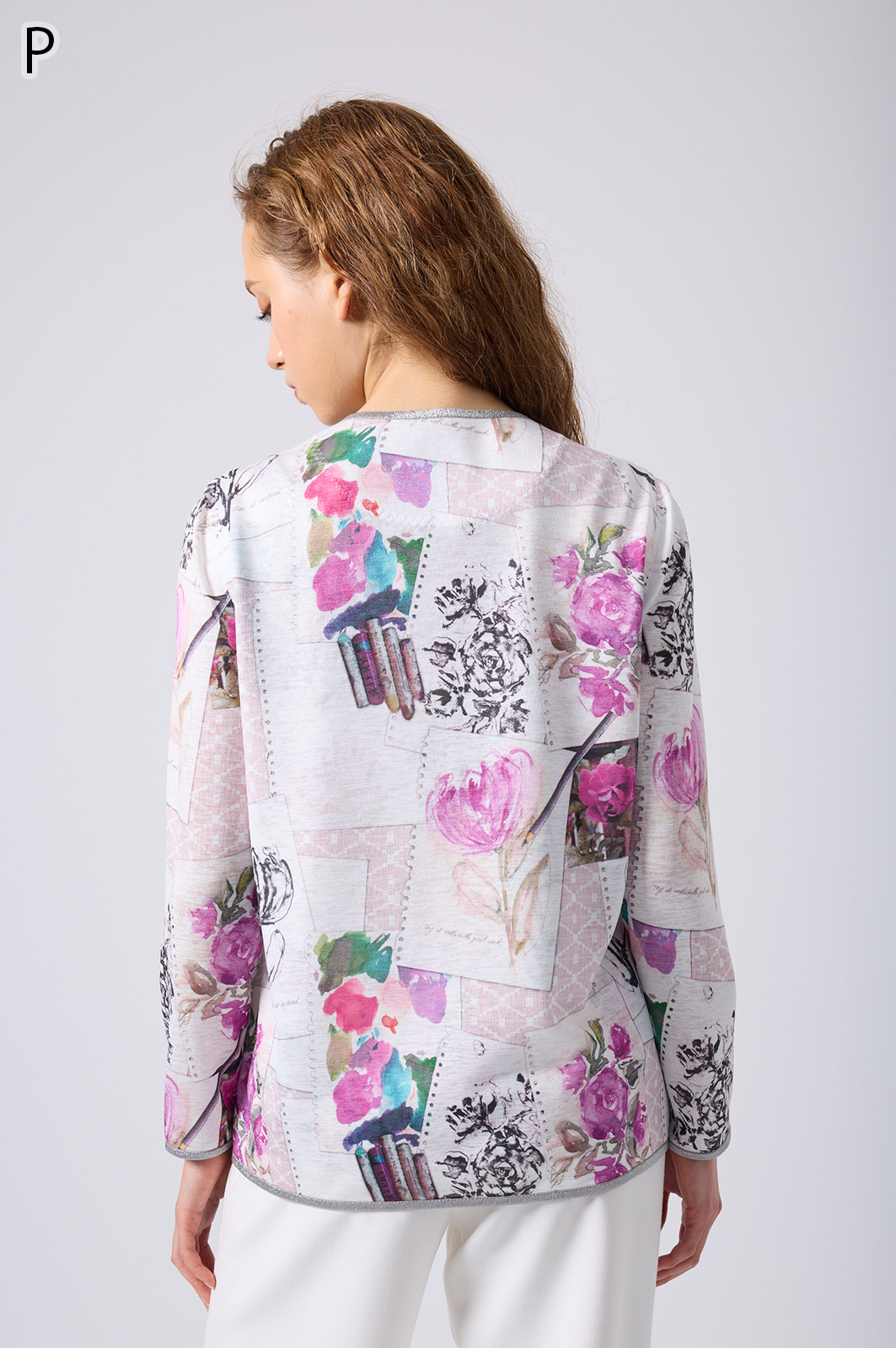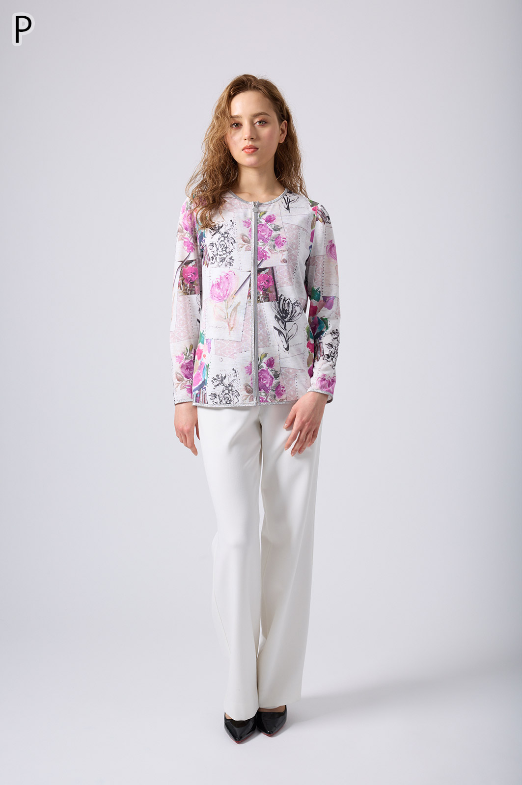 スケッチブックから飛び出したようなお花が舞うデザインが魅力的なポリエステルニット素材のアイテム。同柄のタンクトップとブラウスはセットでも単品でも楽しめます。部分使いのラメストレッチテープがアクセントとなり、華やかさを引き立てます。