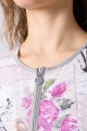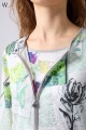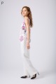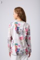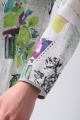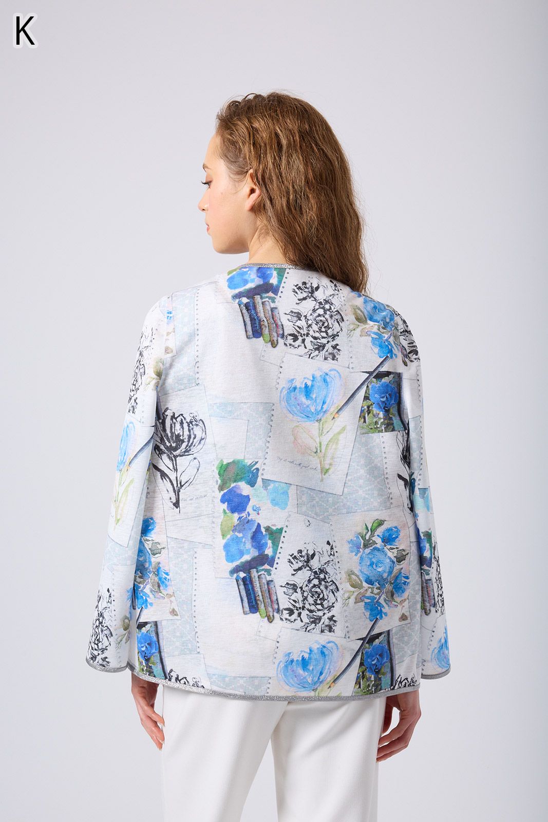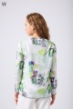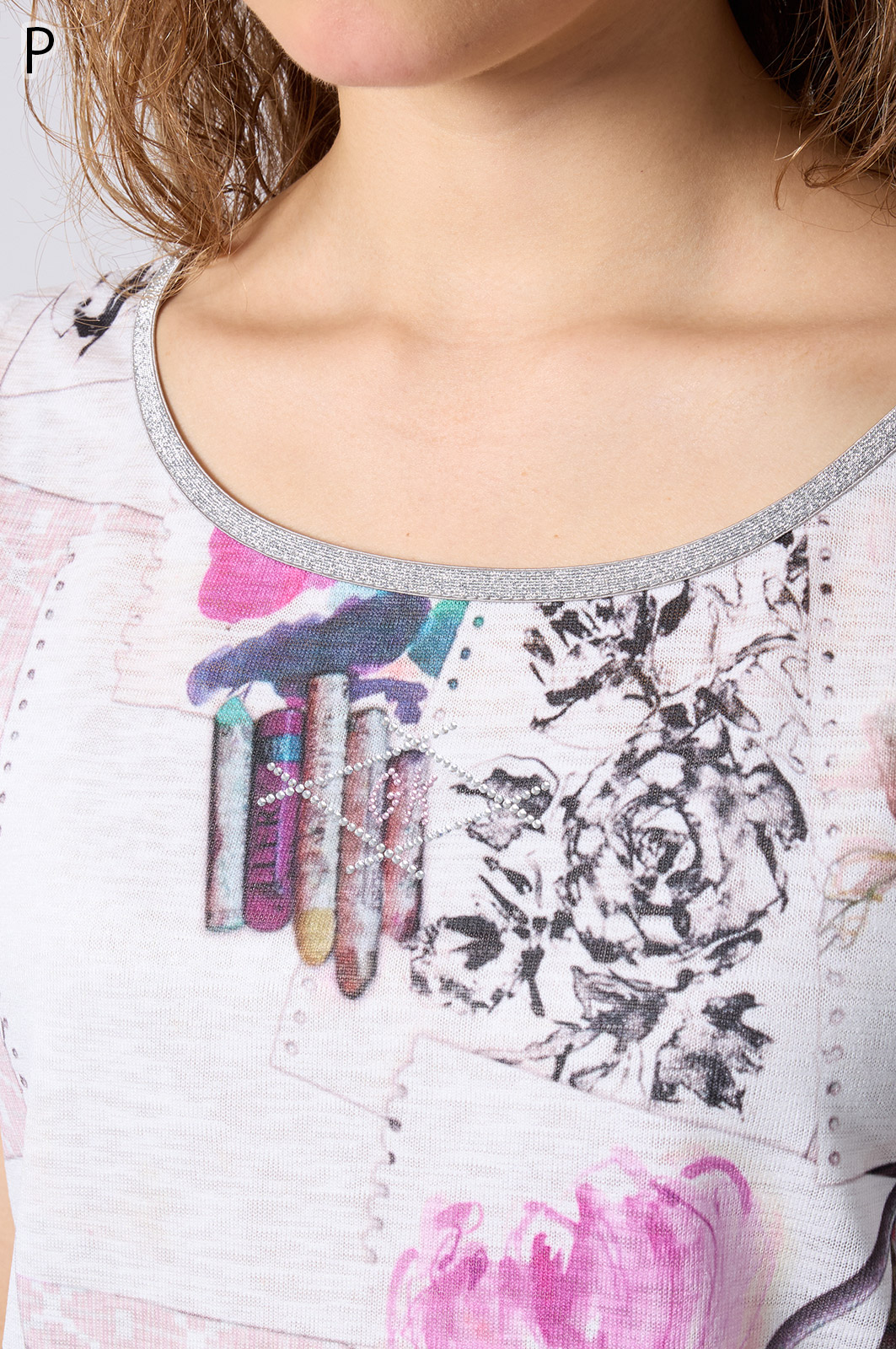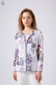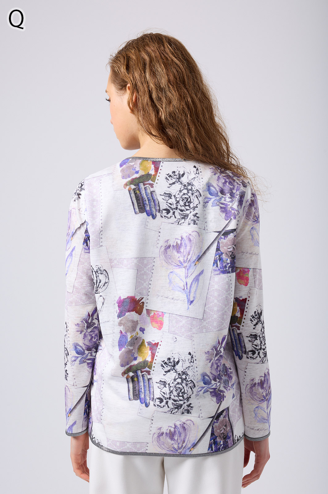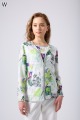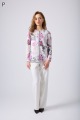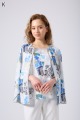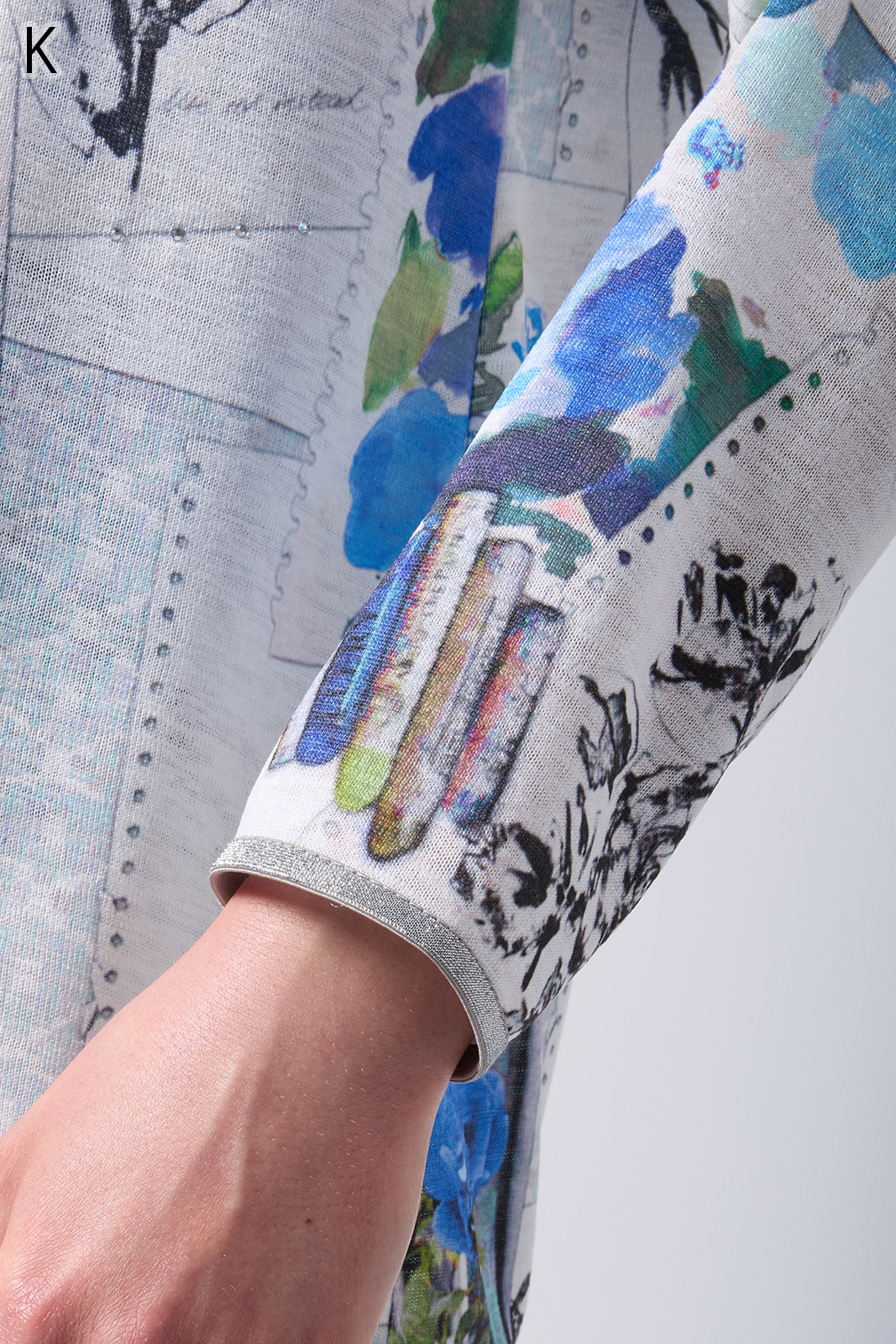 スケッチブックから飛び出したようなお花が舞うデザインが魅力的なポリエステルニット素材のアイテム。同柄のタンクトップとブラウスはセットでも単品でも楽しめます。部分使いのラメストレッチテープがアクセントとなり、華やかさを引き立てます。