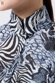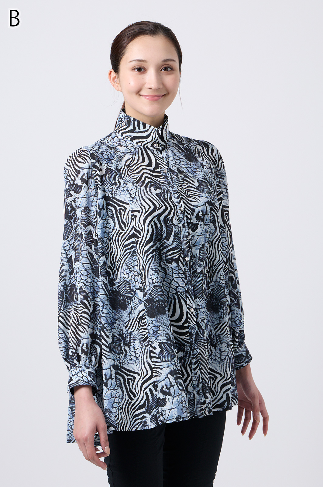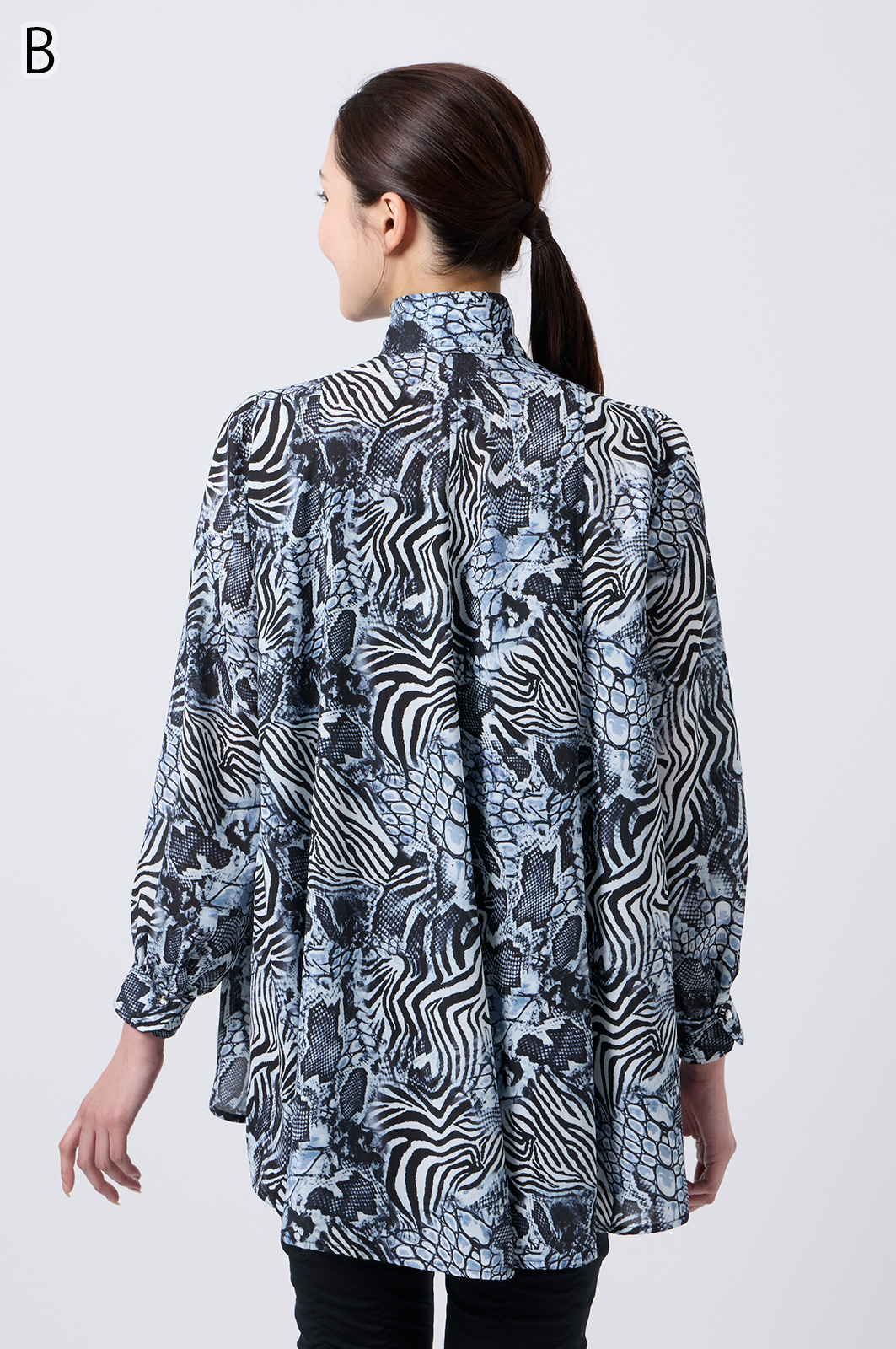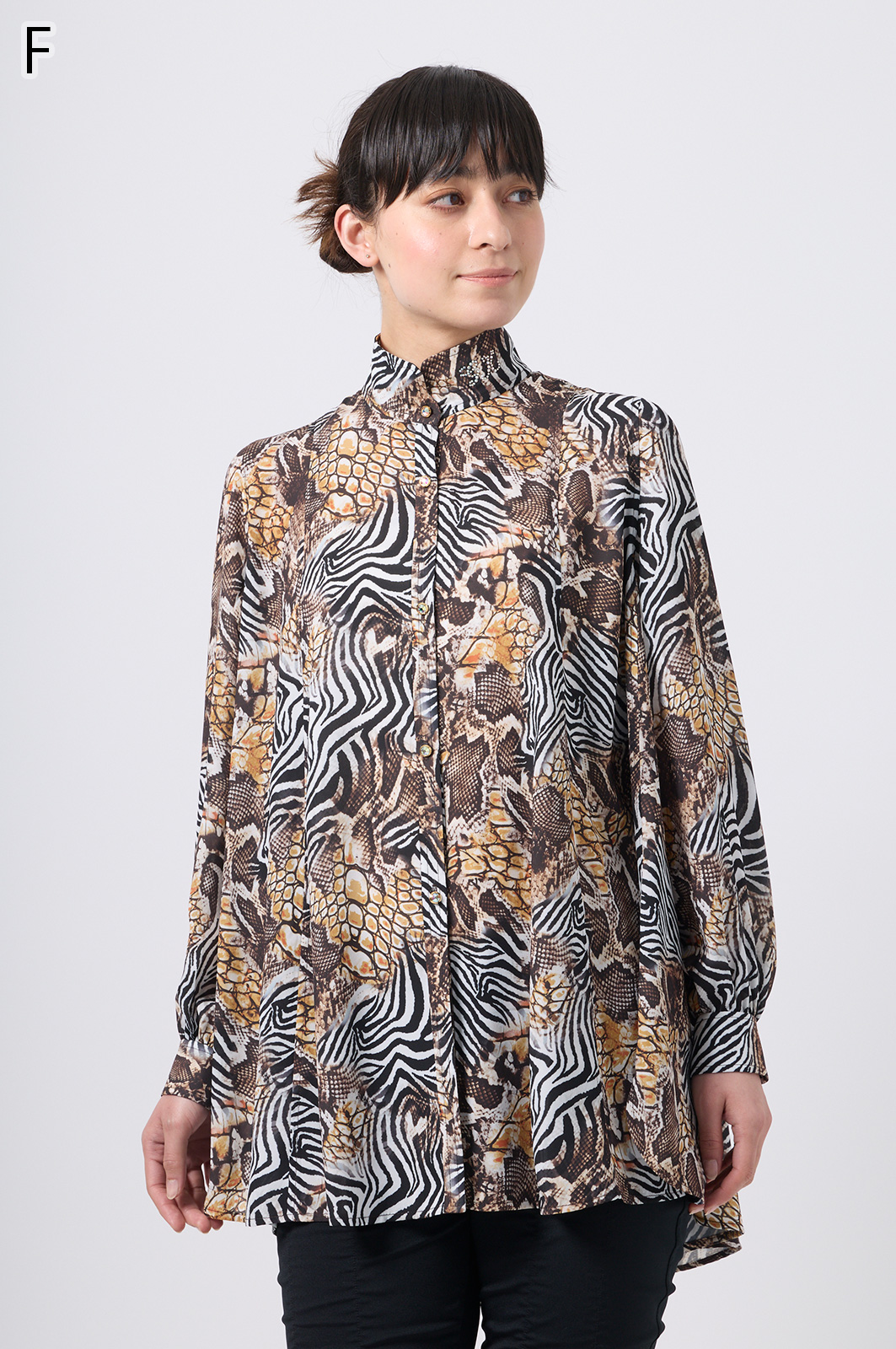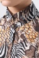 伊太利屋らしいアニマルプリントが魅力のフレアーブラウス。シワになりにくい素材を使用し、美しい切替デザインで分量たっぷりのフレアが華やかさを演出します。