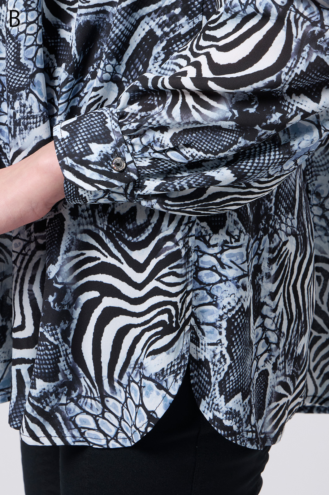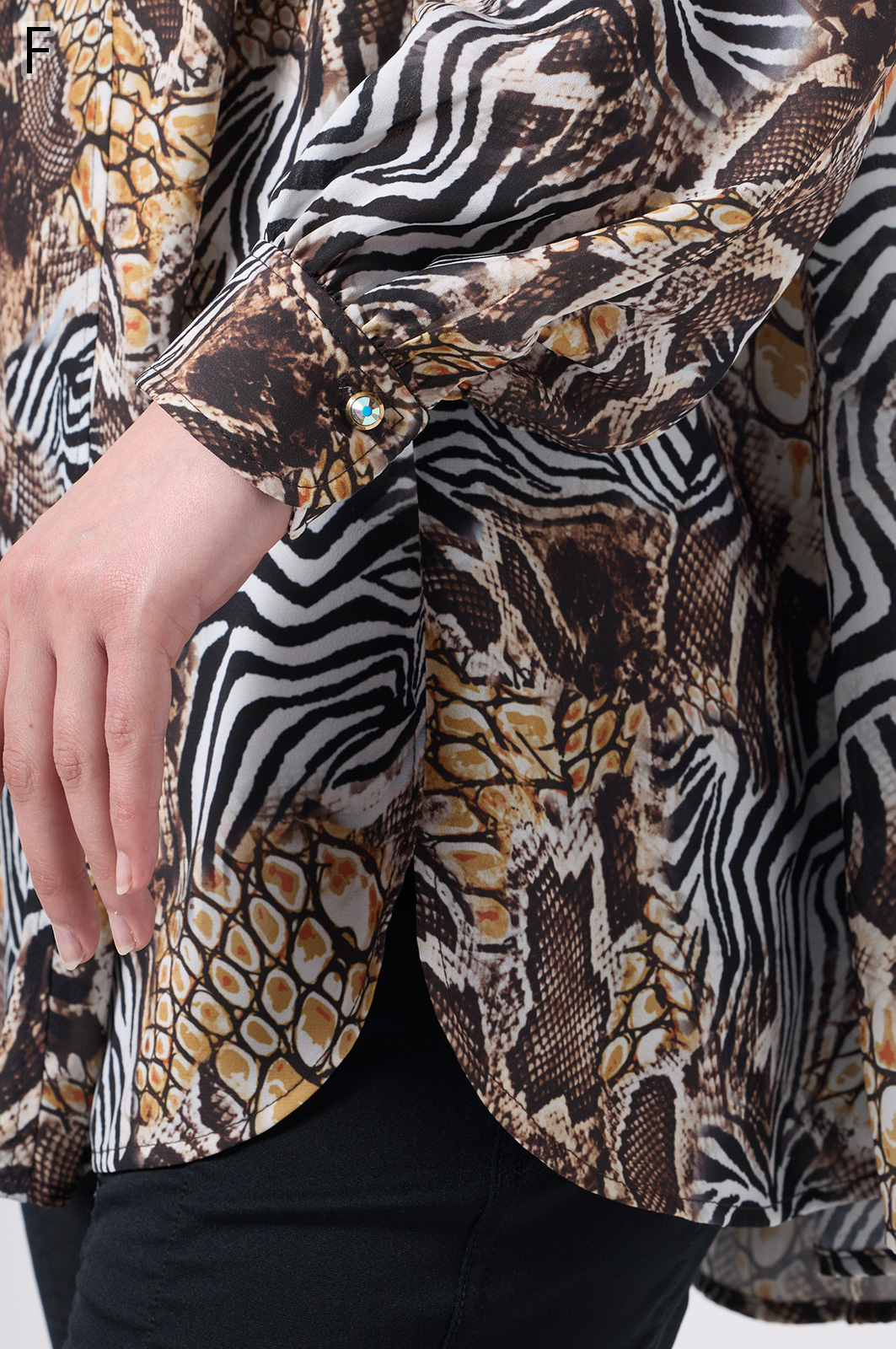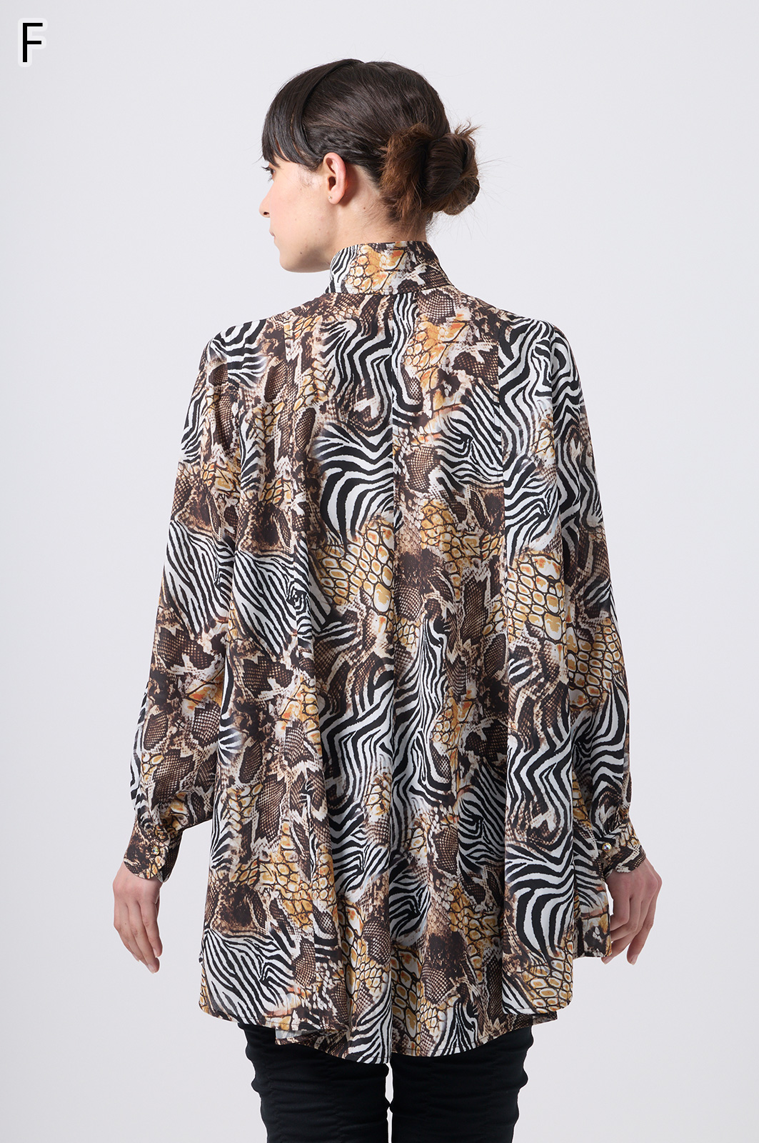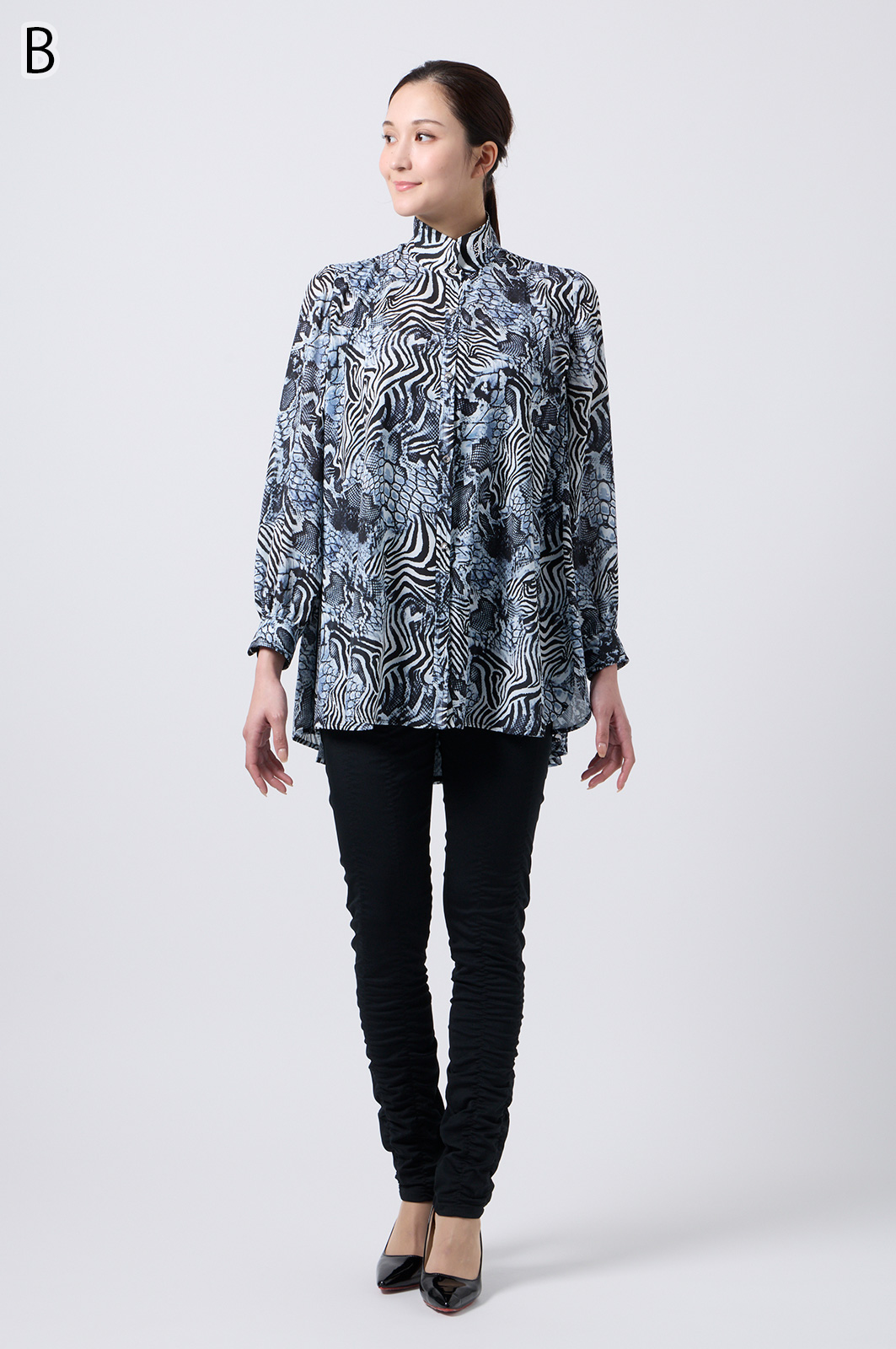 伊太利屋らしいアニマルプリントが魅力のフレアーブラウス。シワになりにくい素材を使用し、美しい切替デザインで分量たっぷりのフレアが華やかさを演出します。
