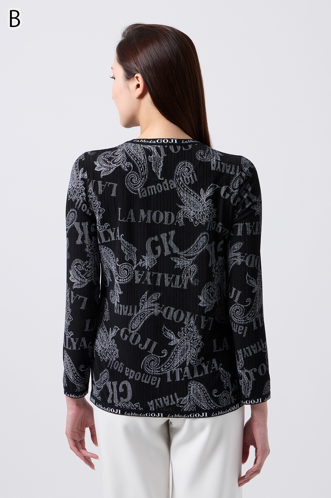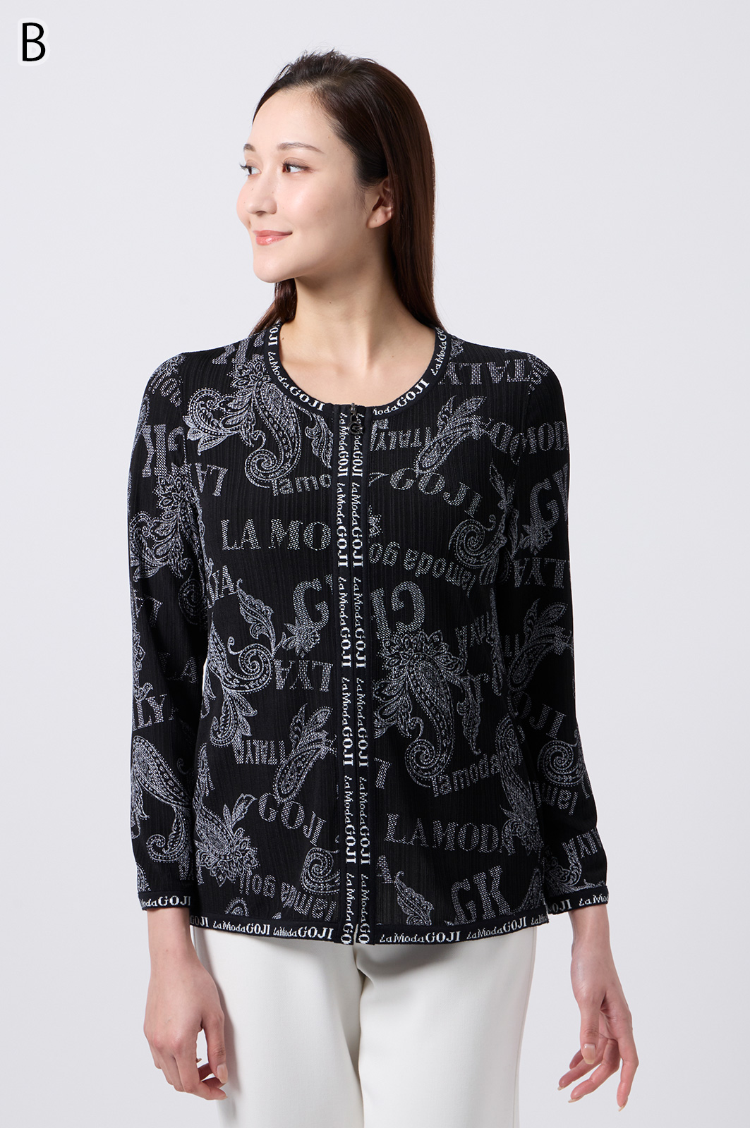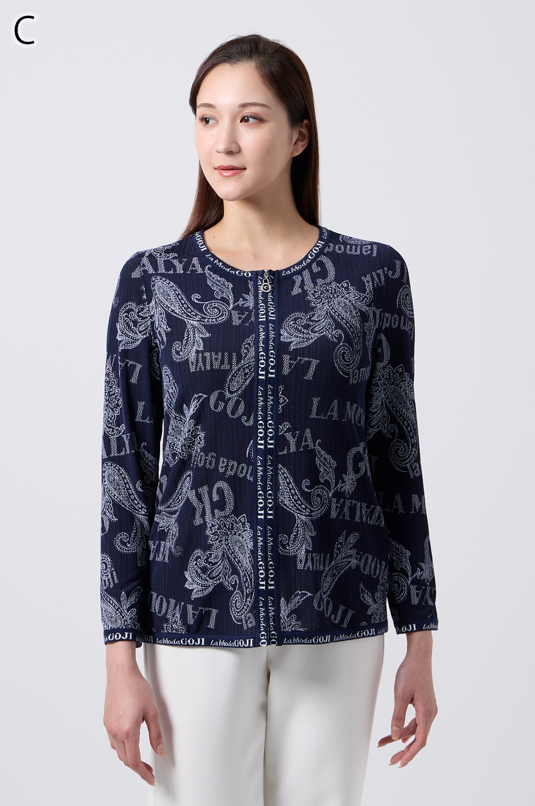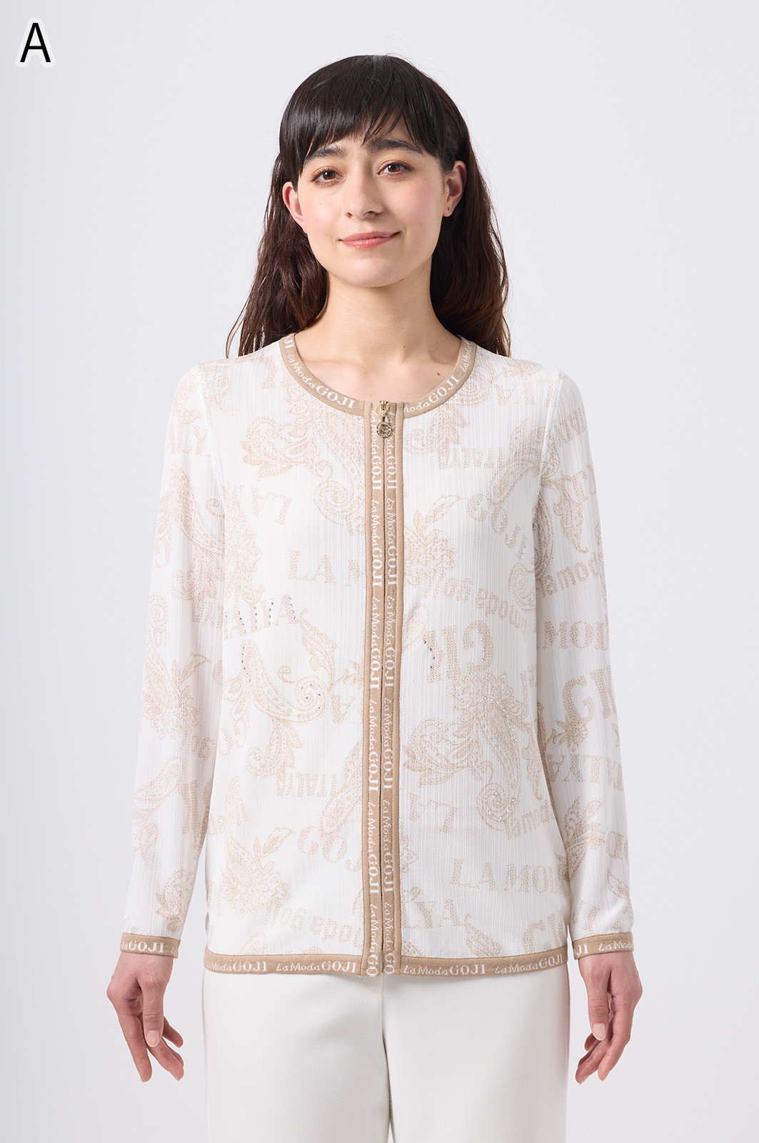 落ち感のあるモダーレ素材を使用し、オリジナルペーズリー&ロゴのプリントが魅力のブラウス。前ファスナー仕様で、衿ぐりや袖口、裾には高級感のあるロゴ入りリンキング始末を施しました。前を開けてカーディガン風にも楽しめる一着です。