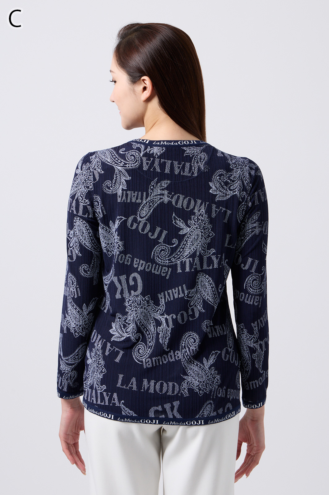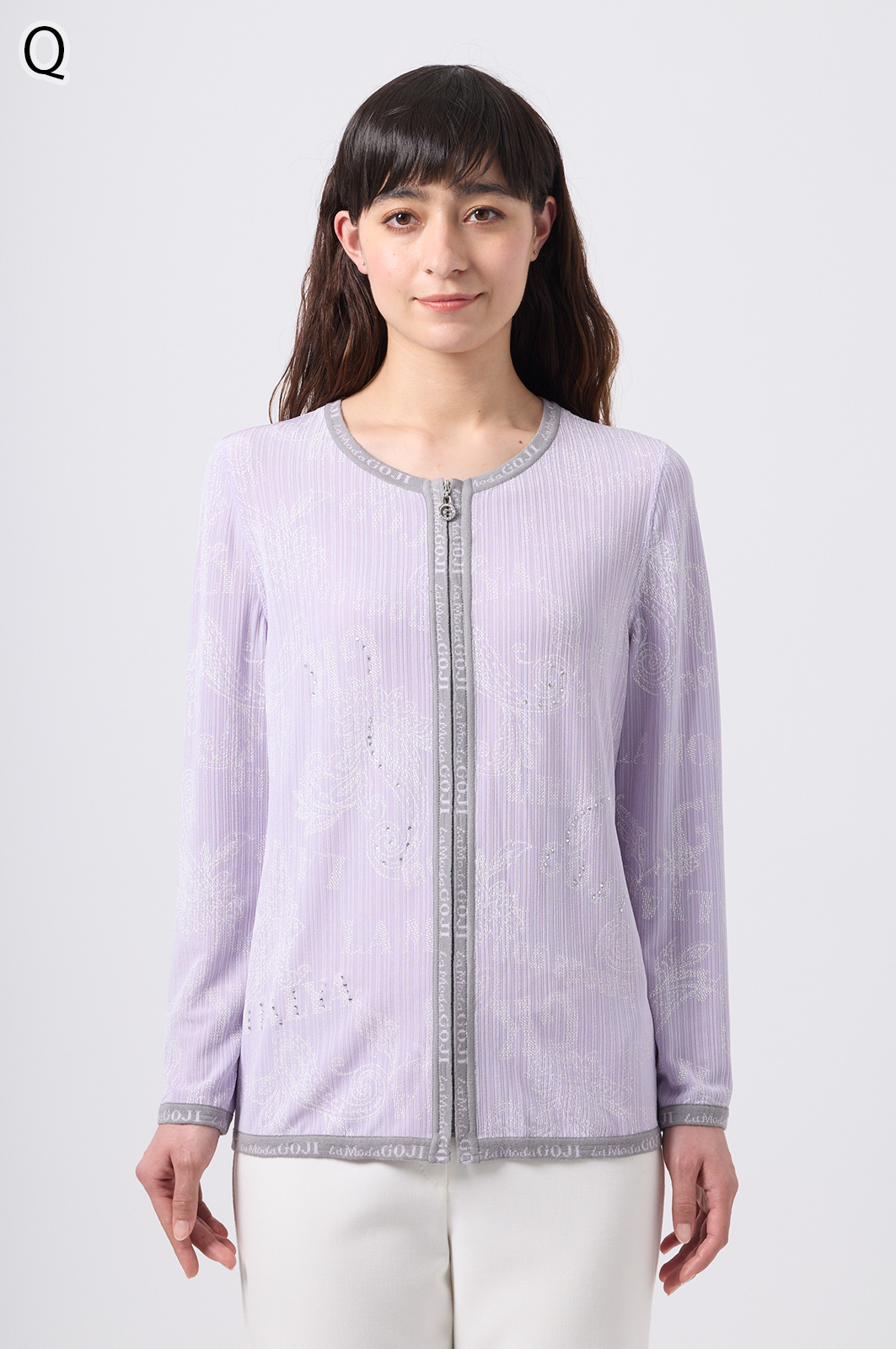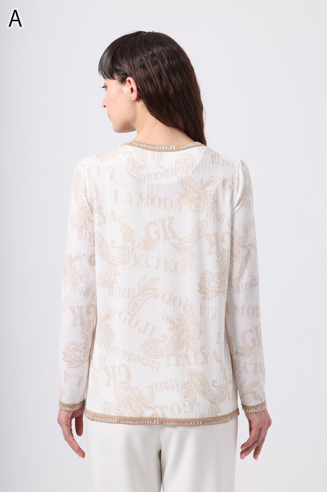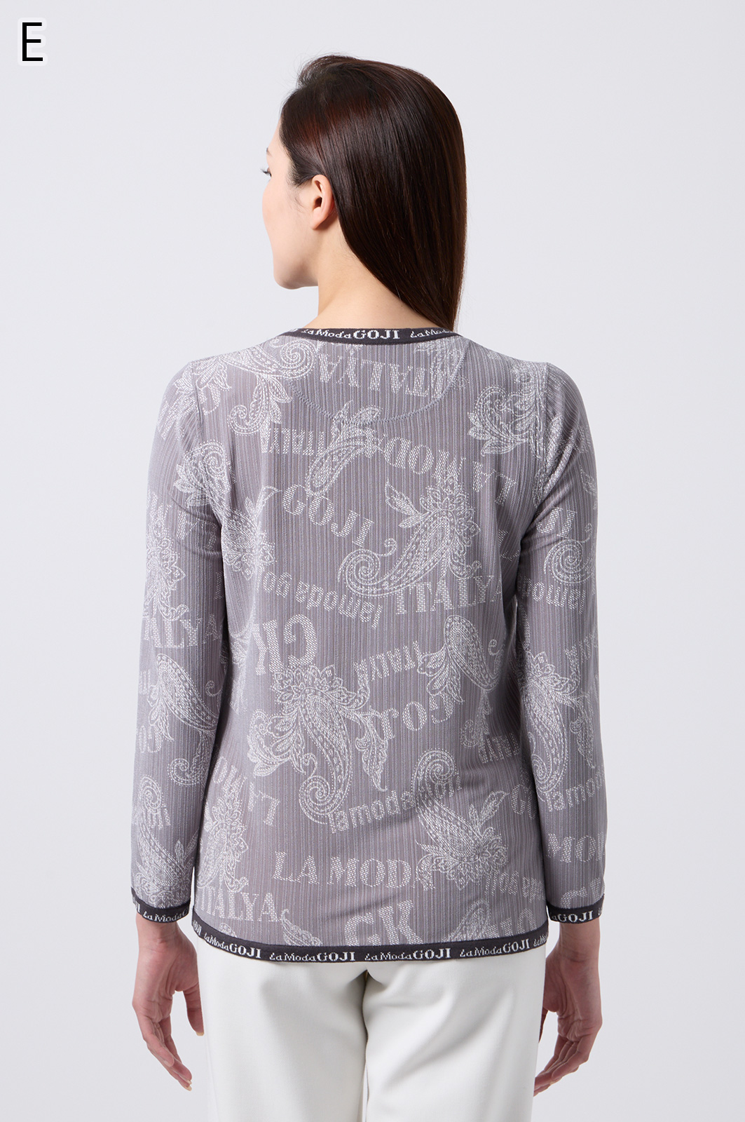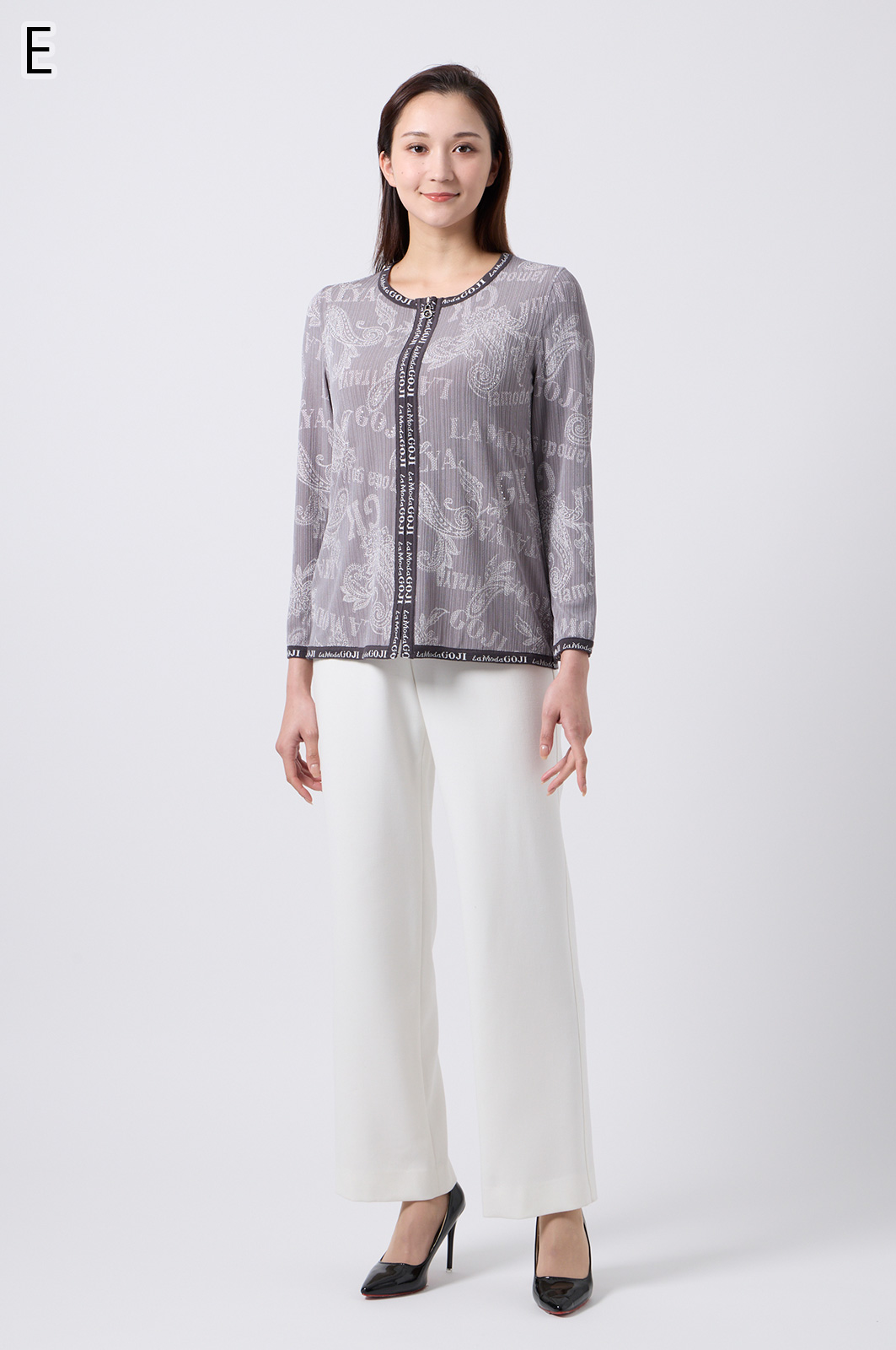 落ち感のあるモダーレ素材を使用し、オリジナルペーズリー&ロゴのプリントが魅力のブラウス。前ファスナー仕様で、衿ぐりや袖口、裾には高級感のあるロゴ入りリンキング始末を施しました。前を開けてカーディガン風にも楽しめる一着です。