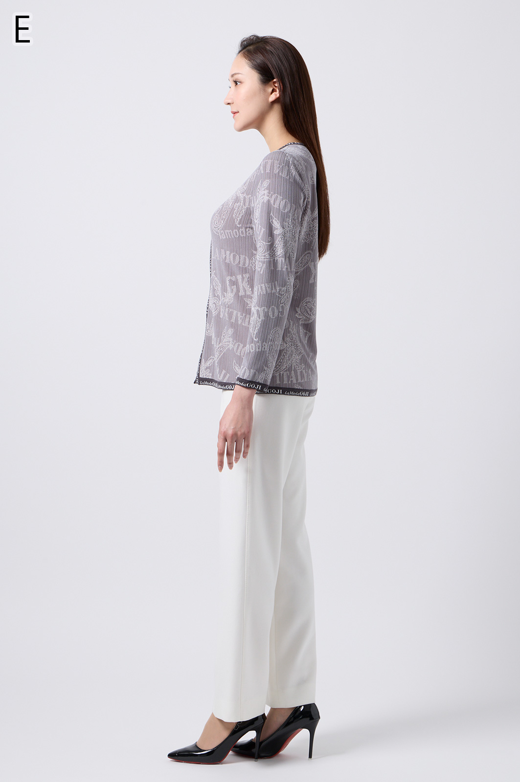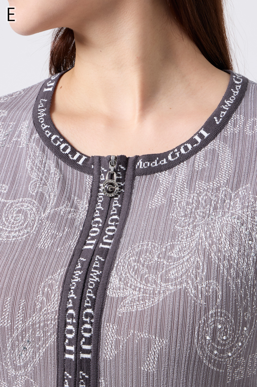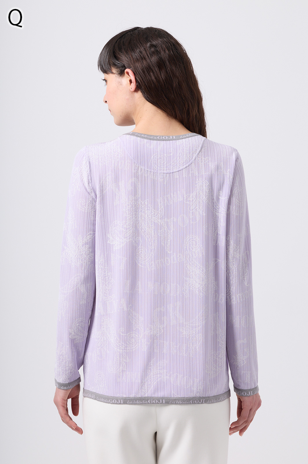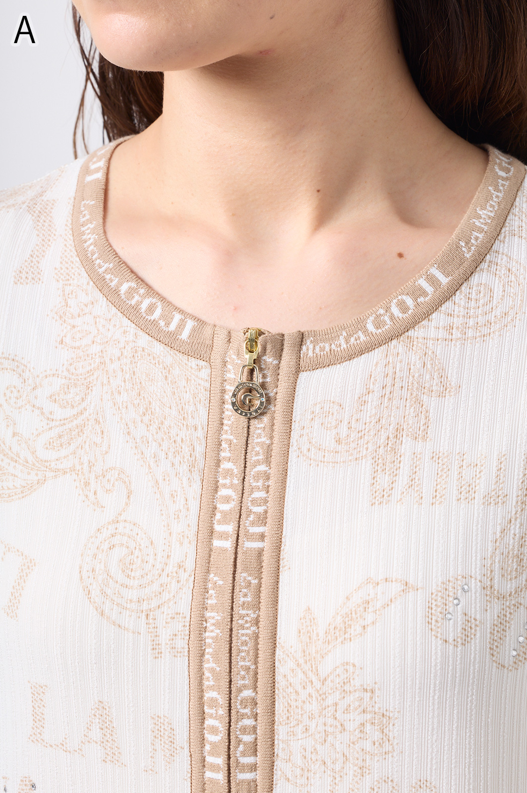 落ち感のあるモダーレ素材を使用し、オリジナルペーズリー&ロゴのプリントが魅力のブラウス。前ファスナー仕様で、衿ぐりや袖口、裾には高級感のあるロゴ入りリンキング始末を施しました。前を開けてカーディガン風にも楽しめる一着です。
