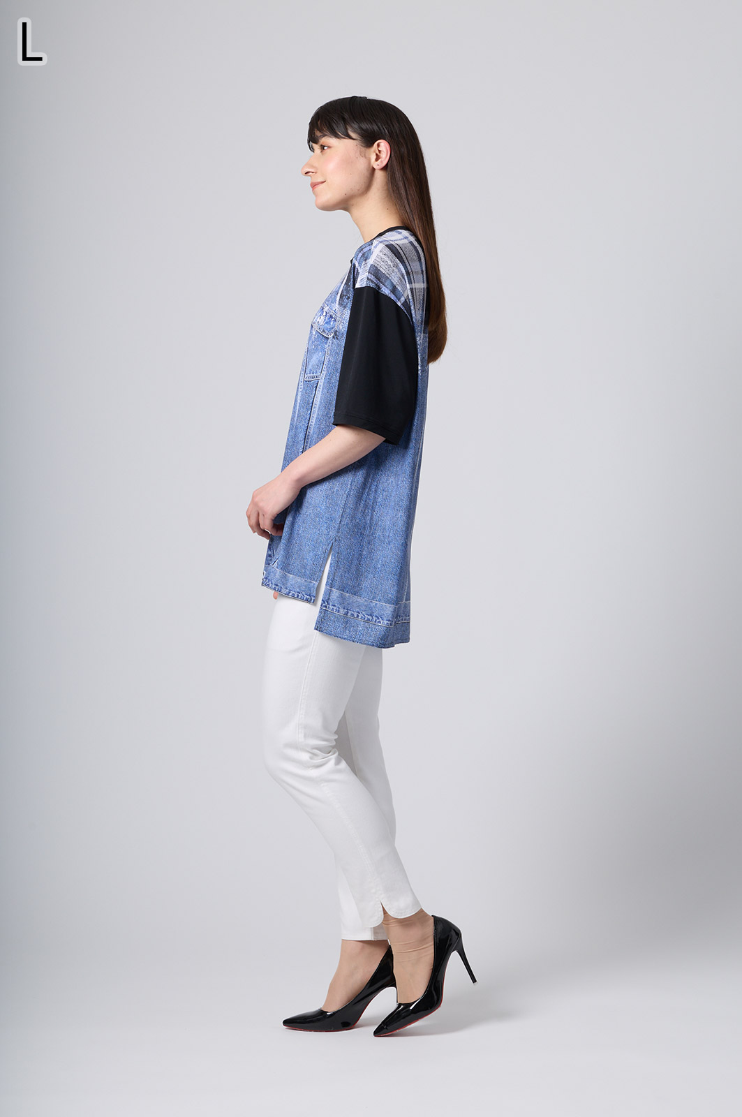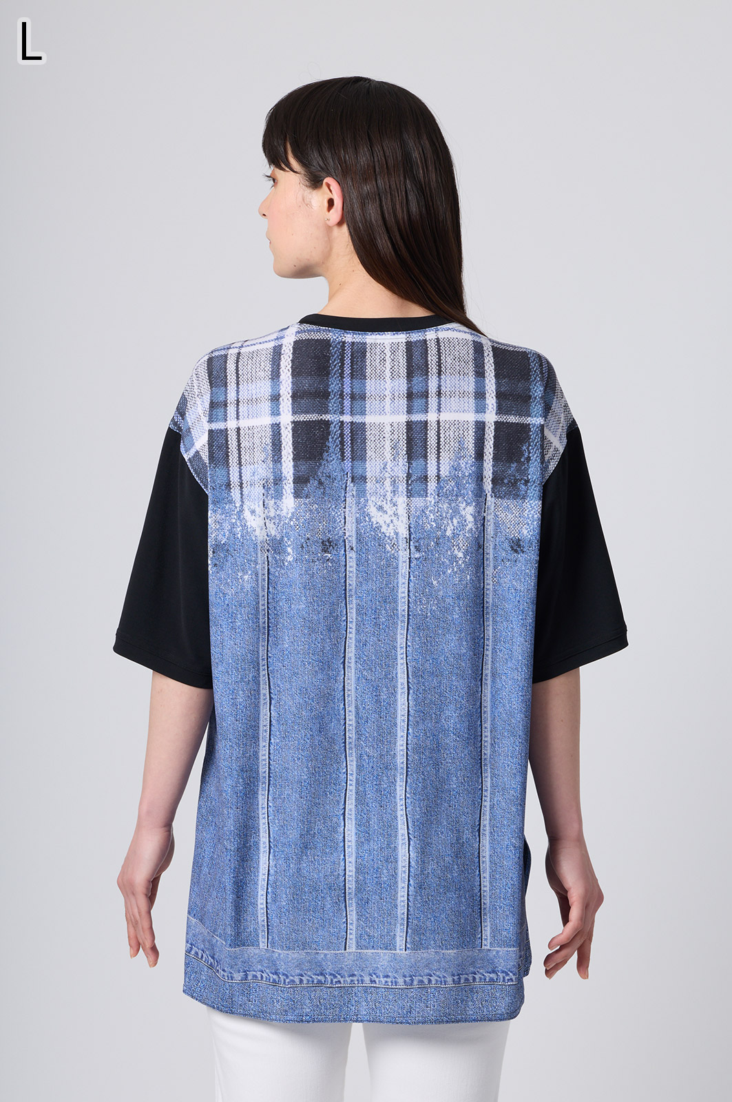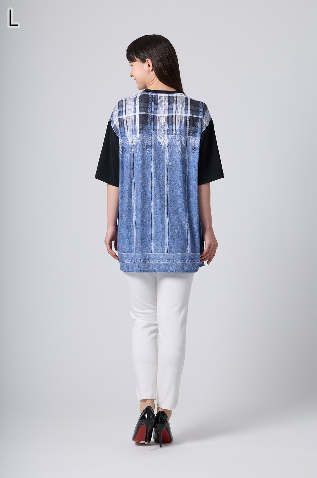 ストレッチ性抜群の2way素材で快適な着心地を実現。Gジャン風プリントとチェック柄プリントの組み合わせが新鮮で個性的。お尻が隠れるBigシルエットで体型カバーにも最適なデザインです。カジュアルながらスタイリッシュな一着に仕上げました。