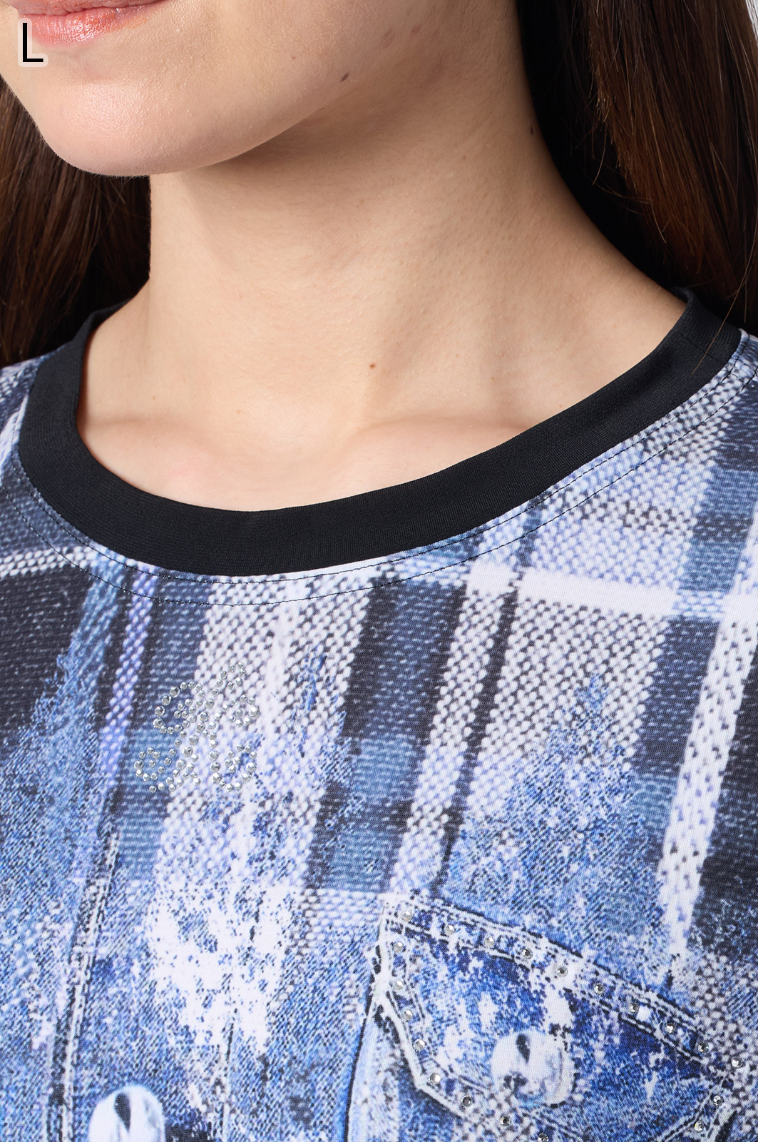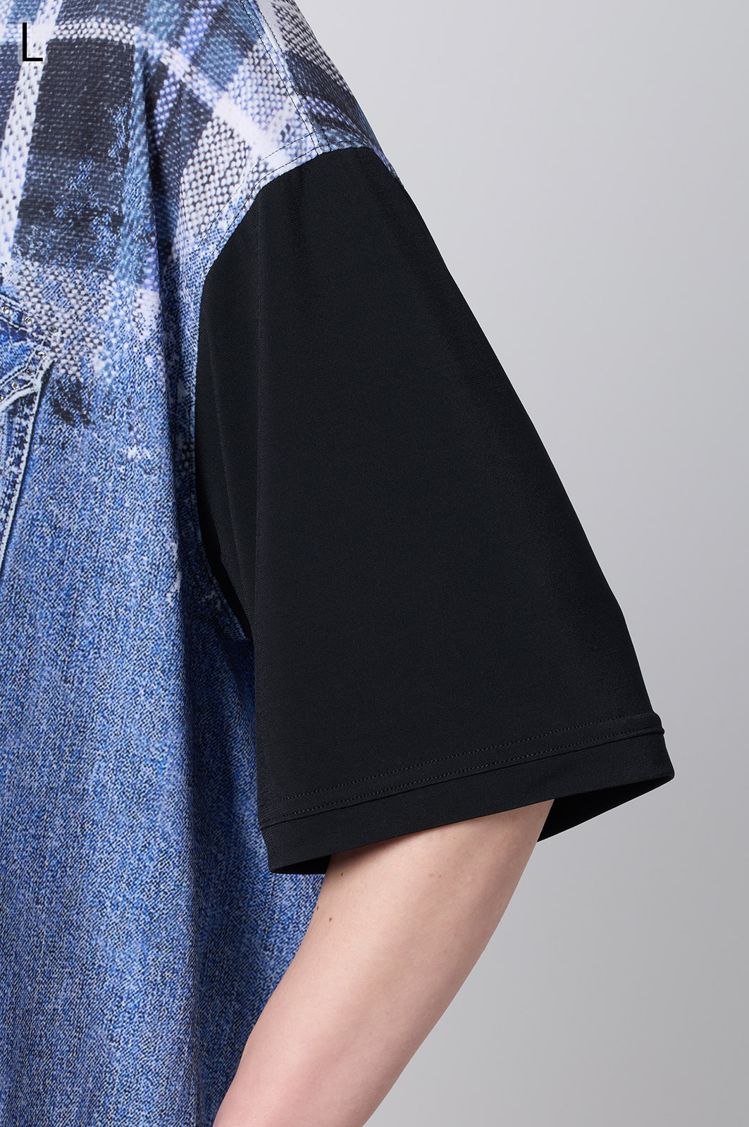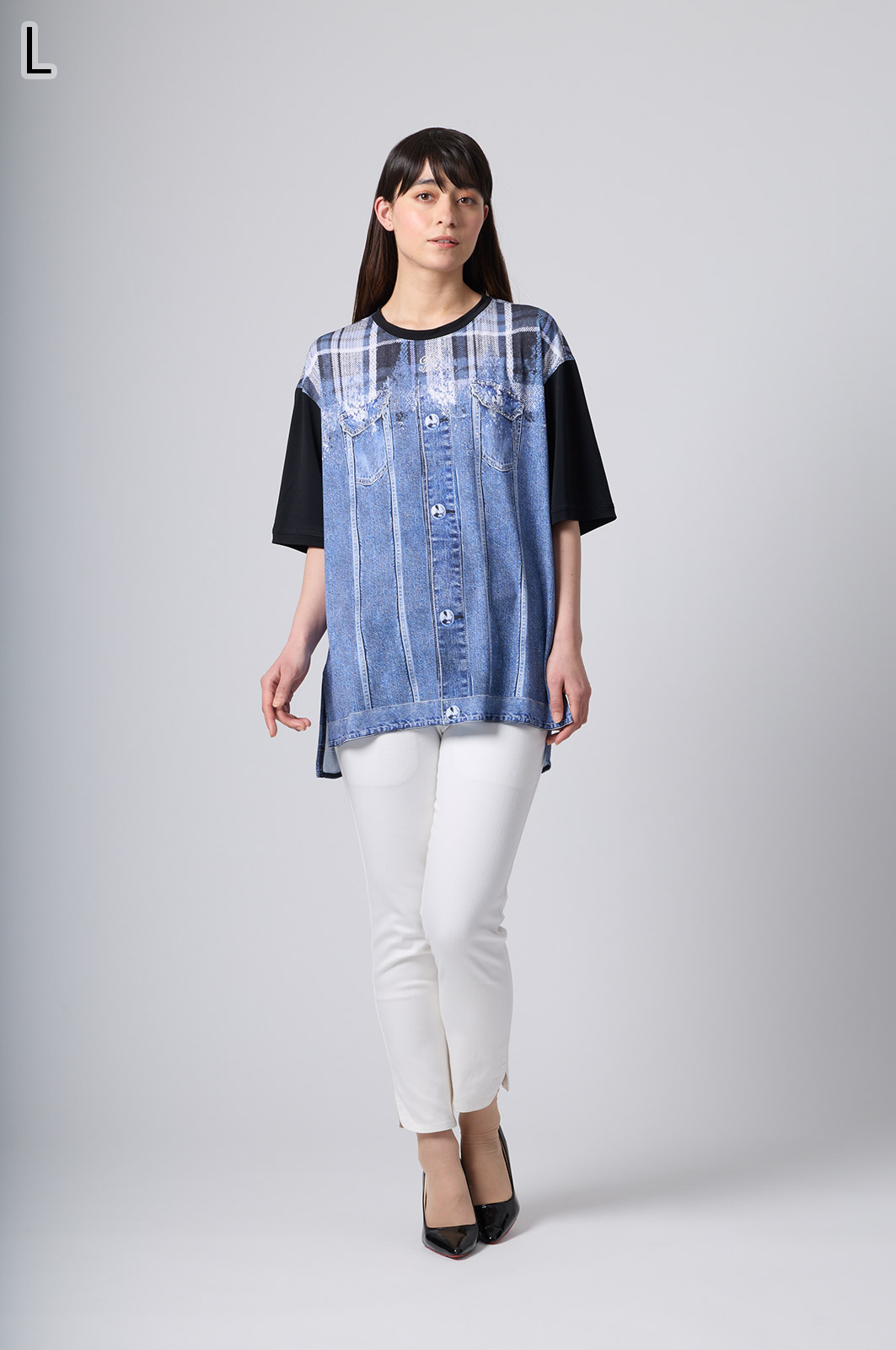 ストレッチ性抜群の2way素材で快適な着心地を実現。Gジャン風プリントとチェック柄プリントの組み合わせが新鮮で個性的。お尻が隠れるBigシルエットで体型カバーにも最適なデザインです。カジュアルながらスタイリッシュな一着に仕上げました。