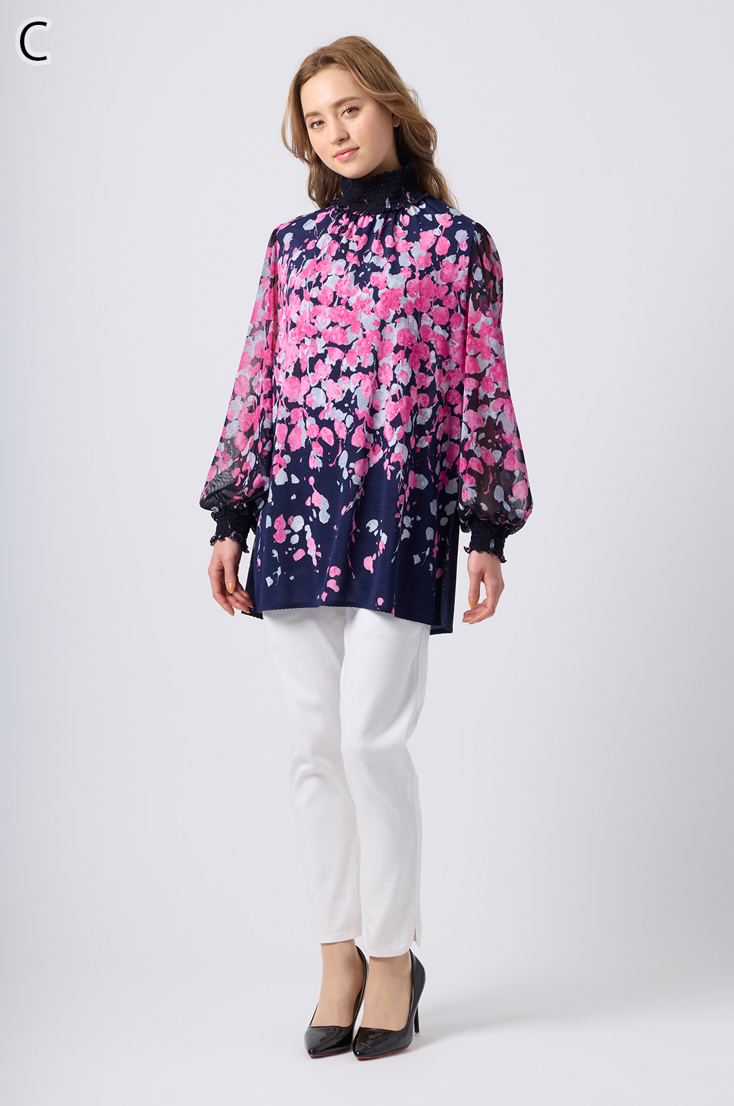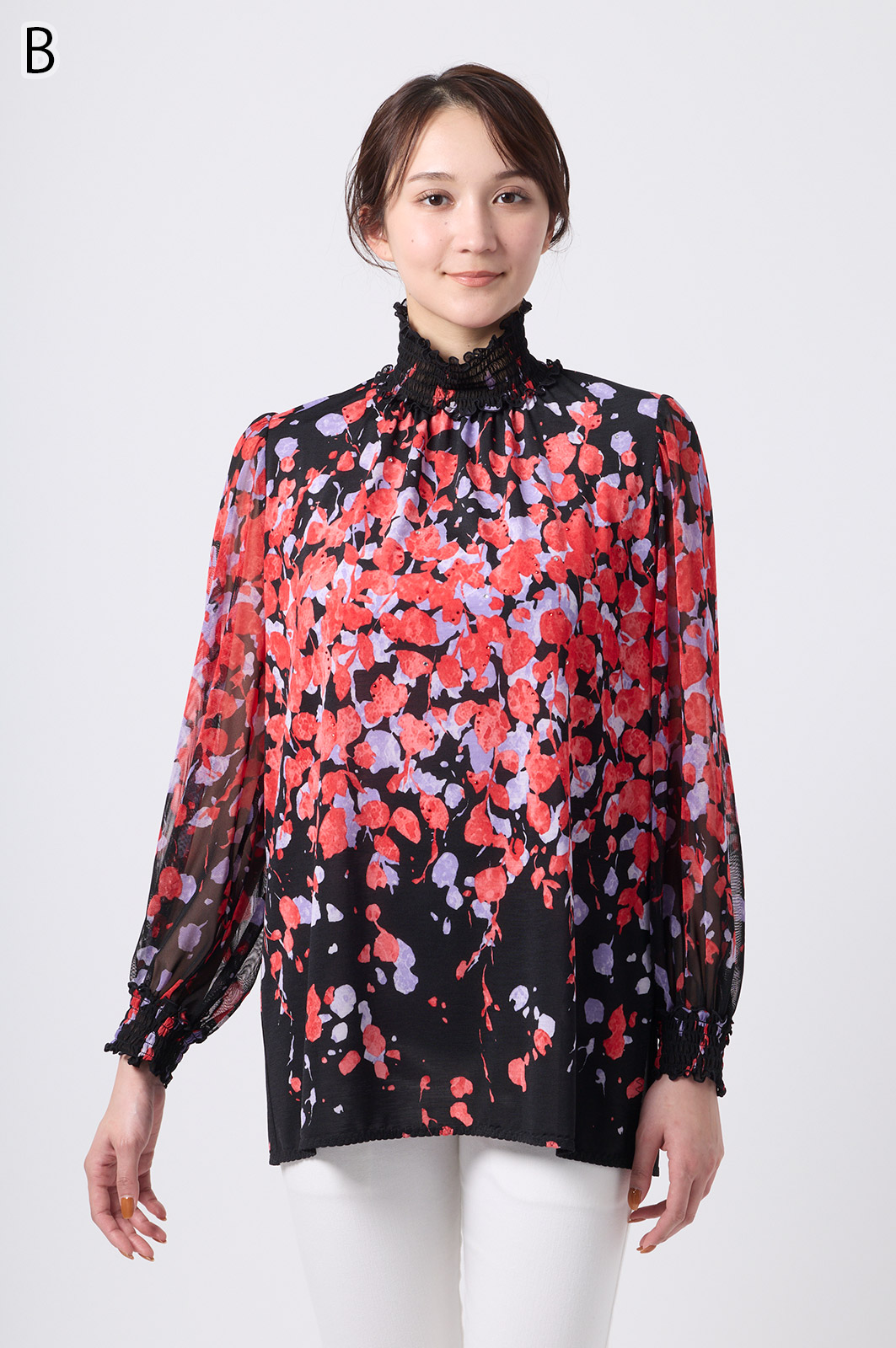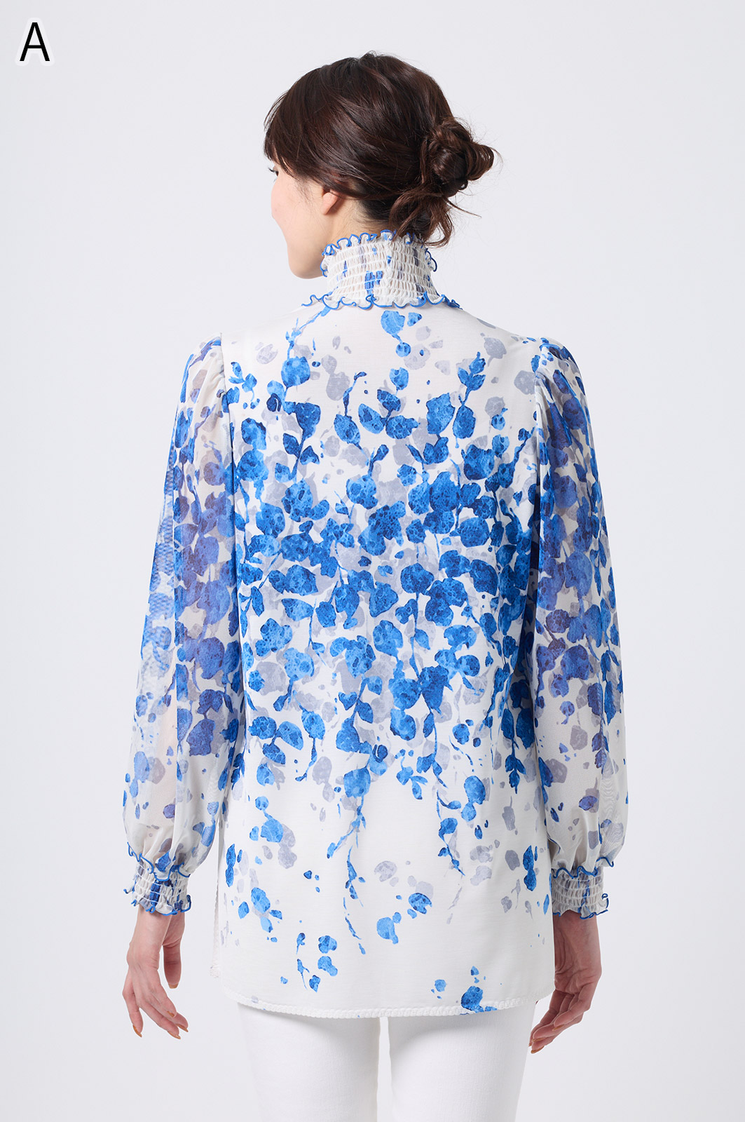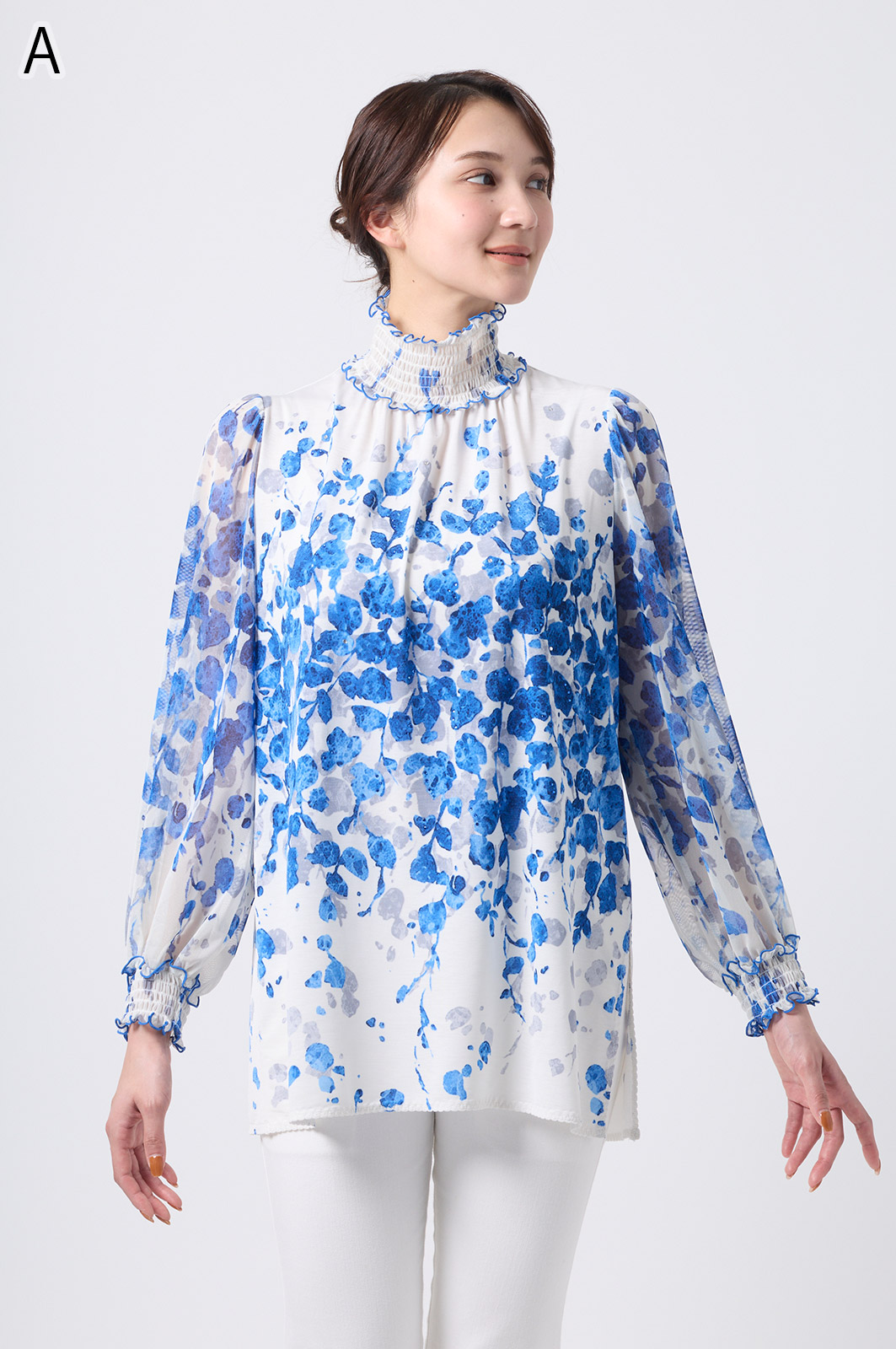 伸縮性のある同プリントのジャージ×メッシュ素材が特徴のAライントップス。体型をカバーするゆったりシルエットに加え、たっぷりギャザーのパフスリーブが華やかさを演出。袖口と衿のシャーリング加工でフェミニンな仕上がりに。