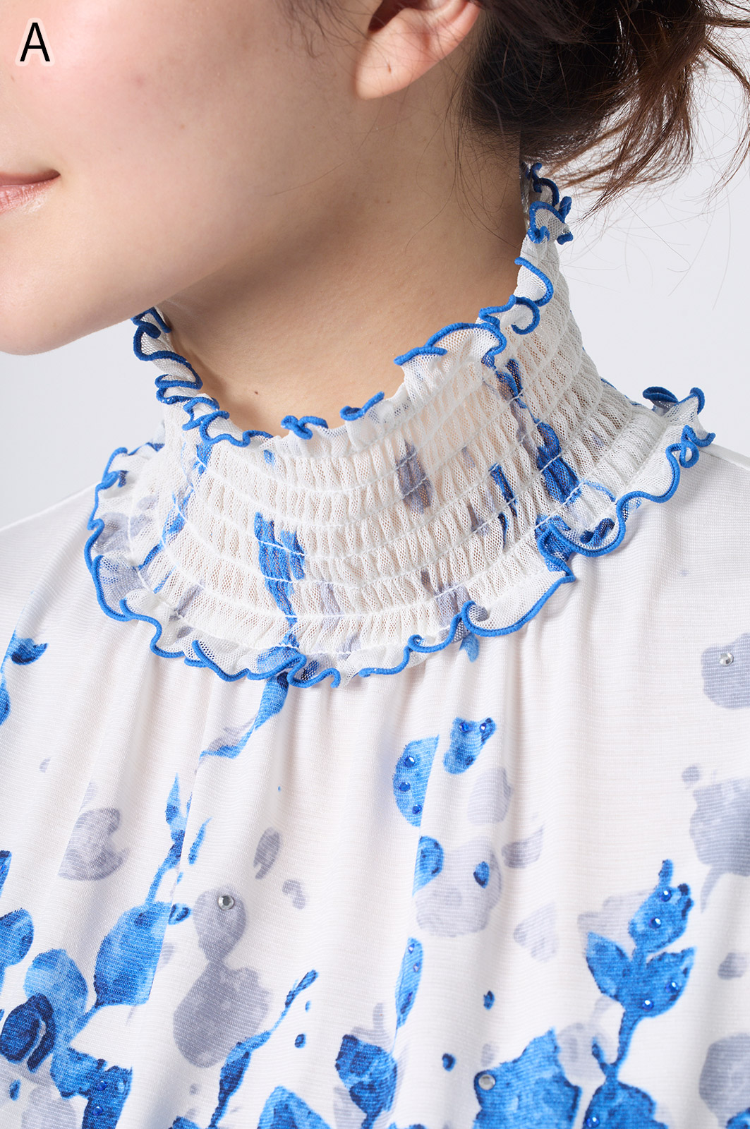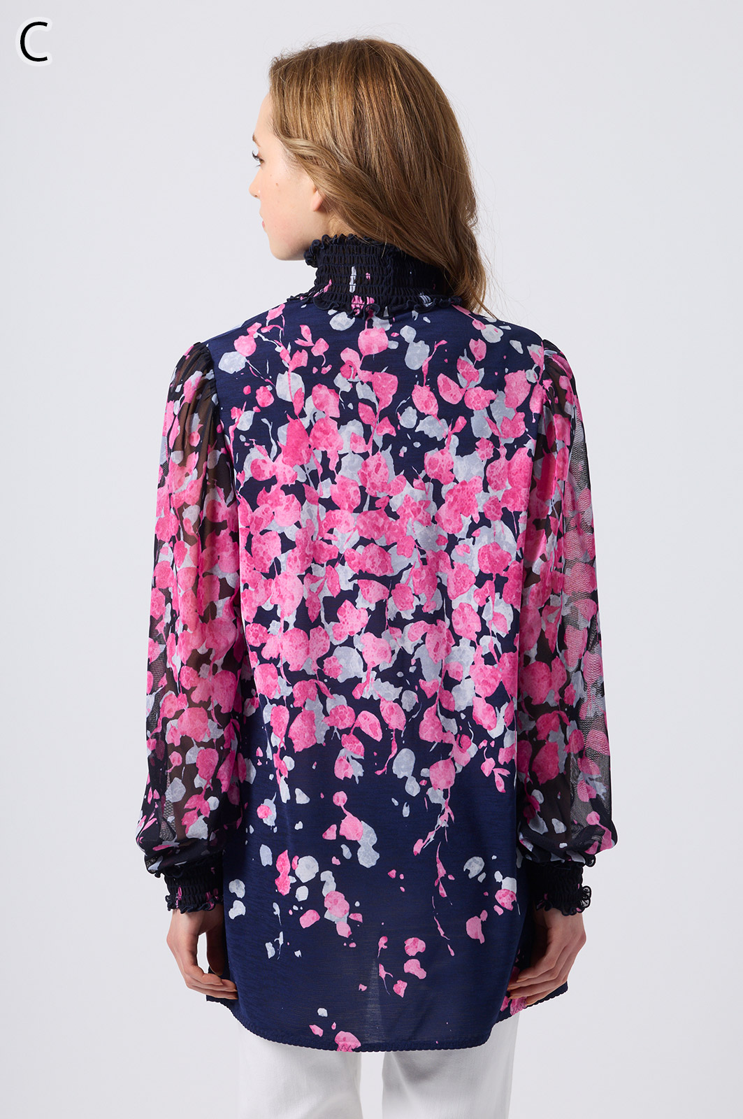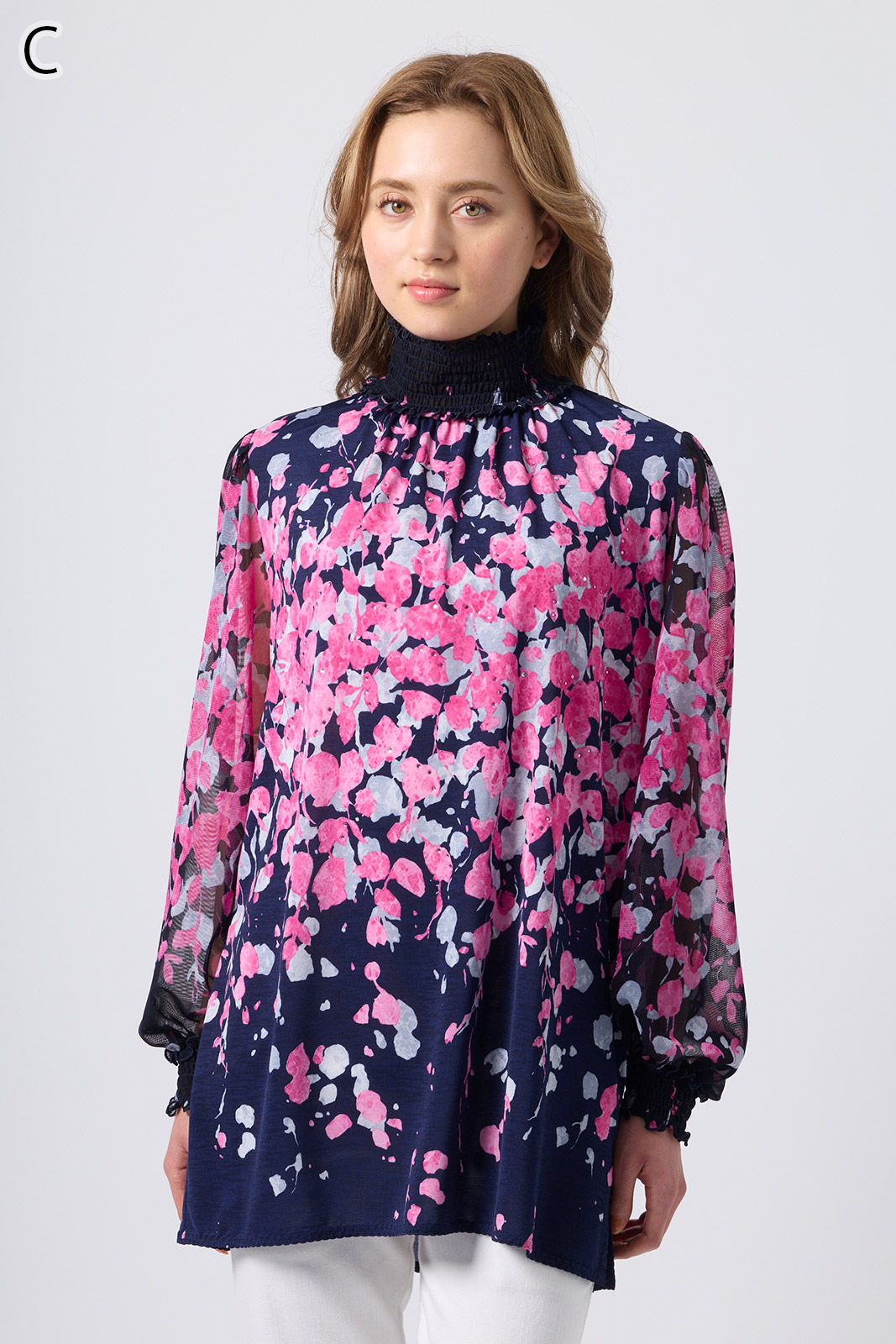 伸縮性のある同プリントのジャージ×メッシュ素材が特徴のAライントップス。体型をカバーするゆったりシルエットに加え、たっぷりギャザーのパフスリーブが華やかさを演出。袖口と衿のシャーリング加工でフェミニンな仕上がりに。