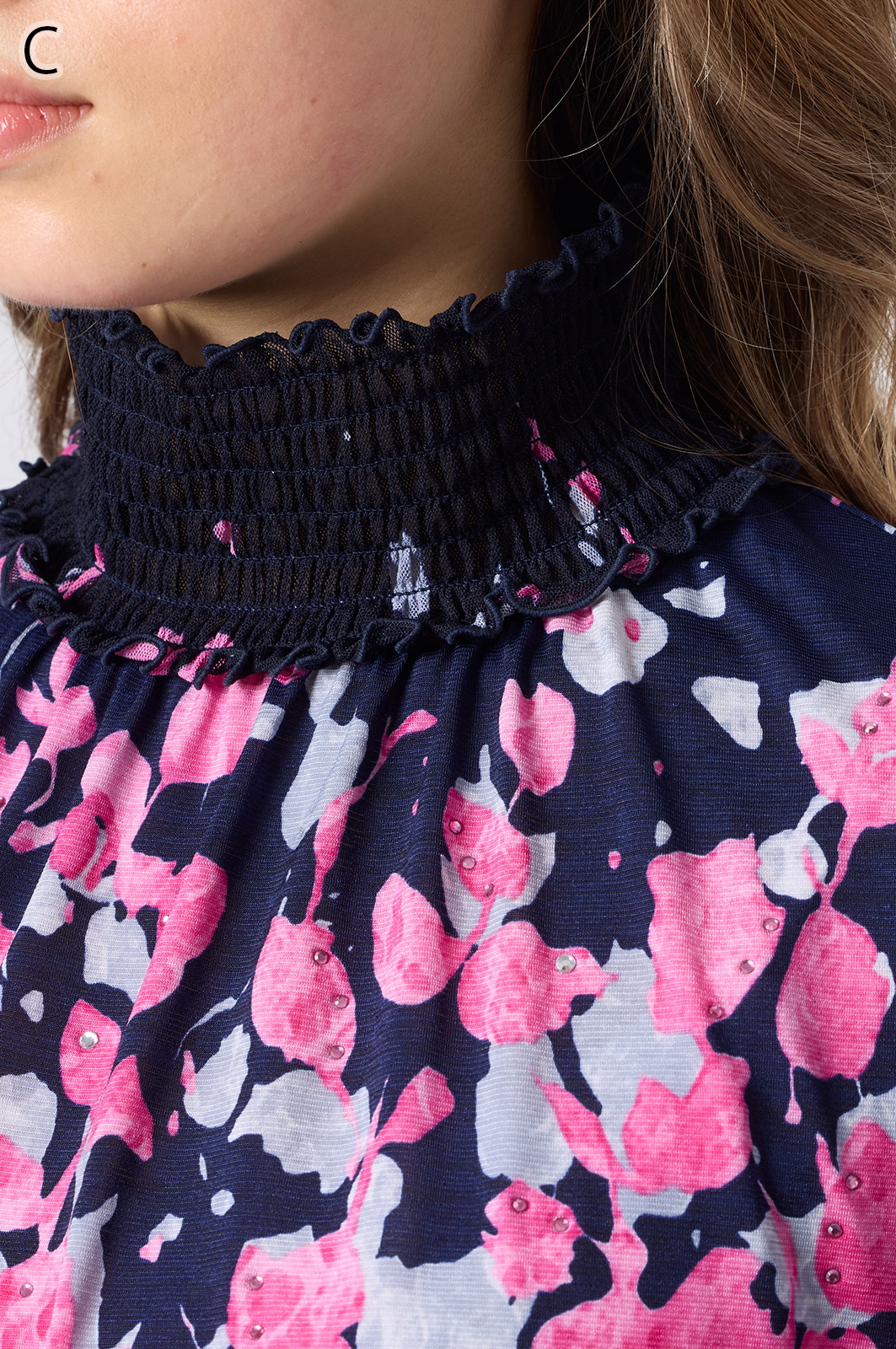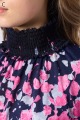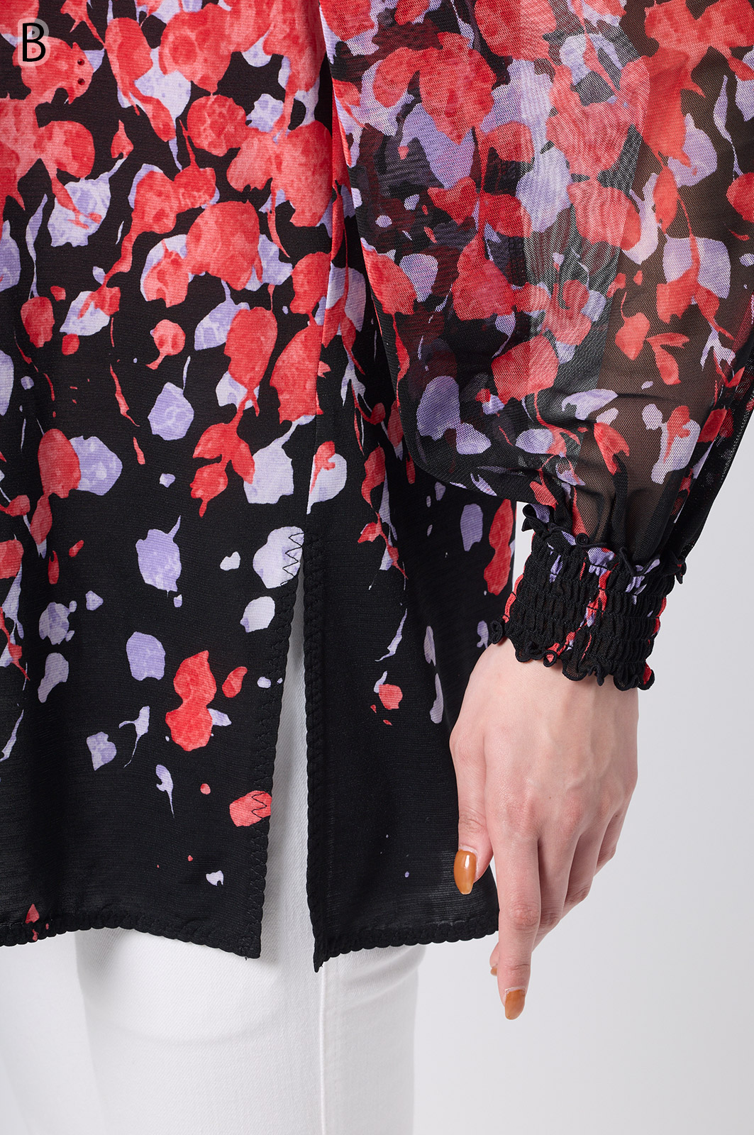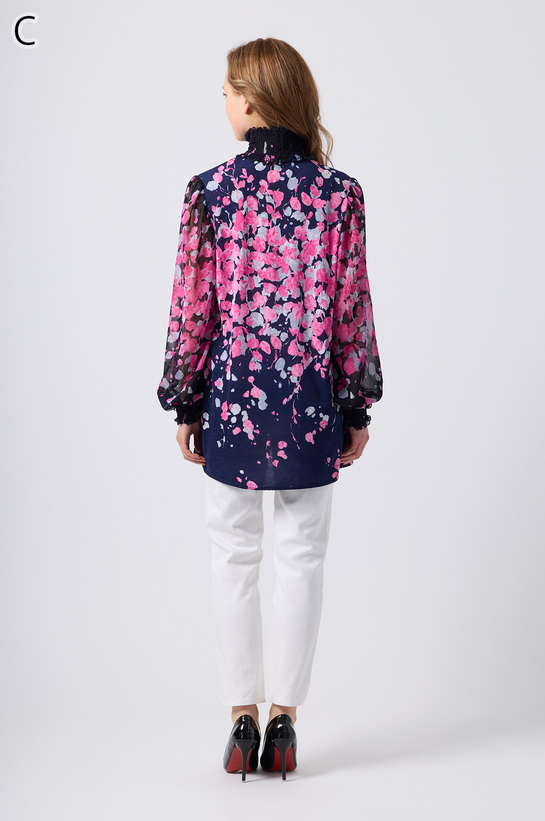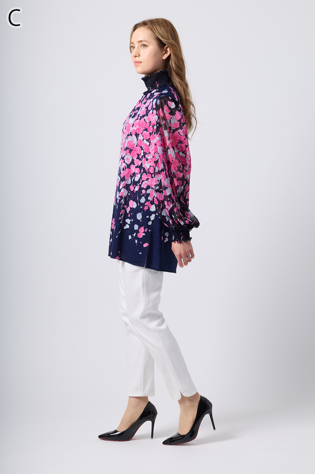 伸縮性のある同プリントのジャージ×メッシュ素材が特徴のAライントップス。体型をカバーするゆったりシルエットに加え、たっぷりギャザーのパフスリーブが華やかさを演出。袖口と衿のシャーリング加工でフェミニンな仕上がりに。