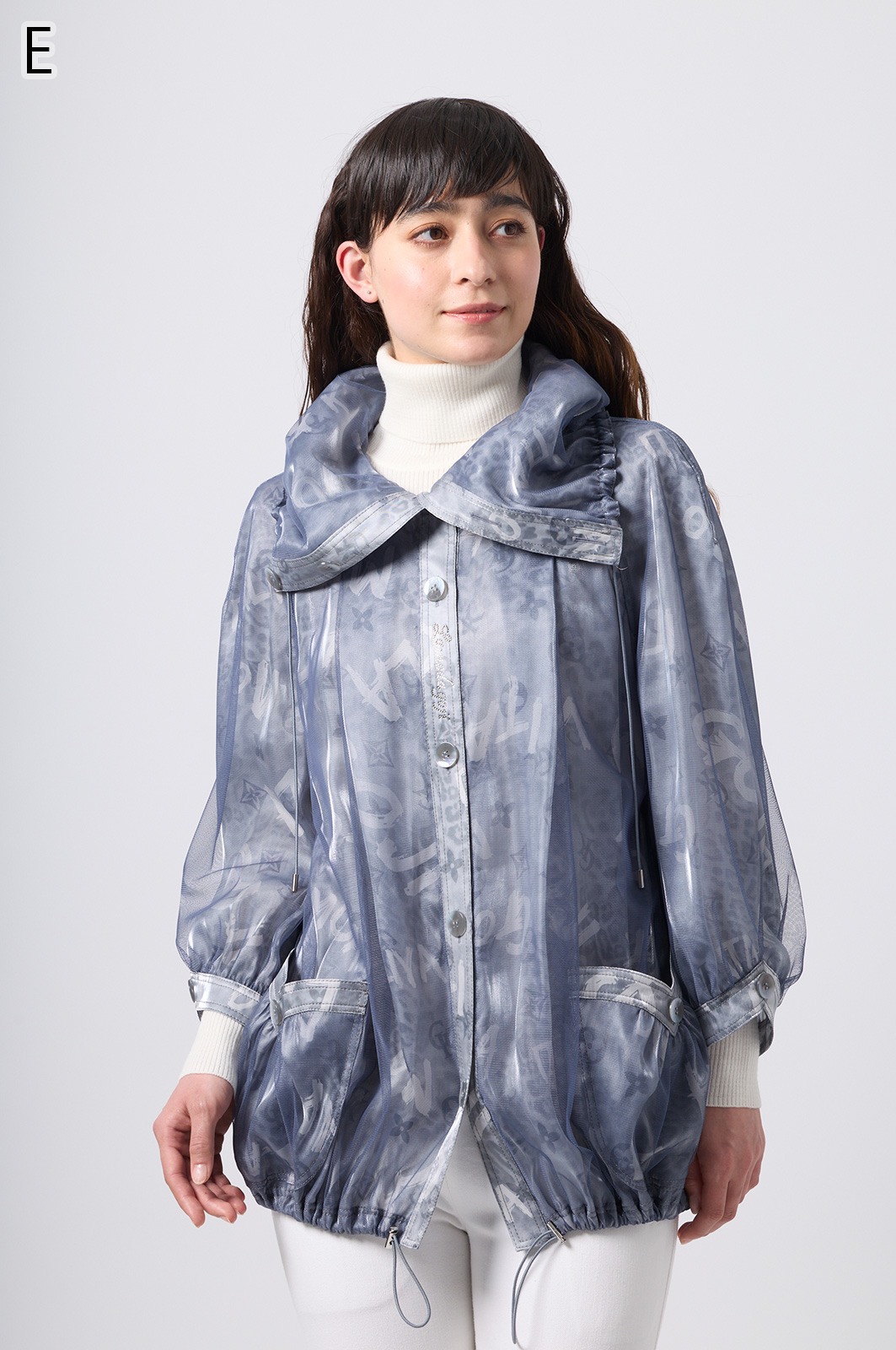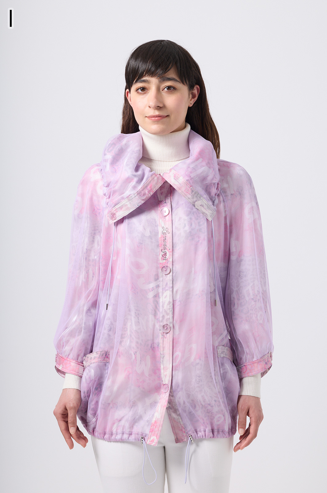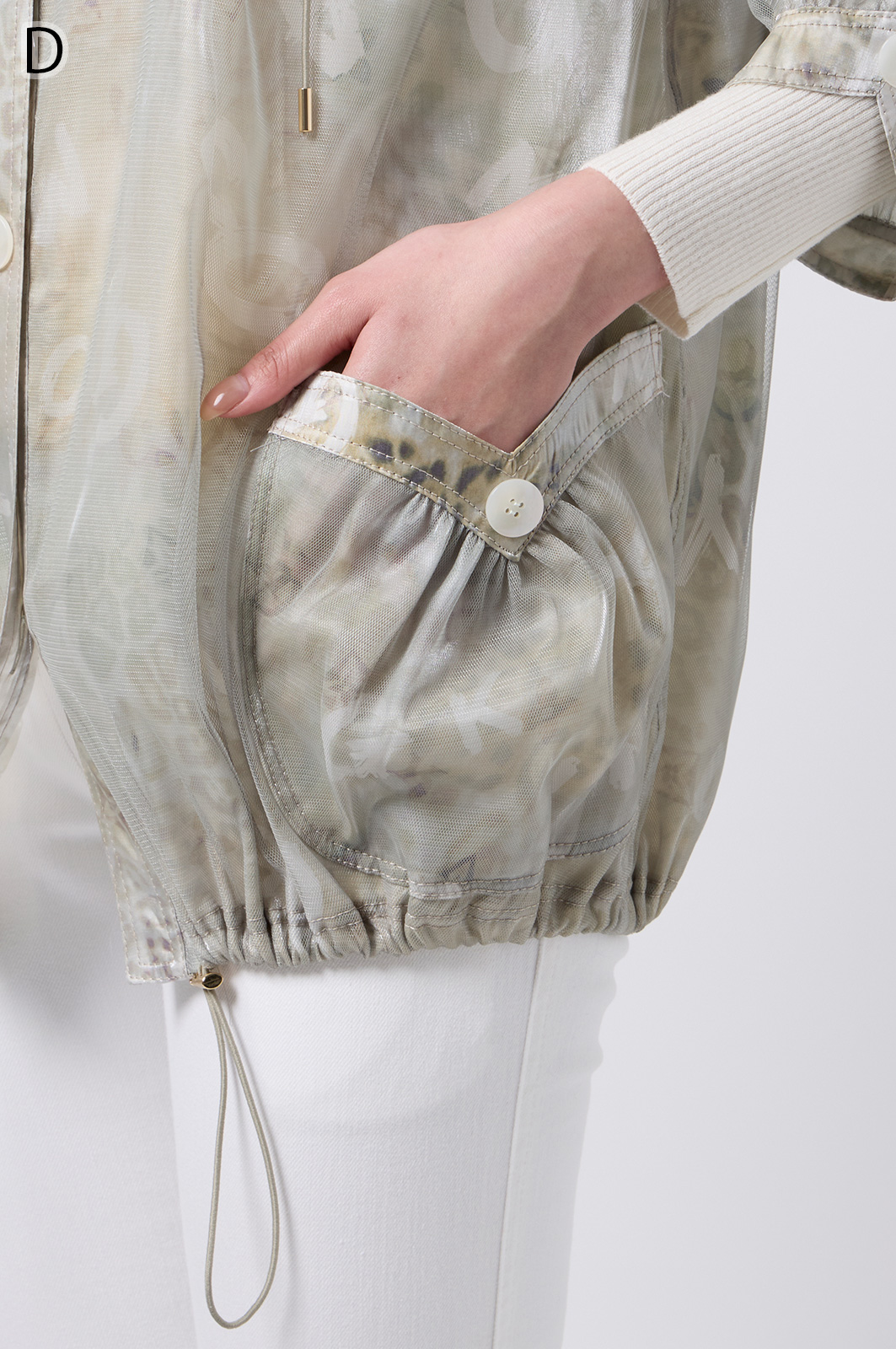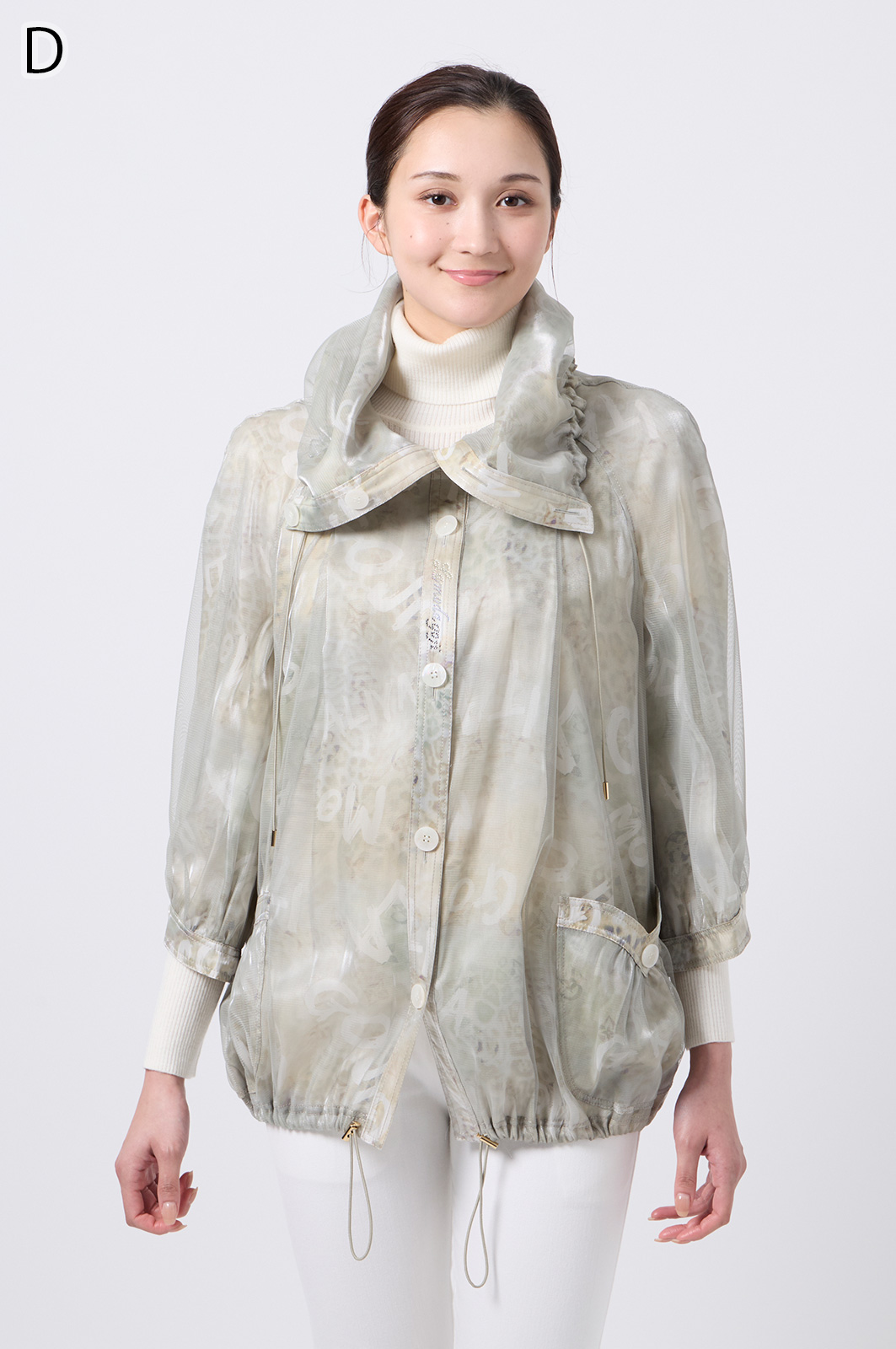 オリジナルプリントをスパーク生地にのせた華やかな素材を使用。スパークプリントにメッシュを重ねた立体感あるデザインが魅力の羽織りジャケットで、上品な輝きと軽やかさを演出します。
