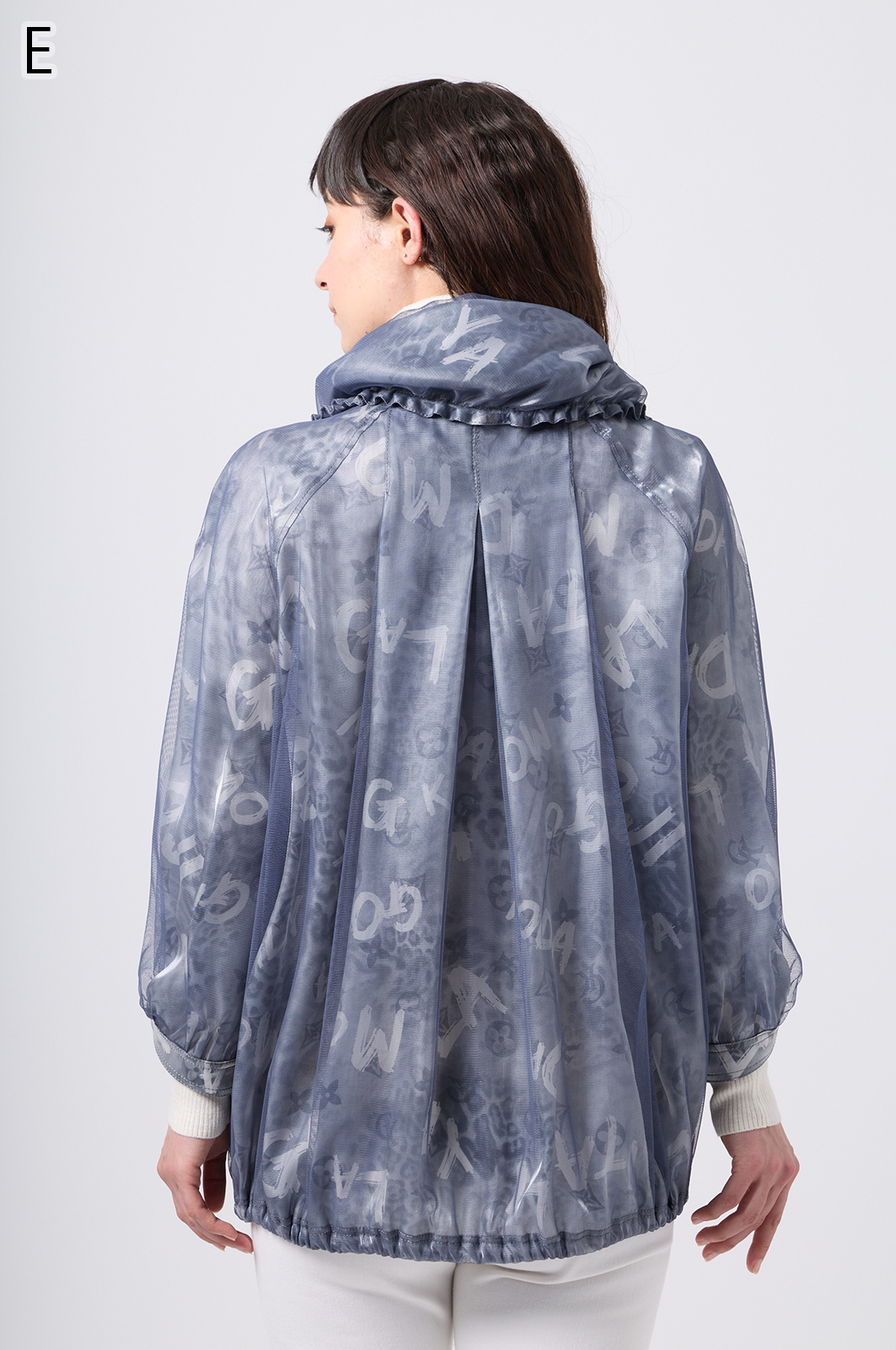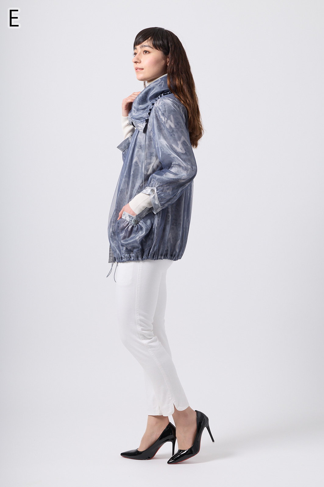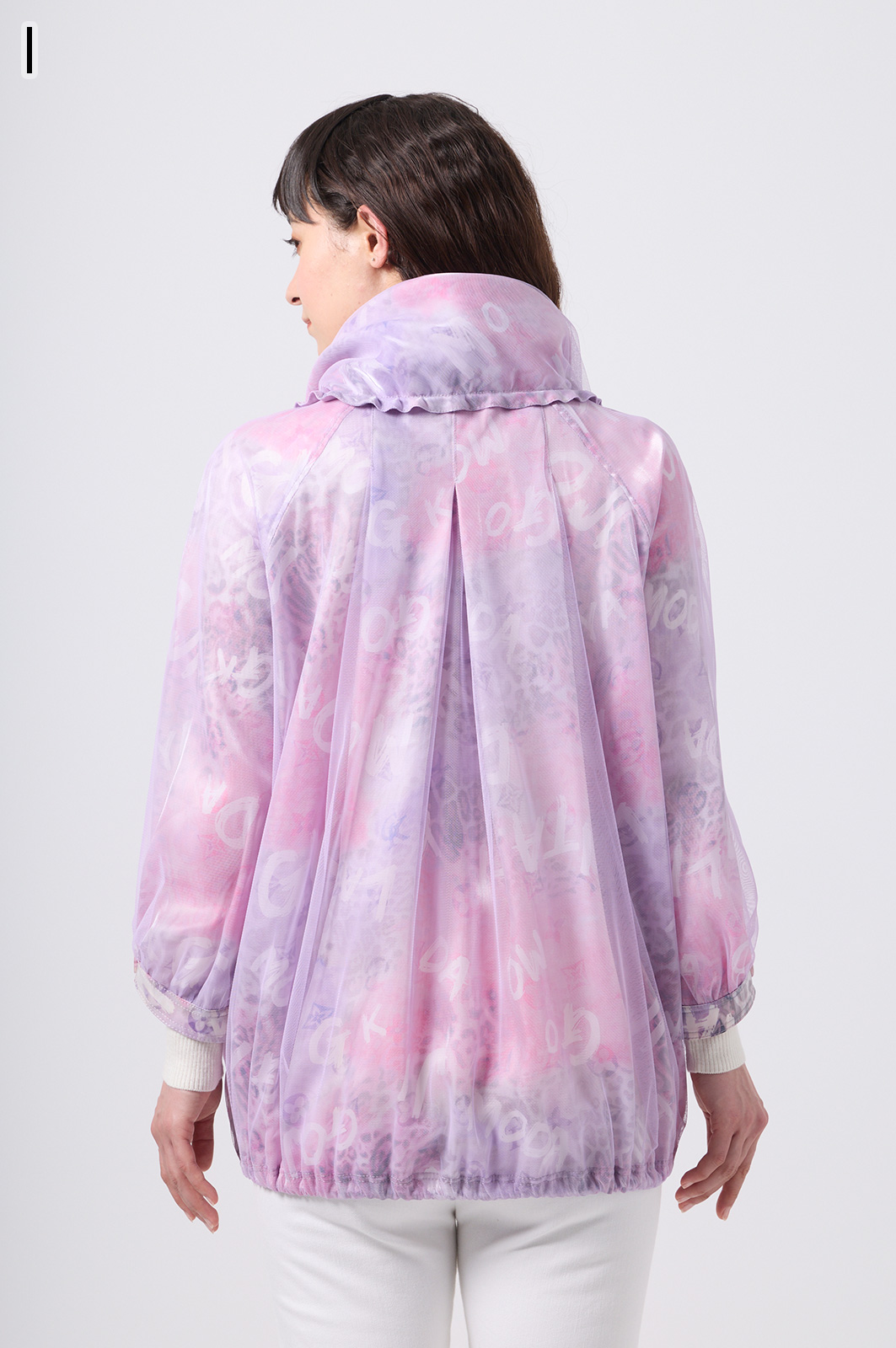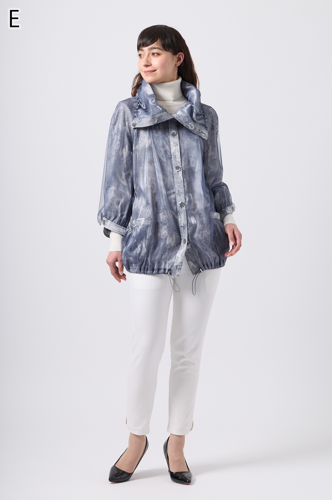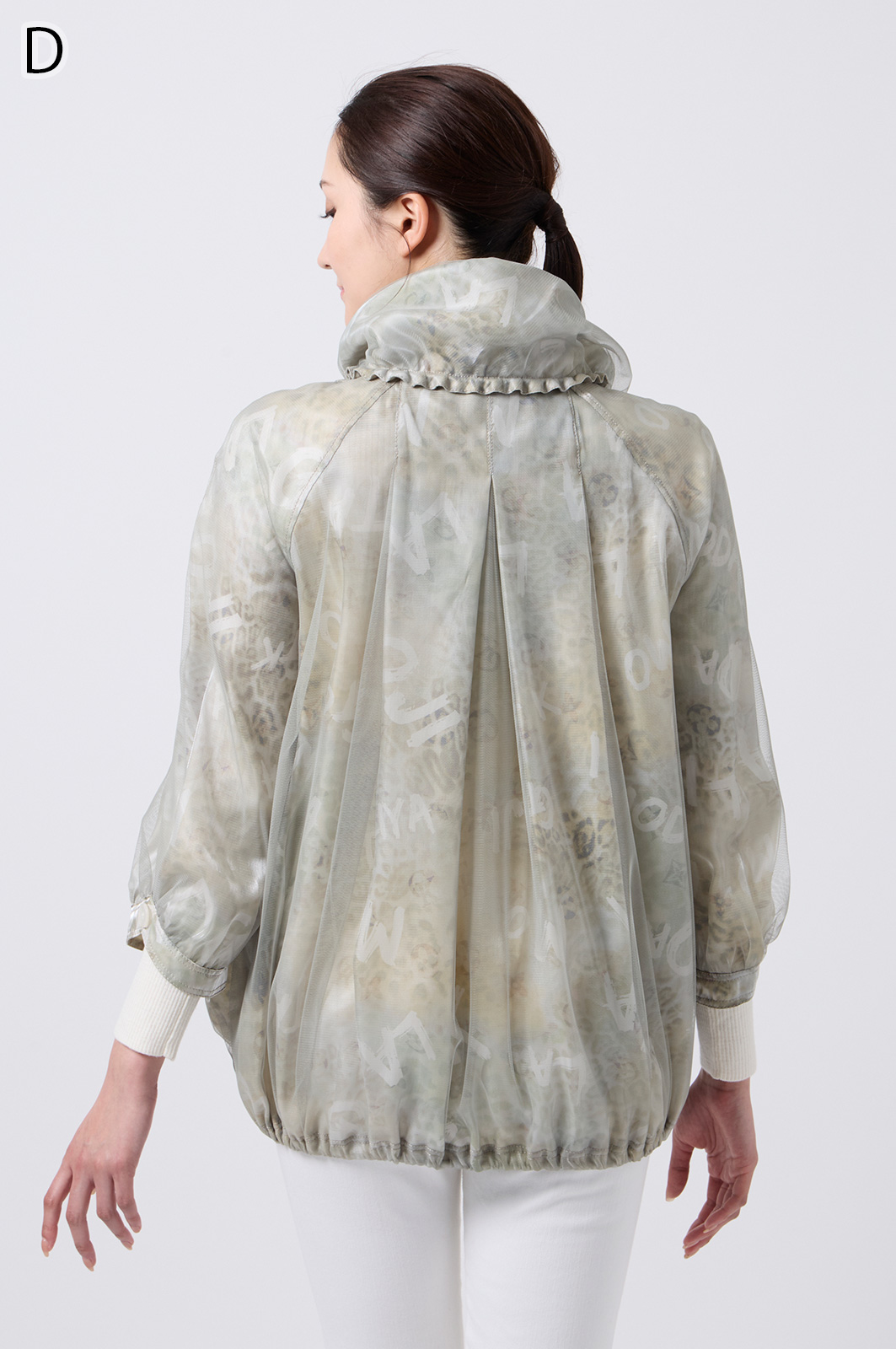 オリジナルプリントをスパーク生地にのせた華やかな素材を使用。スパークプリントにメッシュを重ねた立体感あるデザインが魅力の羽織りジャケットで、上品な輝きと軽やかさを演出します。