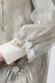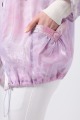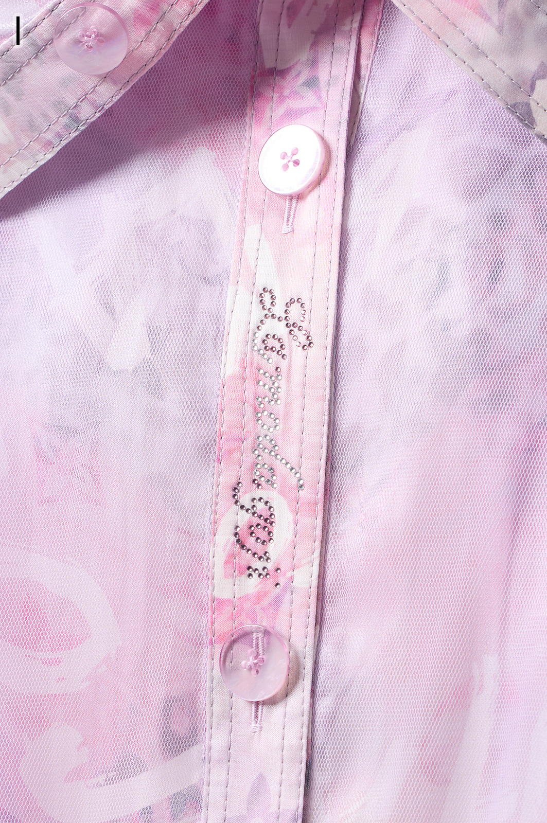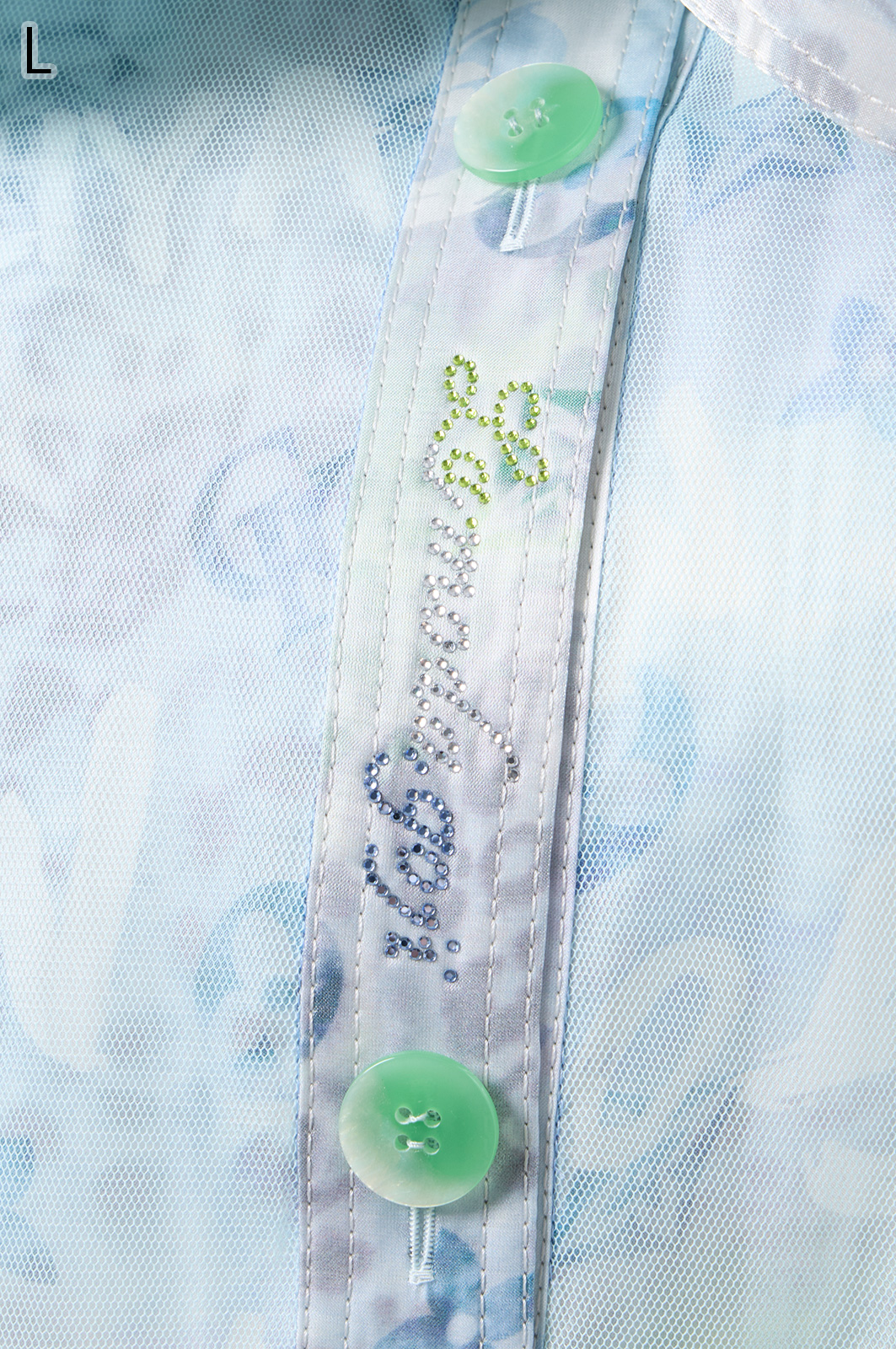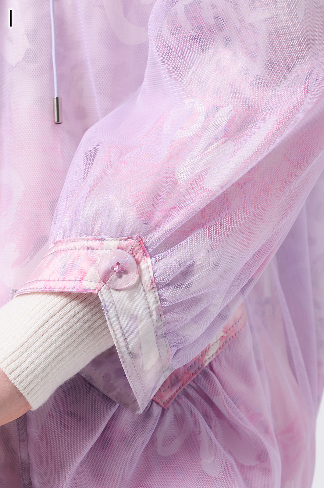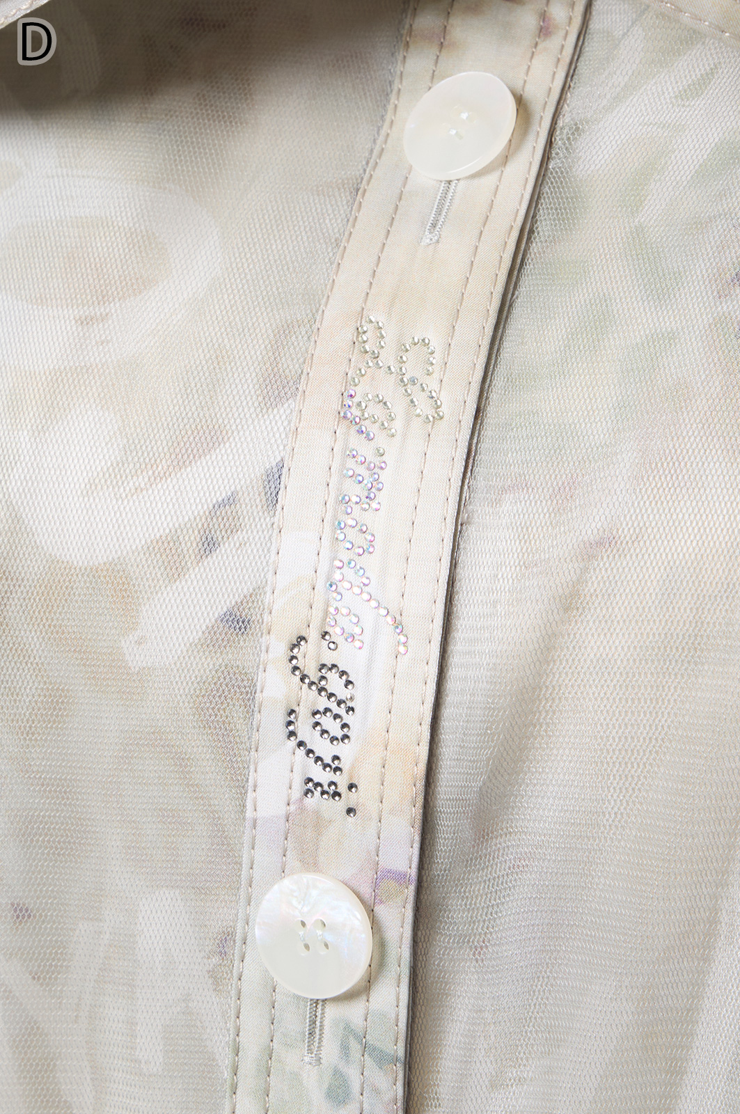 オリジナルプリントをスパーク生地にのせた華やかな素材を使用。スパークプリントにメッシュを重ねた立体感あるデザインが魅力の羽織りジャケットで、上品な輝きと軽やかさを演出します。
