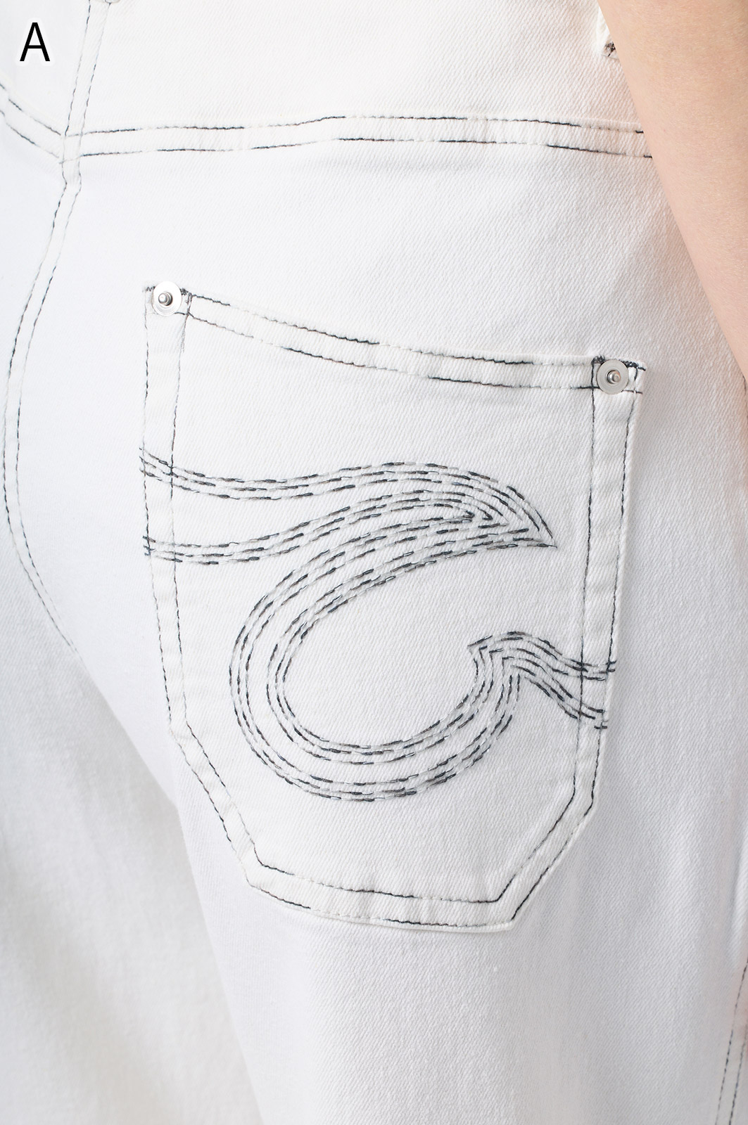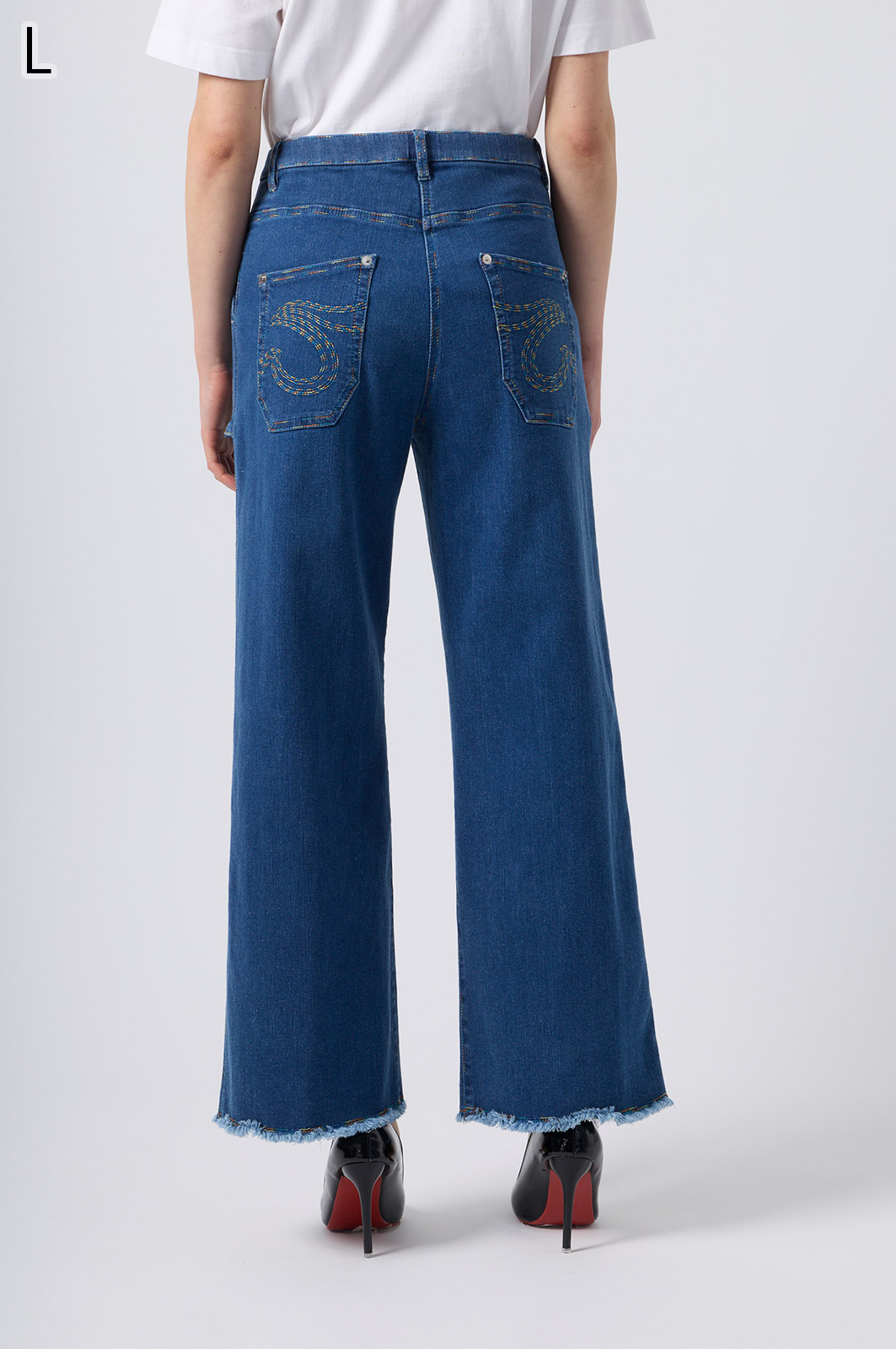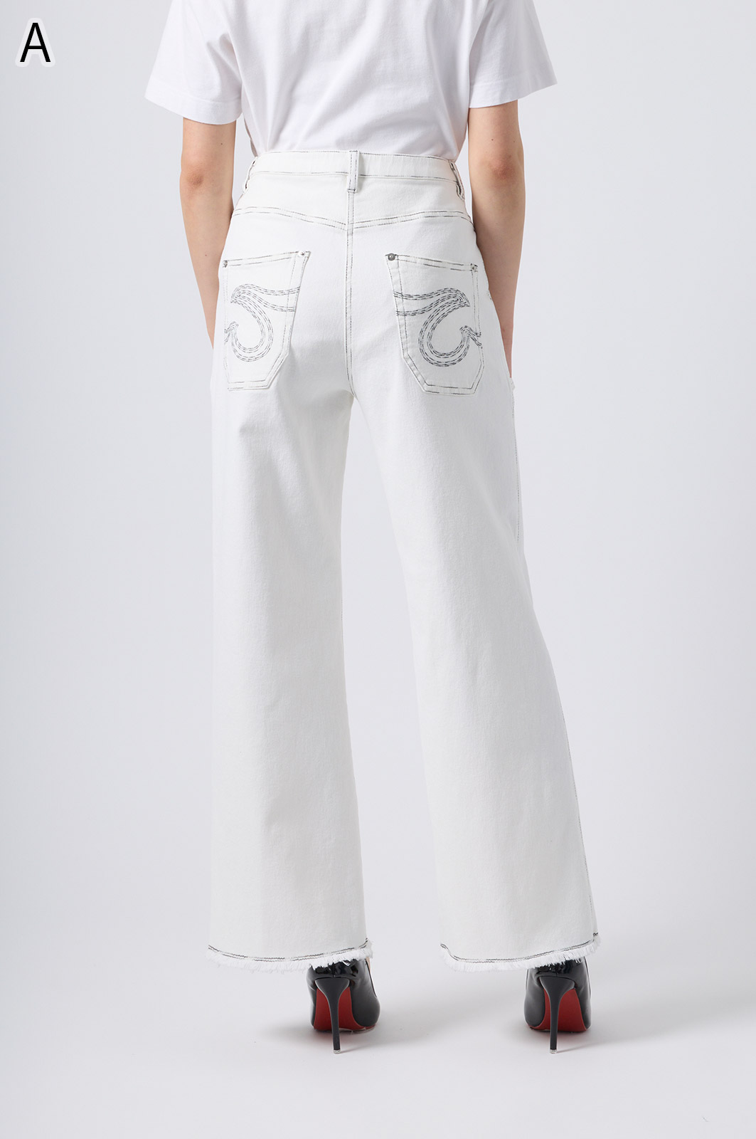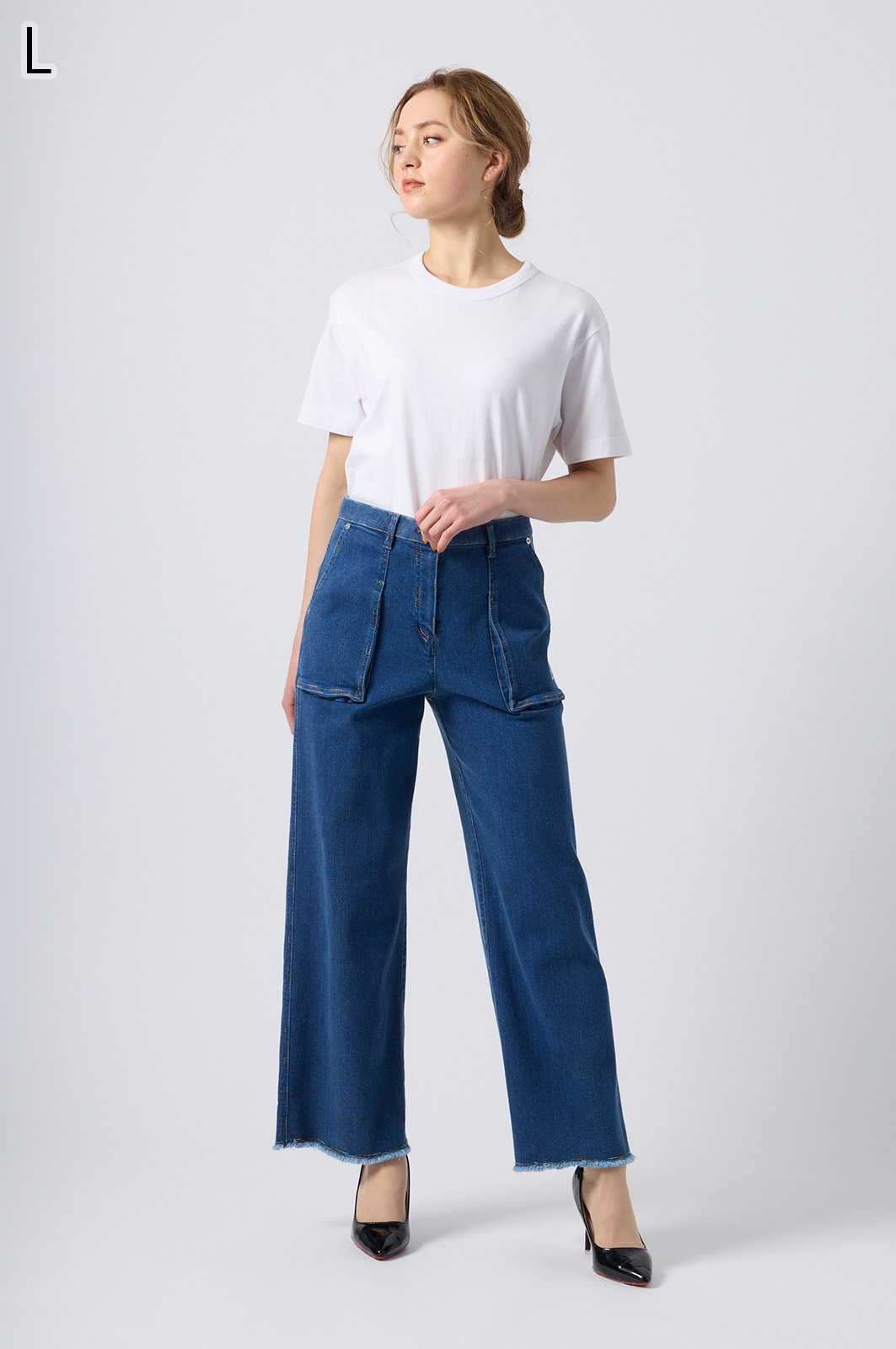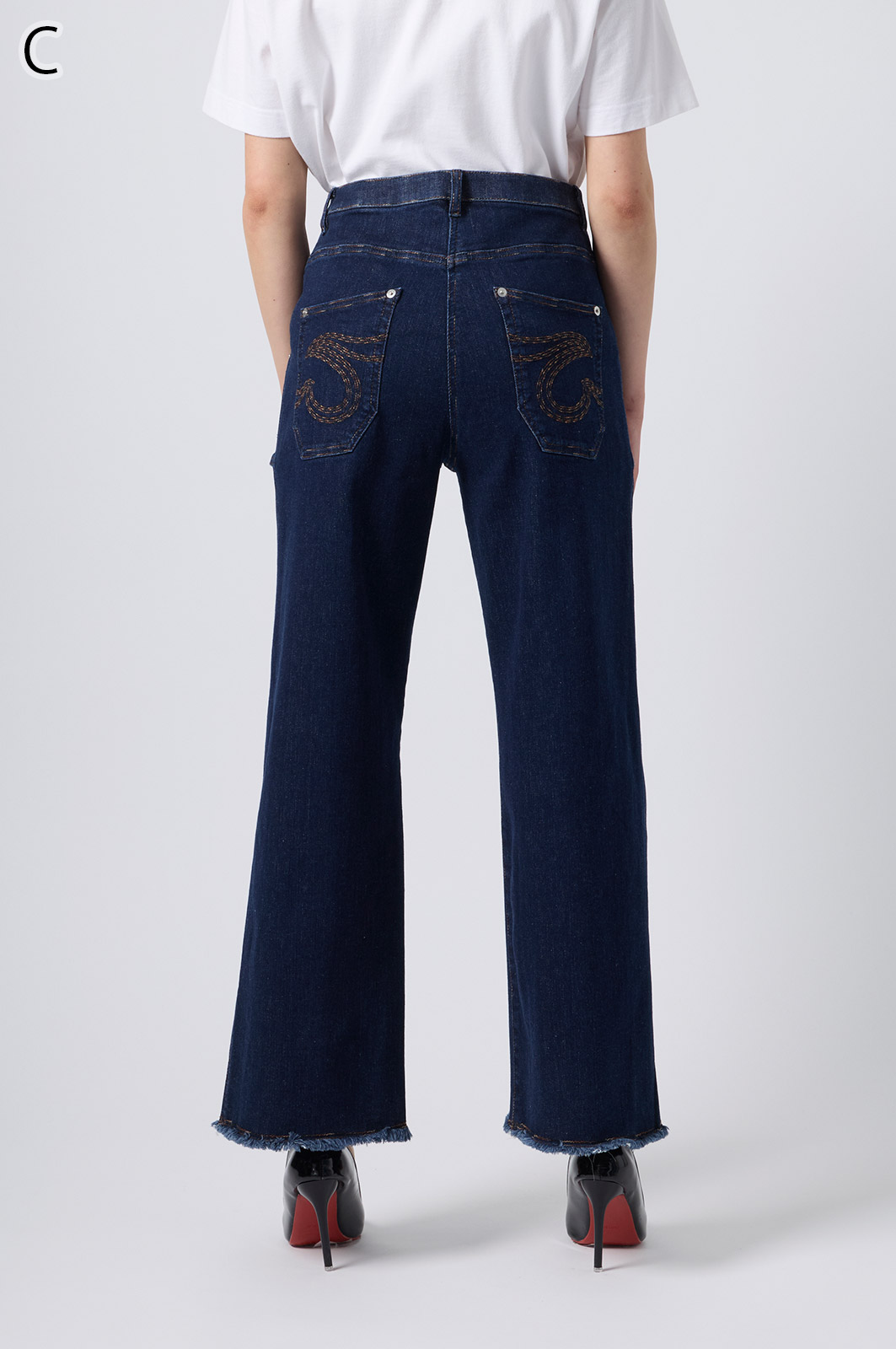 横ストレッチの効いたデニムが快適なバギーシルエットパンツ。ウエストゴム仕様でキックバックも良く、裾フリンジが個性的なアクセントに。前後の大きなポケットと全体に施されたミックスの太糸ステッチが魅力のデザインです。