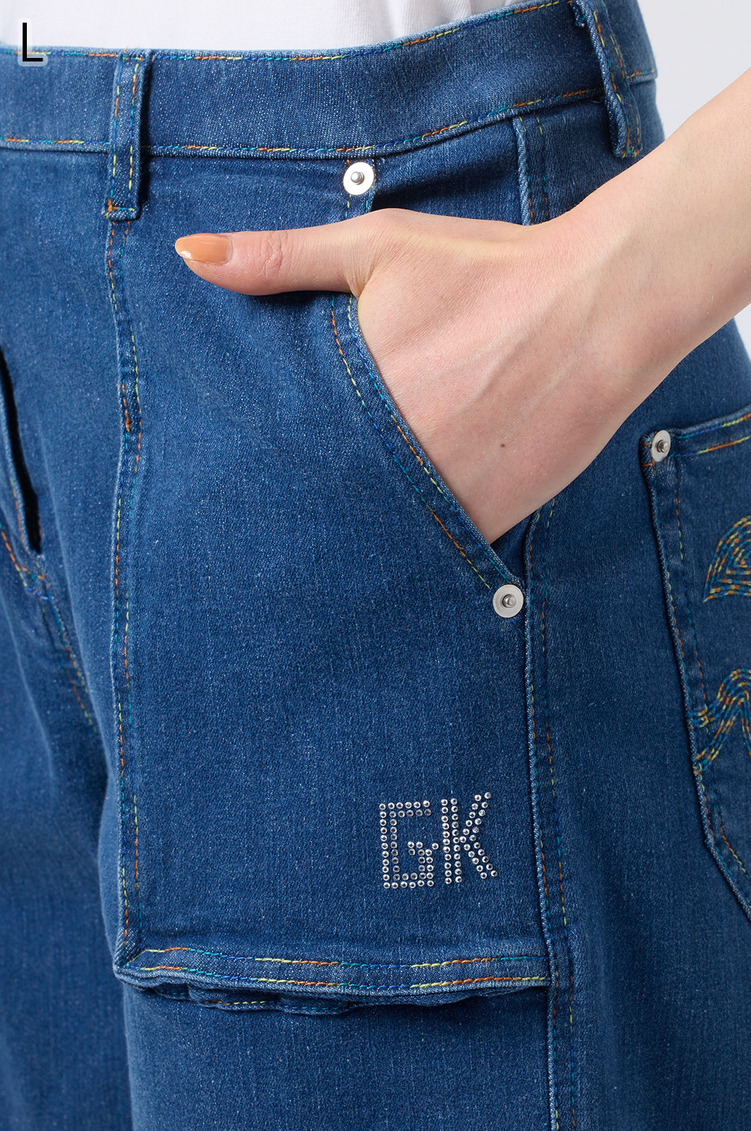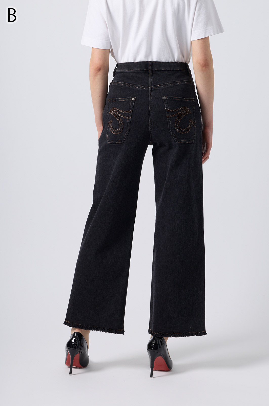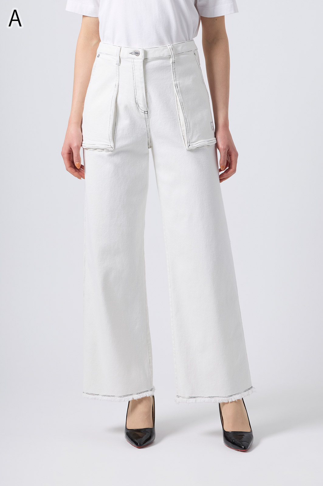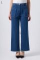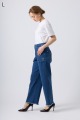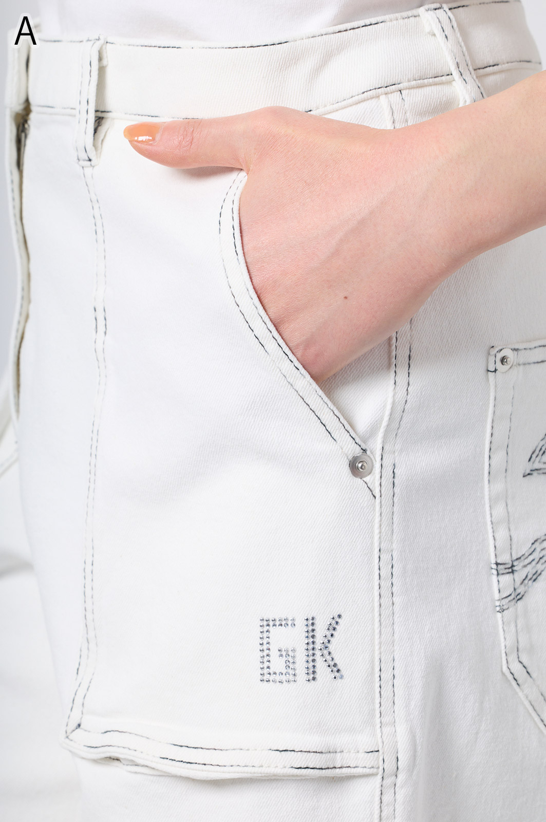横ストレッチの効いたデニムが快適なバギーシルエットパンツ。ウエストゴム仕様でキックバックも良く、裾フリンジが個性的なアクセントに。前後の大きなポケットと全体に施されたミックスの太糸ステッチが魅力のデザインです。