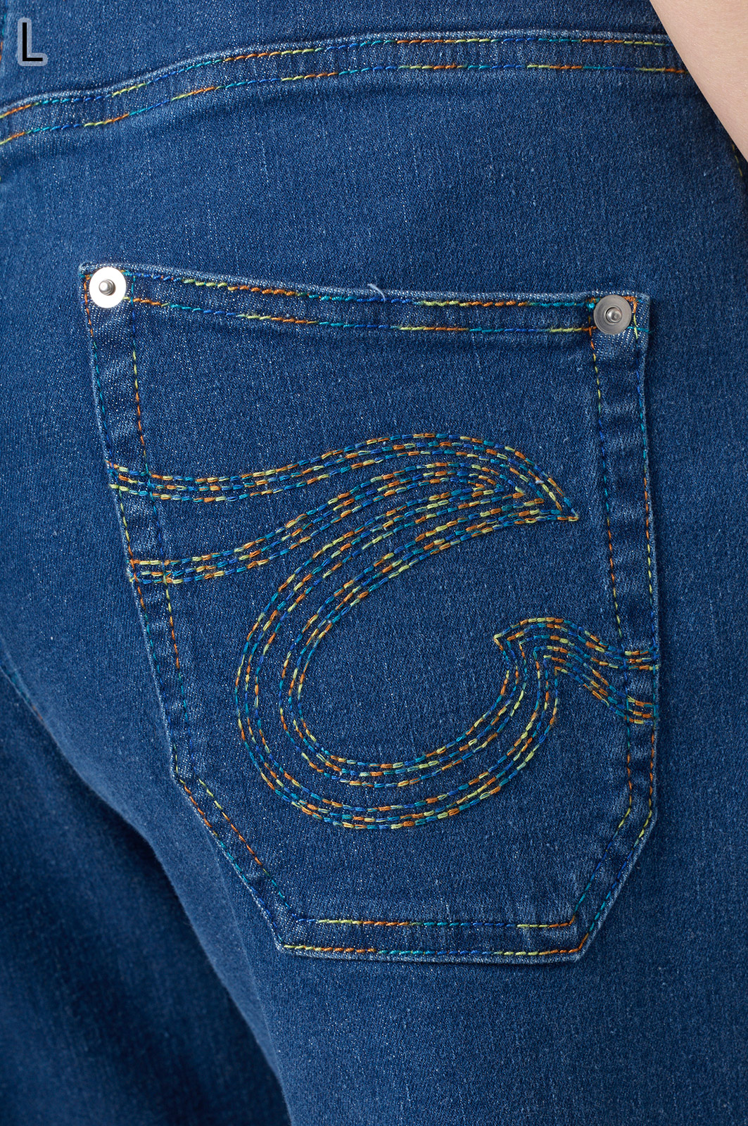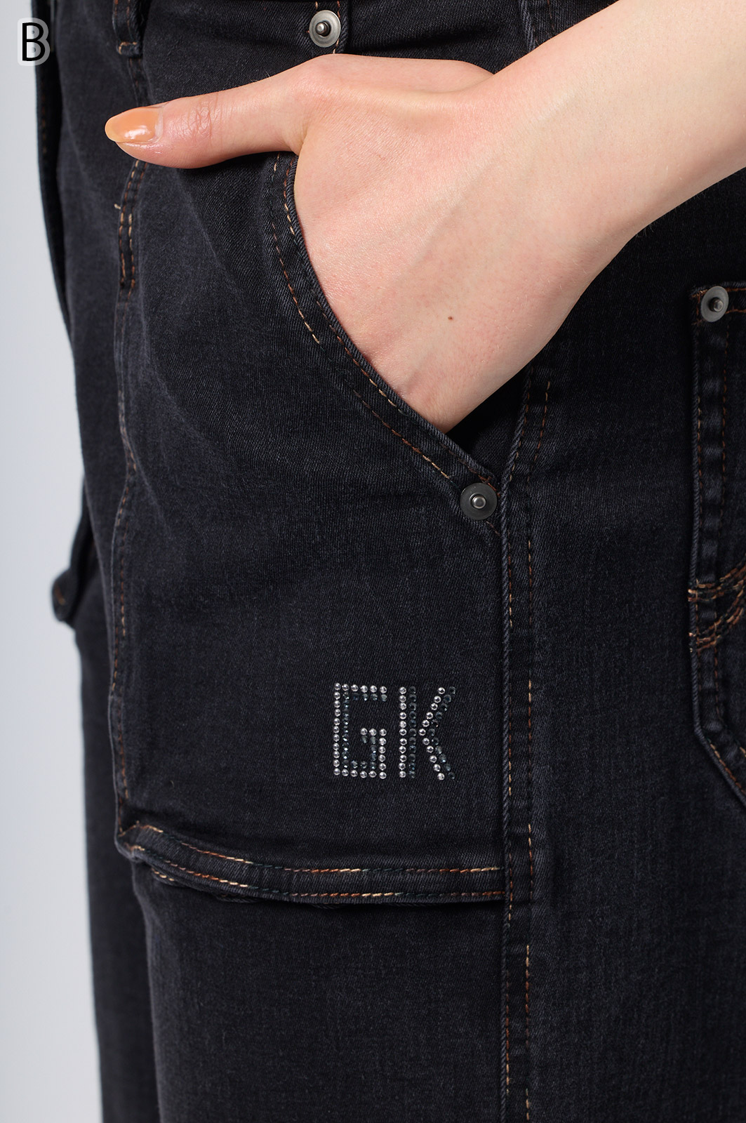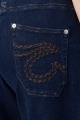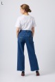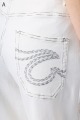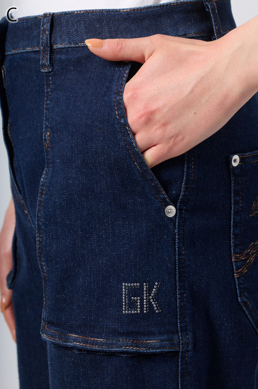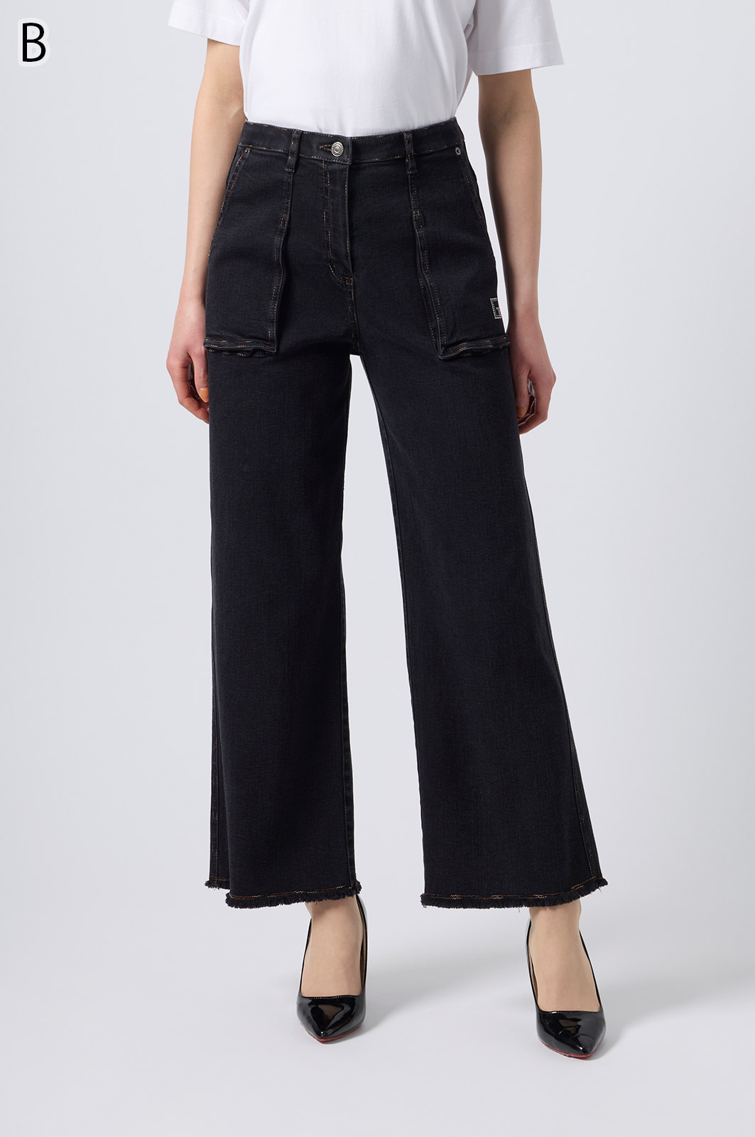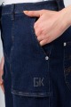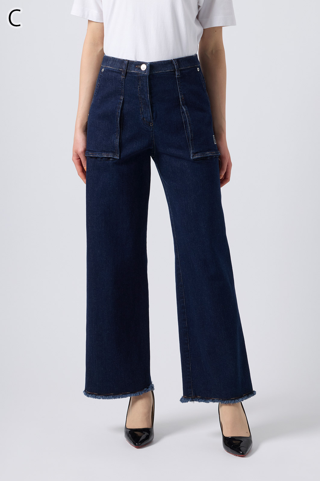 横ストレッチの効いたデニムが快適なバギーシルエットパンツ。ウエストゴム仕様でキックバックも良く、裾フリンジが個性的なアクセントに。前後の大きなポケットと全体に施されたミックスの太糸ステッチが魅力のデザインです。