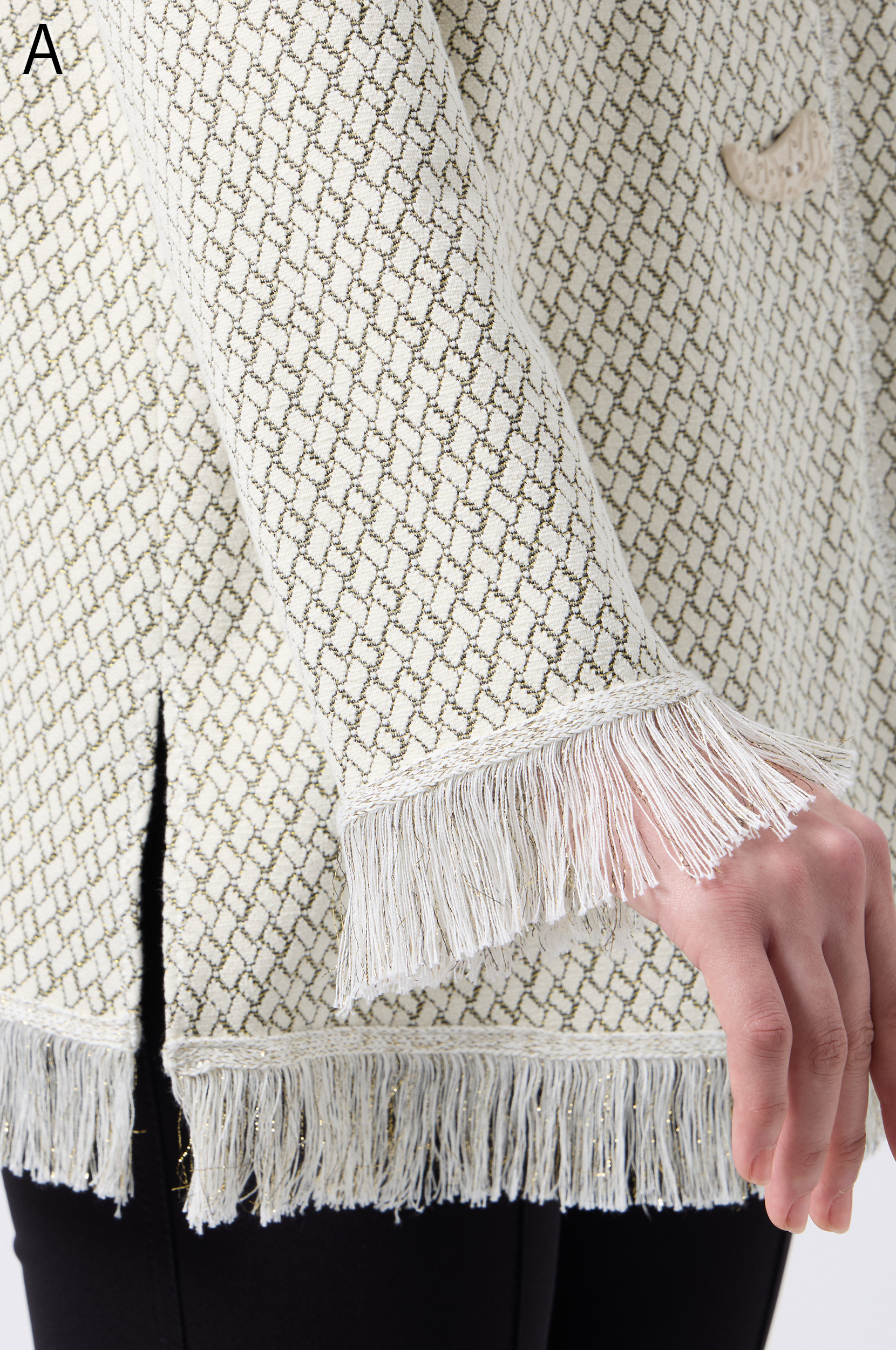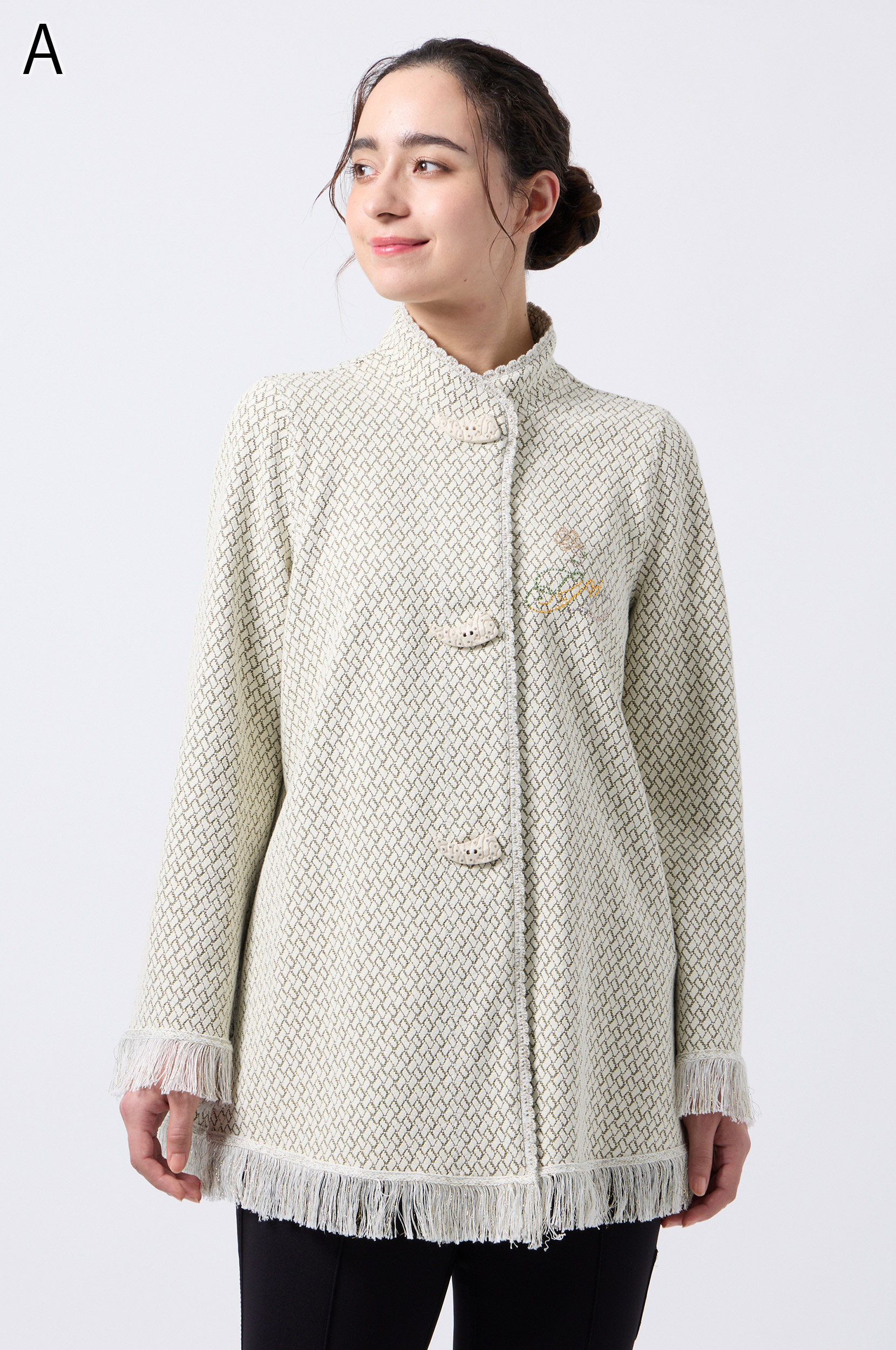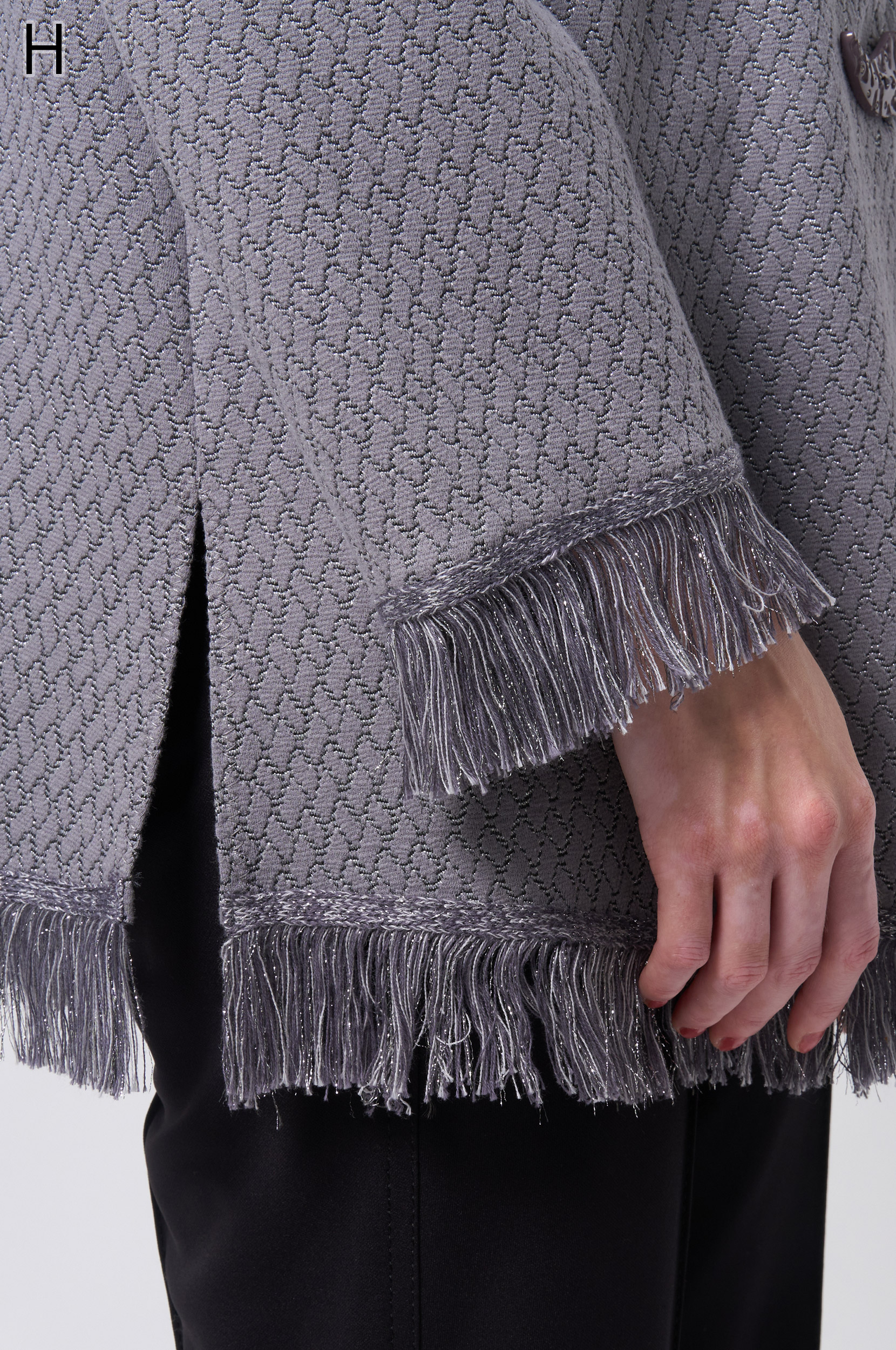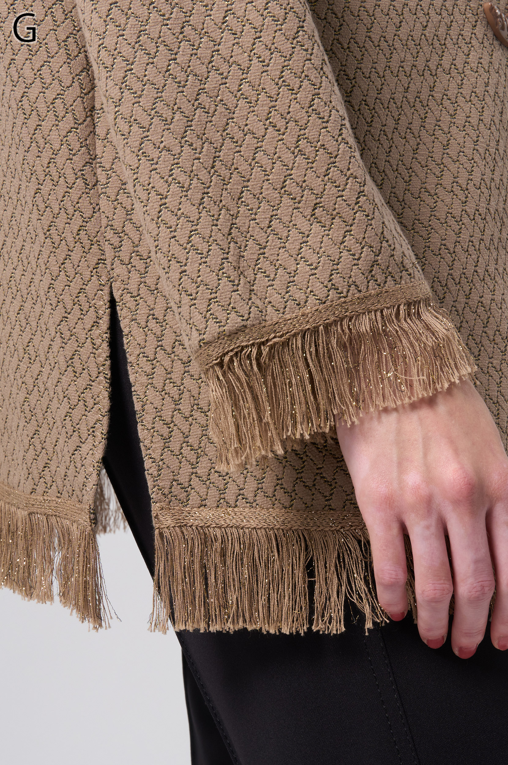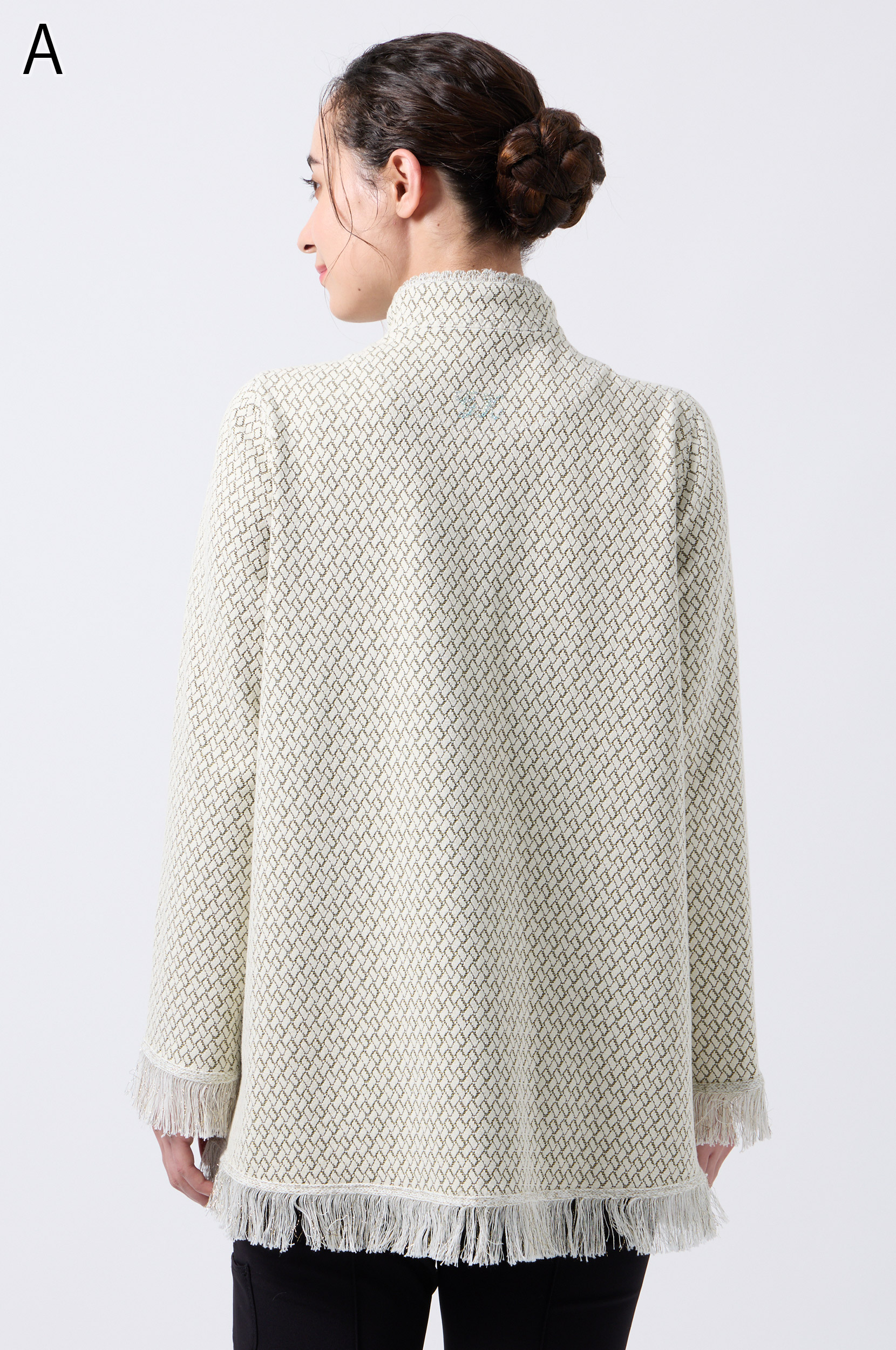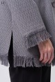 ラメ入りジャガードストレッチ素材を使用した羽織りブラウスです。ニットリンキング始末や袖口、裾に施された同素材のフリンジ編みがアクセントとなり、華やかさを演出します。動きやすさとデザイン性を兼ね備えた一着です。