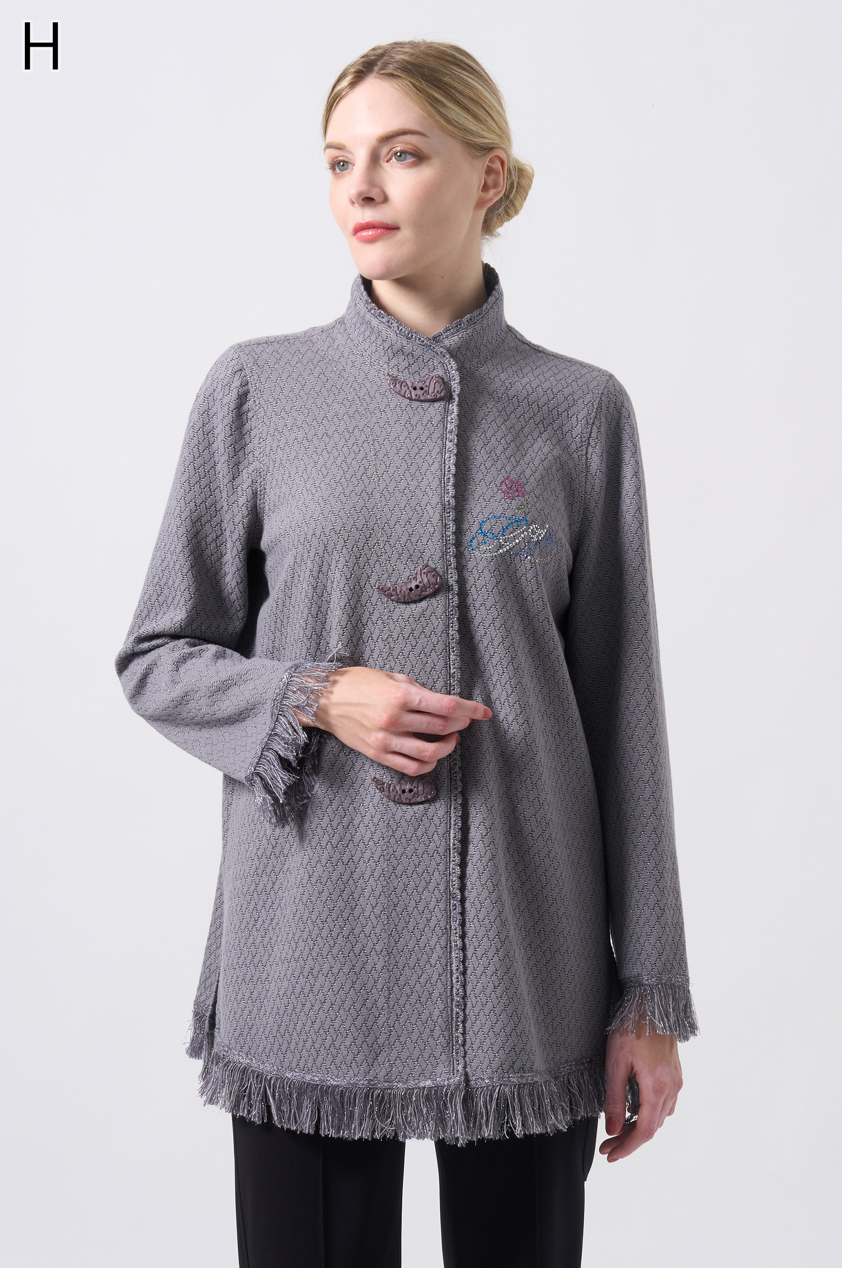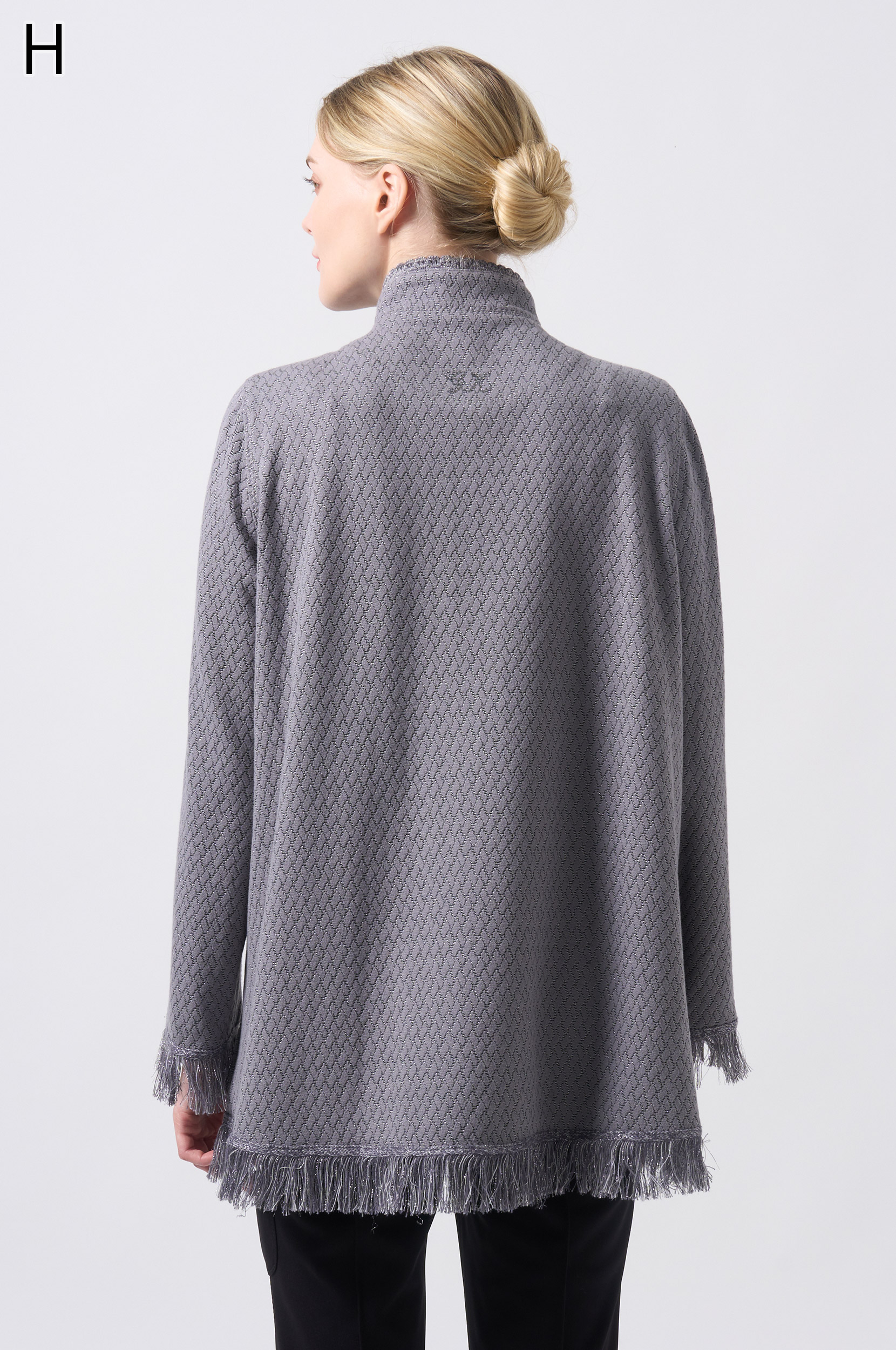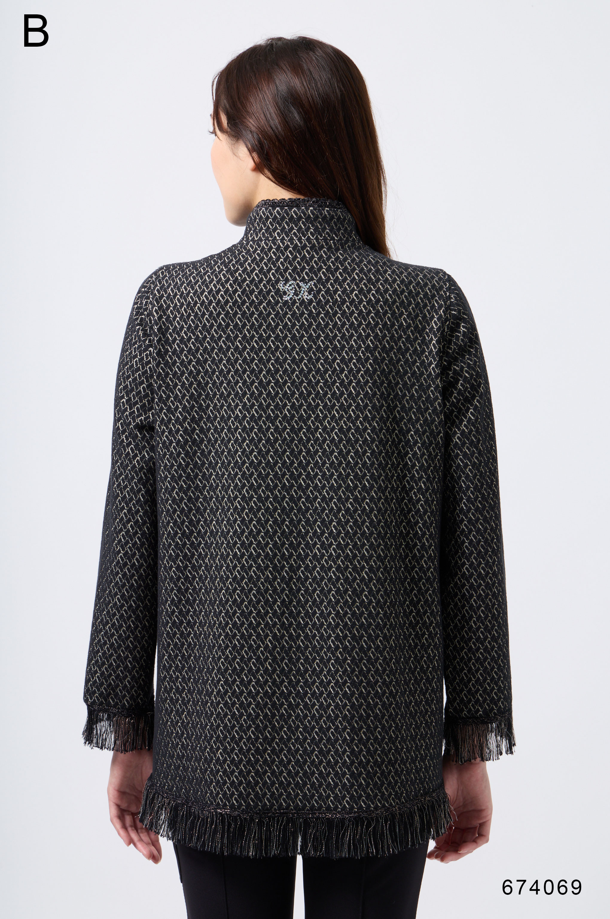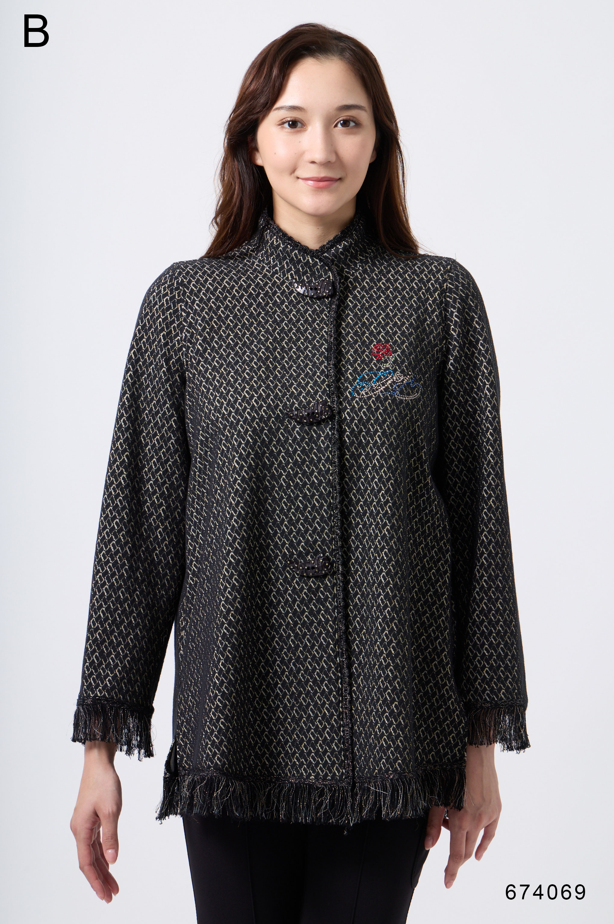ラメ入りジャガードストレッチ素材を使用した羽織りブラウスです。ニットリンキング始末や袖口、裾に施された同素材のフリンジ編みがアクセントとなり、華やかさを演出します。動きやすさとデザイン性を兼ね備えた一着です。