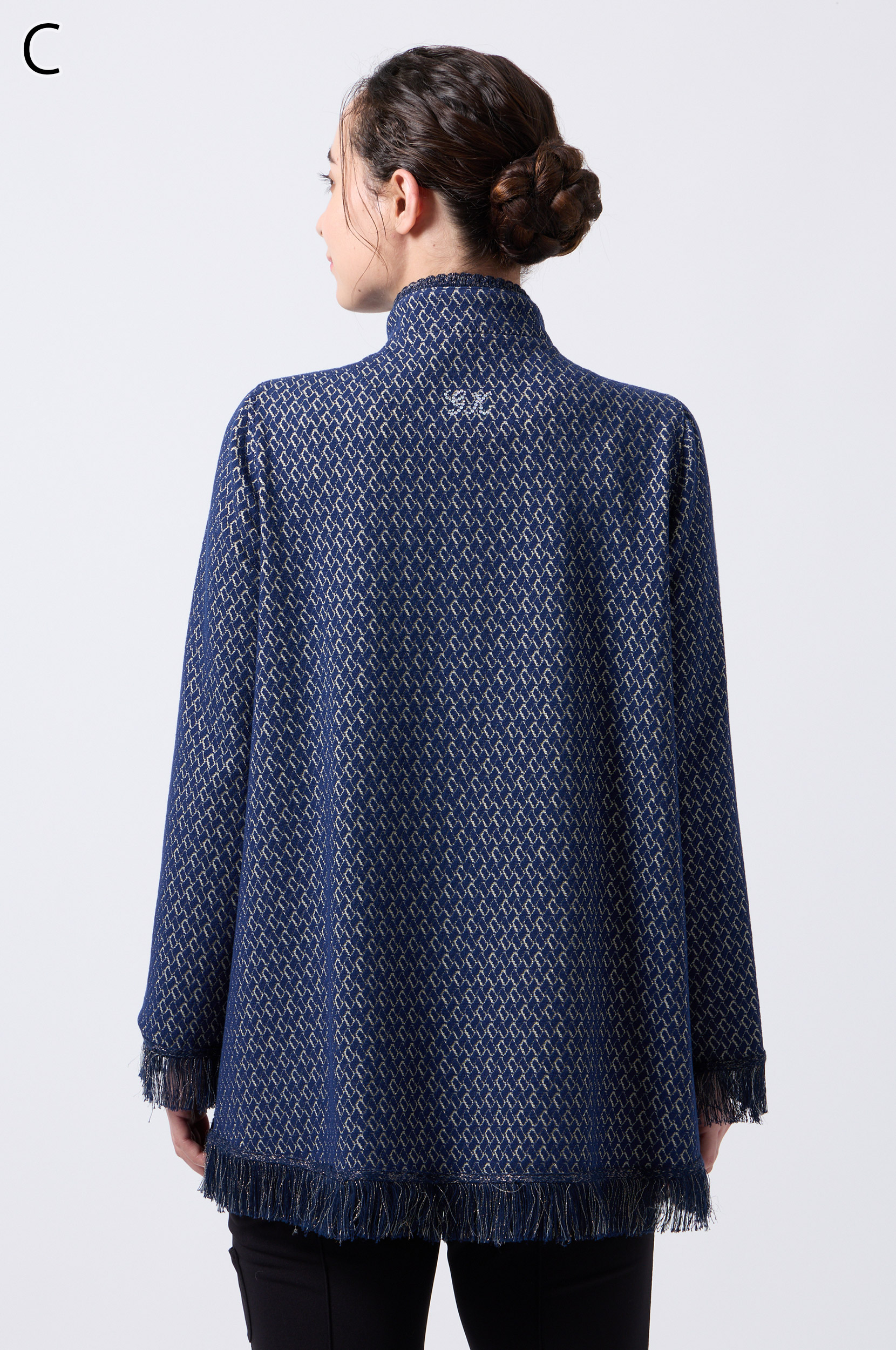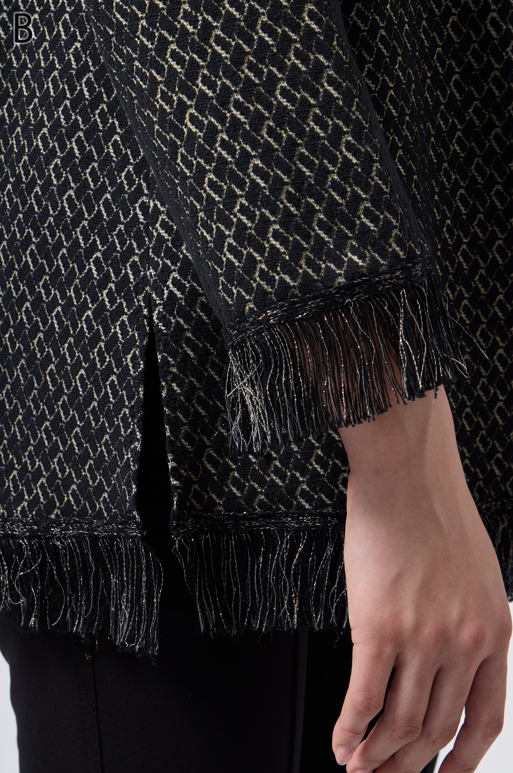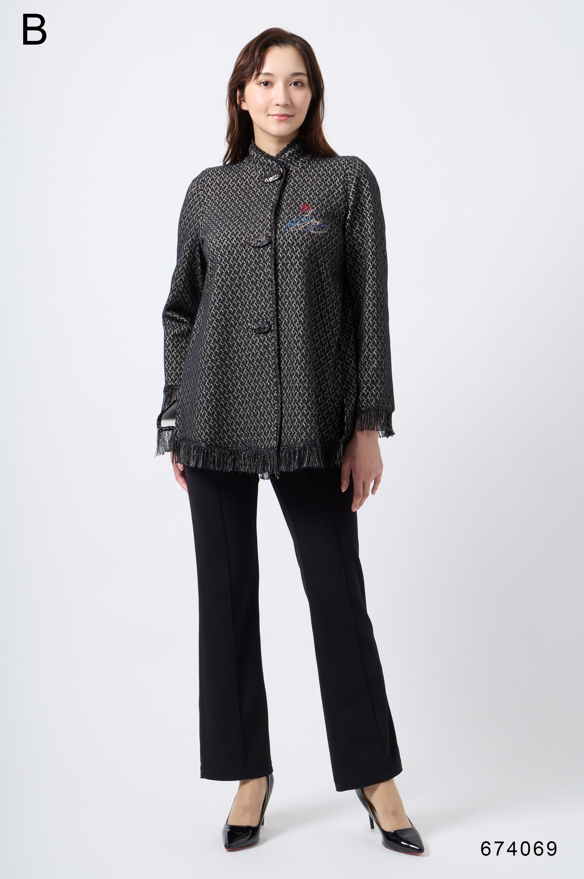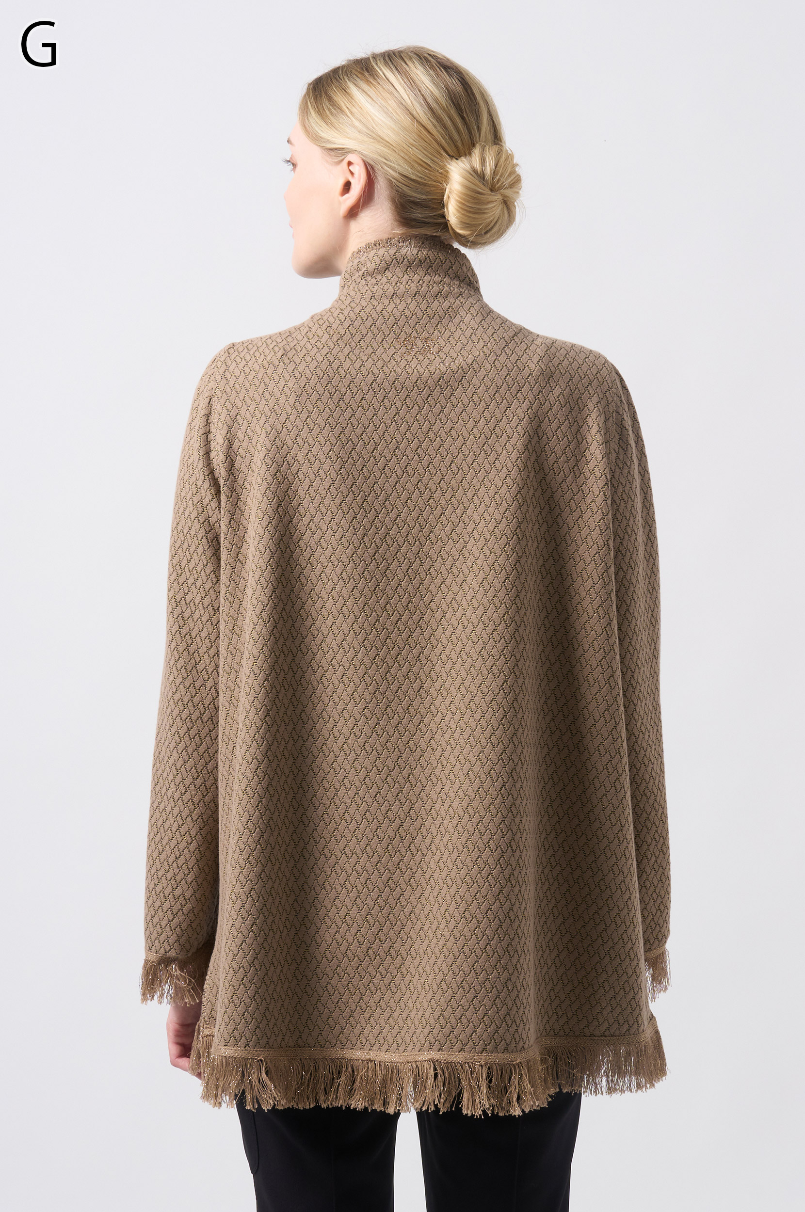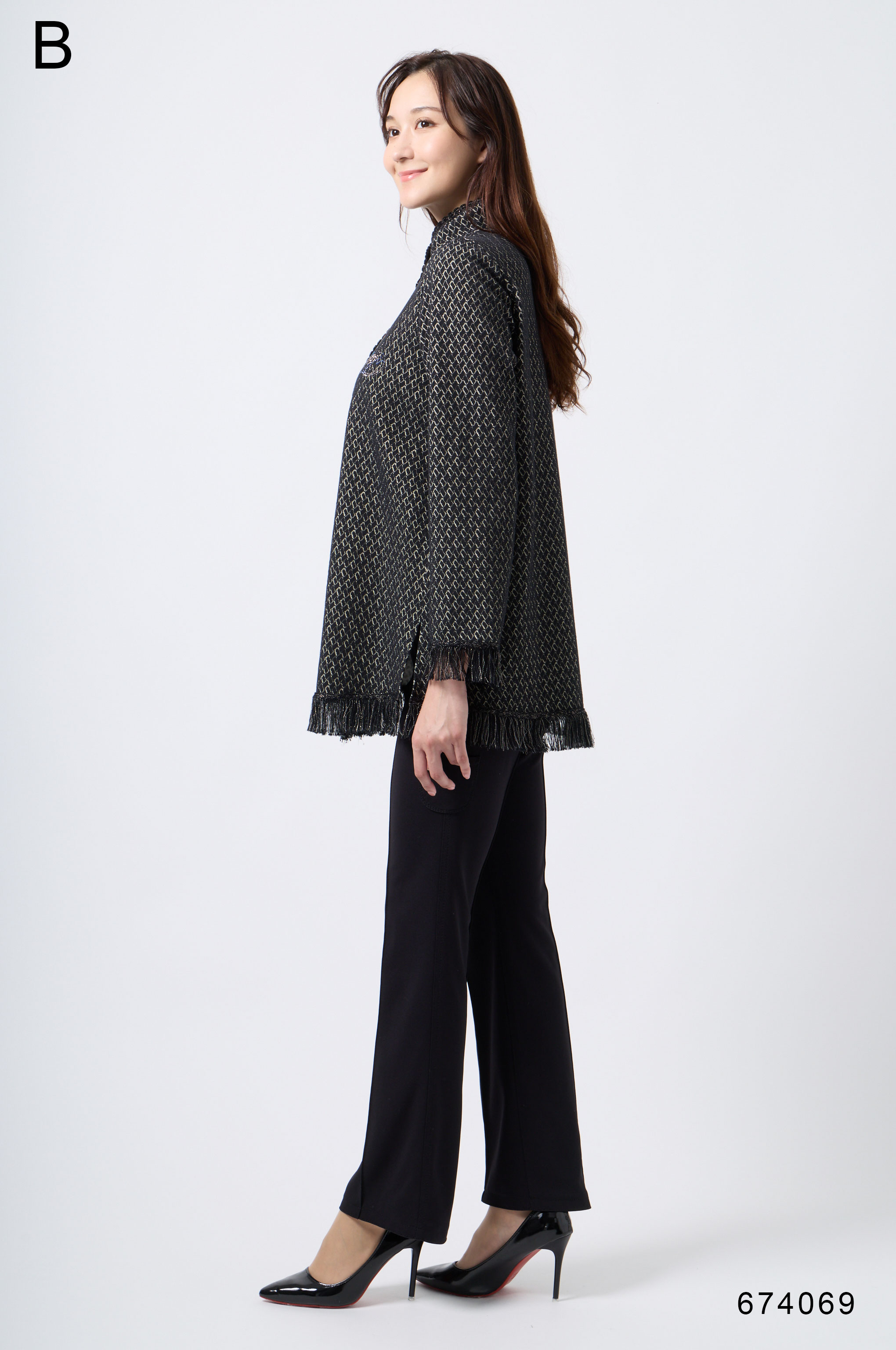 ラメ入りジャガードストレッチ素材を使用した羽織りブラウスです。ニットリンキング始末や袖口、裾に施された同素材のフリンジ編みがアクセントとなり、華やかさを演出します。動きやすさとデザイン性を兼ね備えた一着です。
