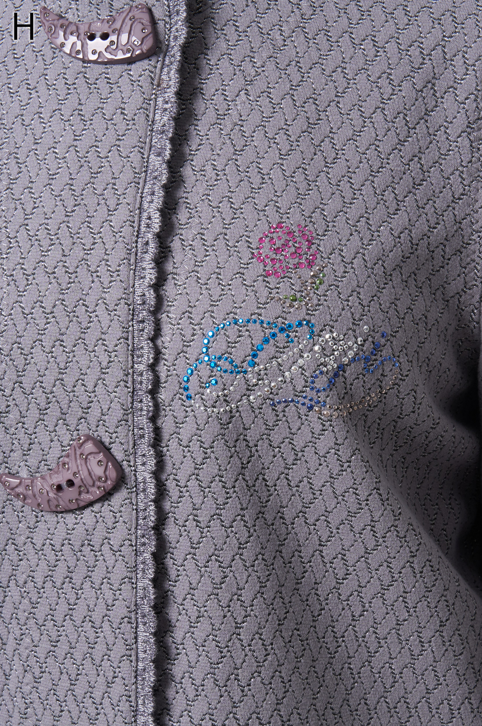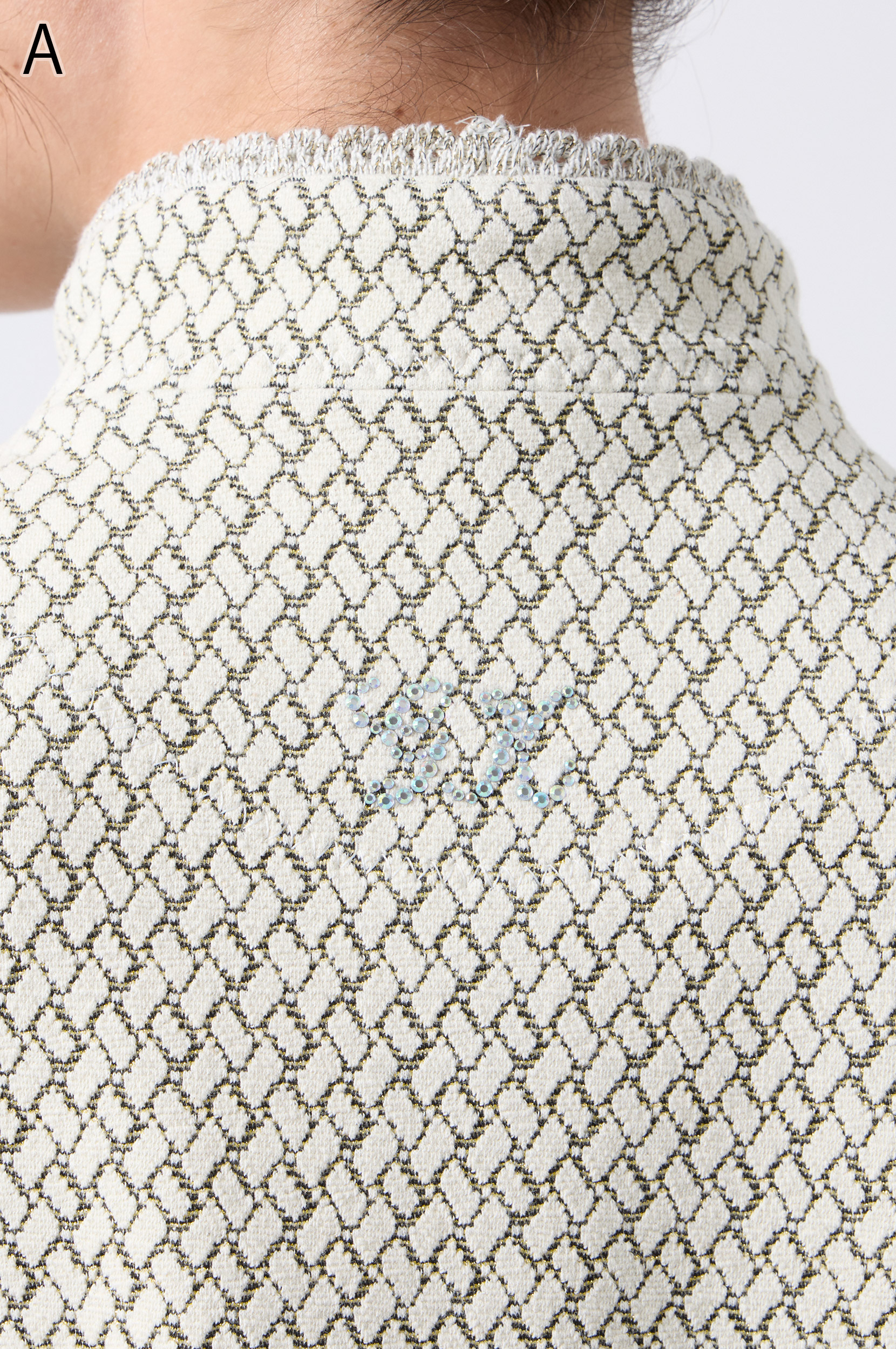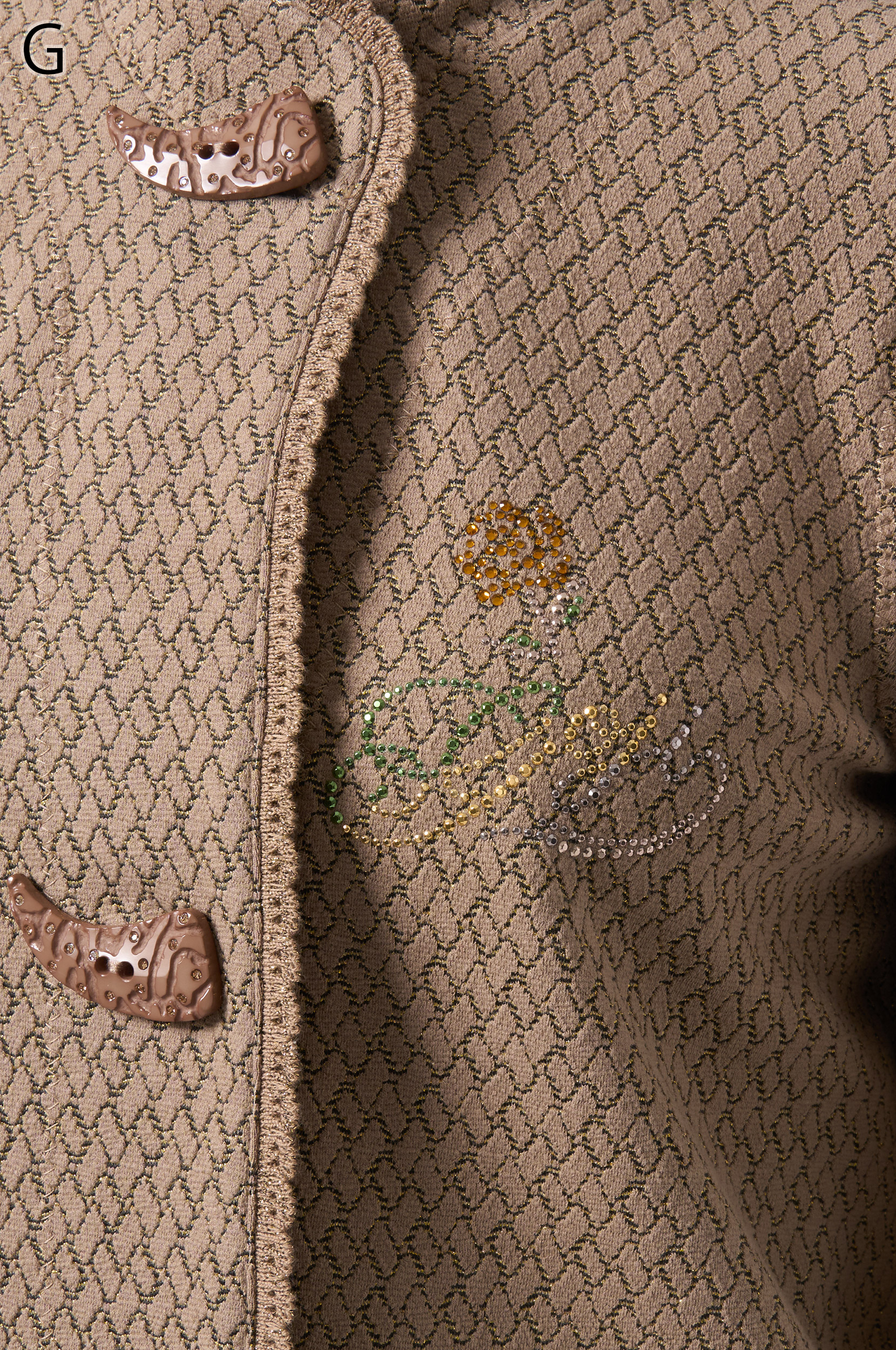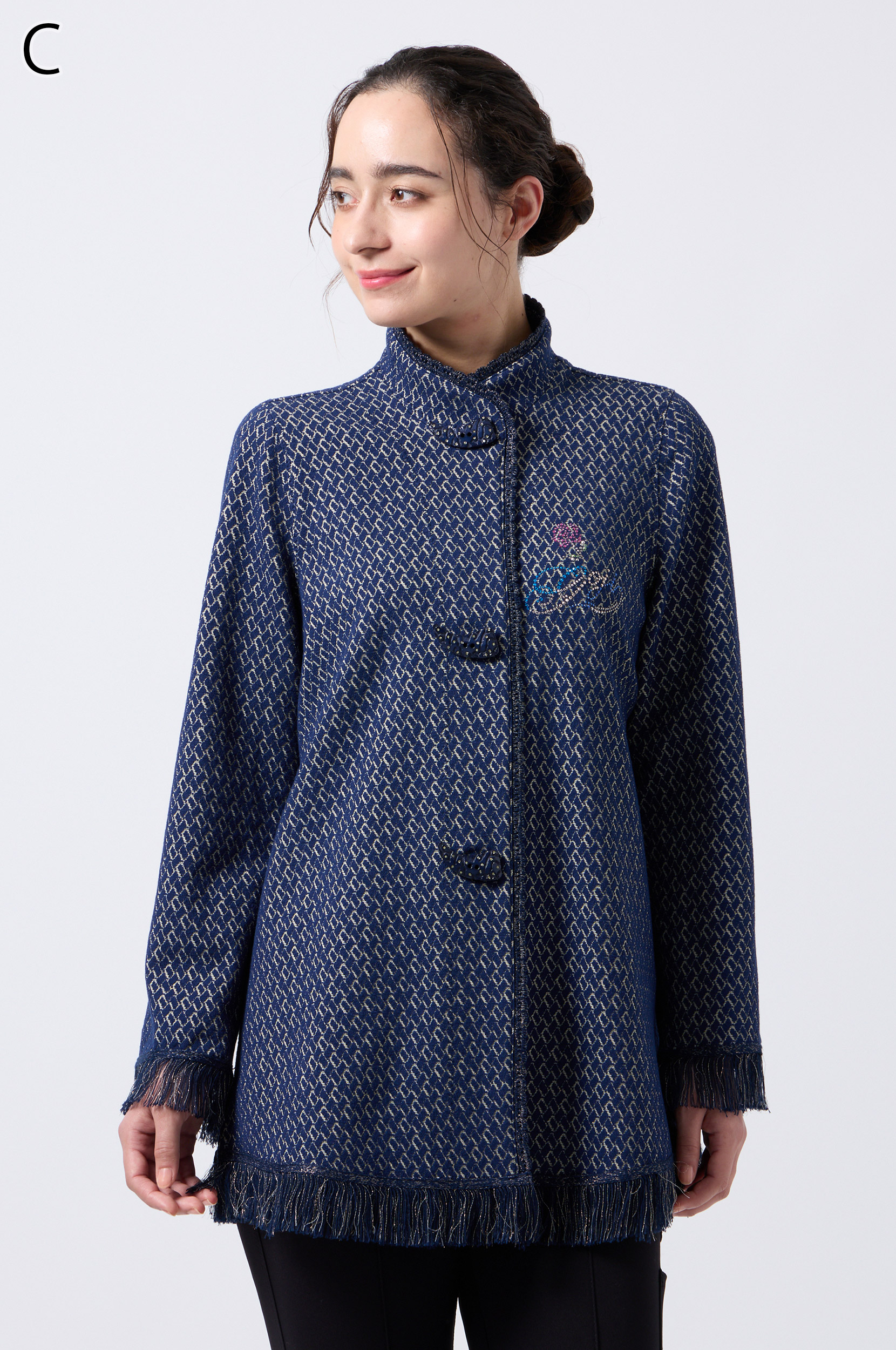 ラメ入りジャガードストレッチ素材を使用した羽織りブラウスです。ニットリンキング始末や袖口、裾に施された同素材のフリンジ編みがアクセントとなり、華やかさを演出します。動きやすさとデザイン性を兼ね備えた一着です。