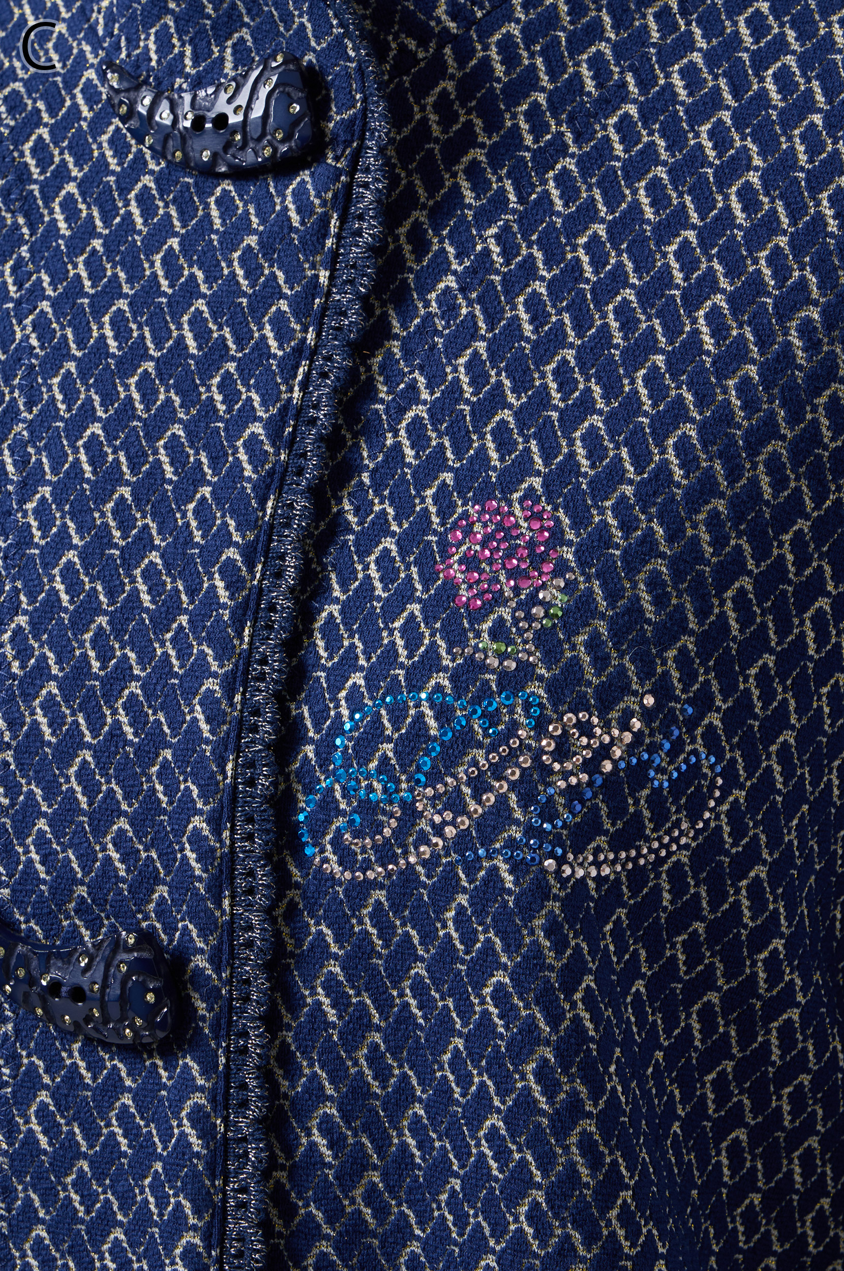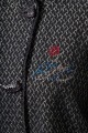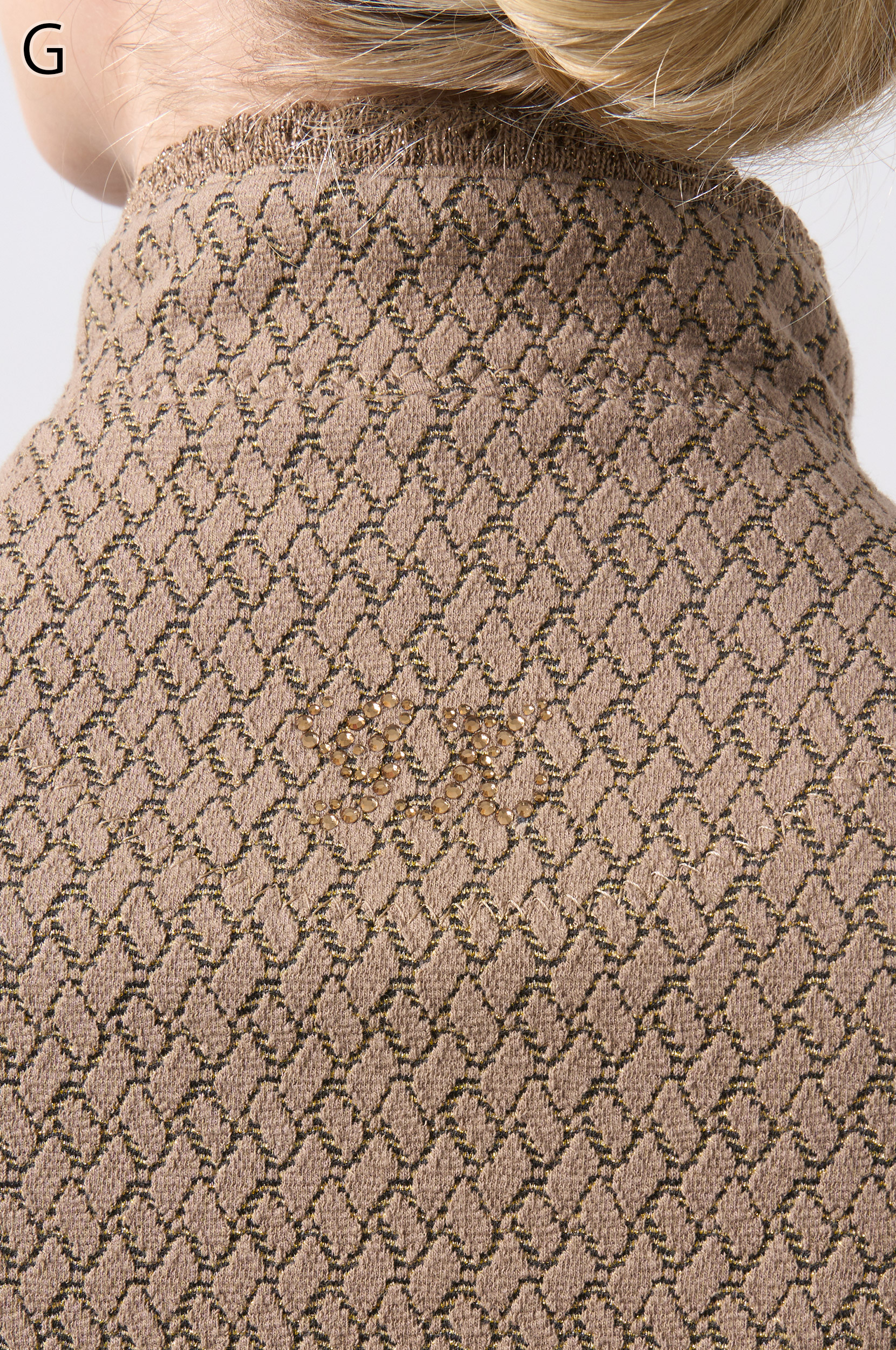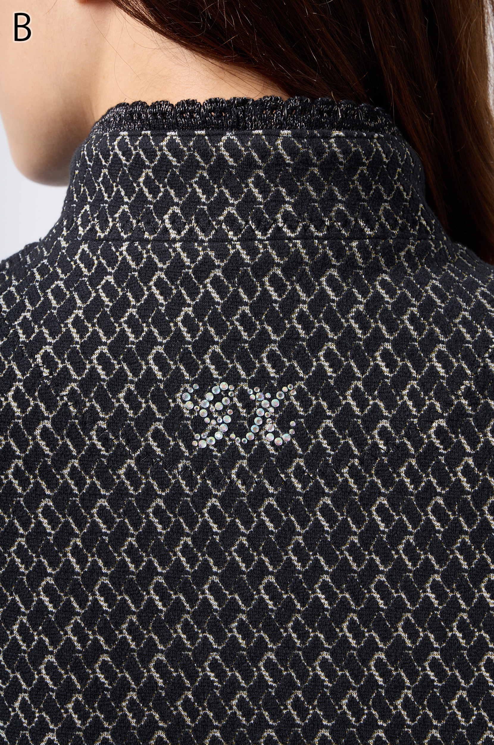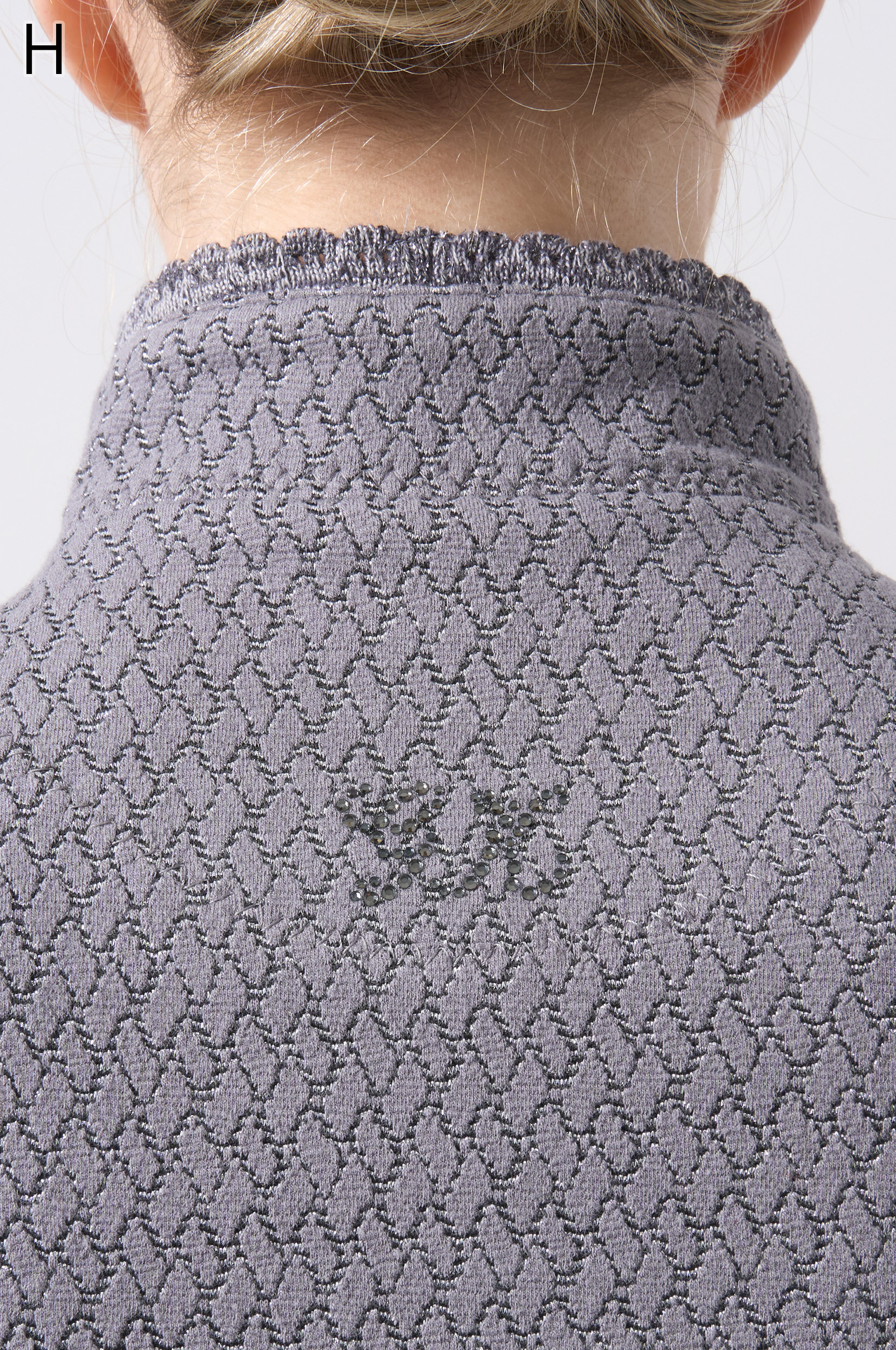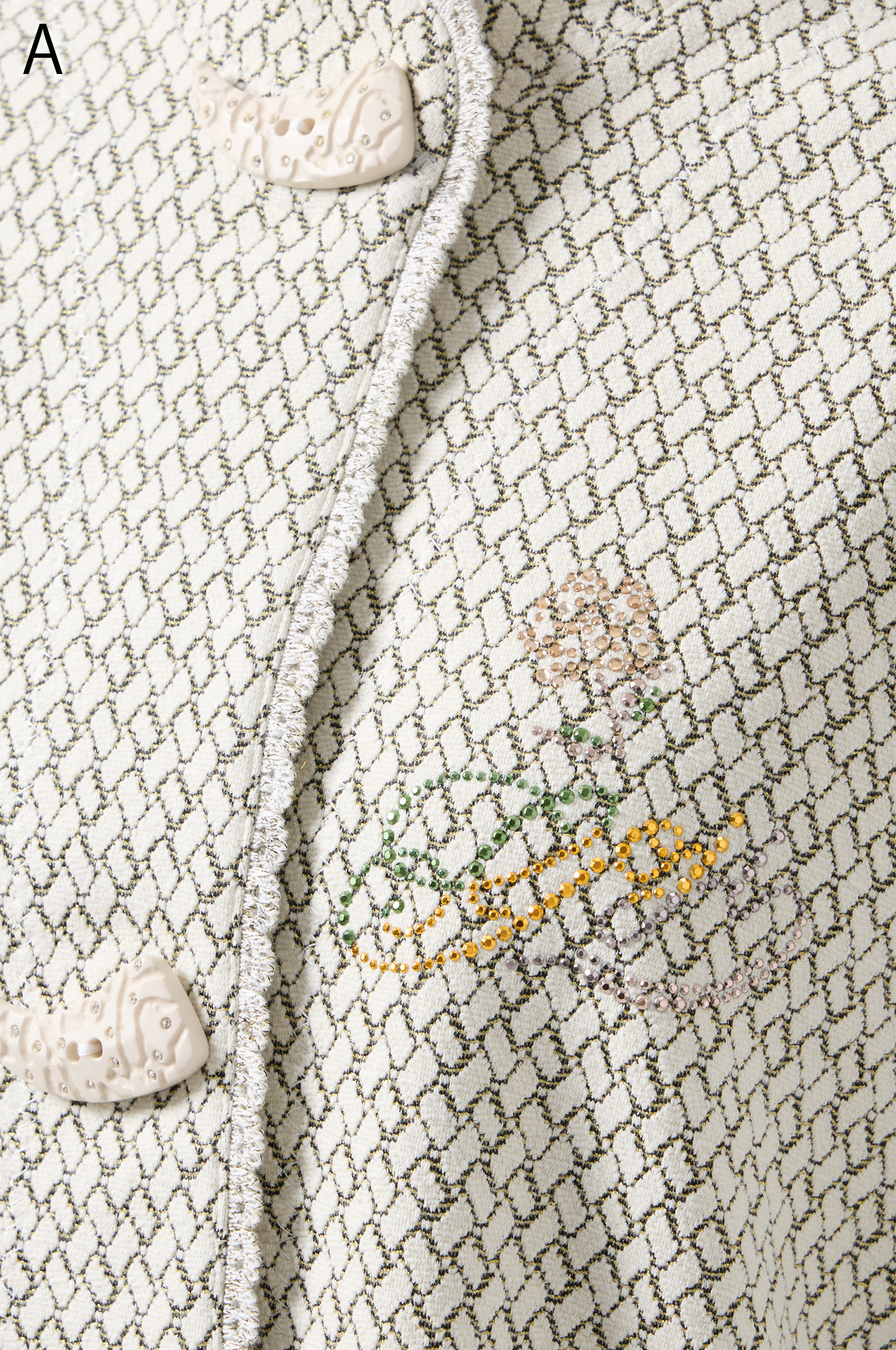 ラメ入りジャガードストレッチ素材を使用した羽織りブラウスです。ニットリンキング始末や袖口、裾に施された同素材のフリンジ編みがアクセントとなり、華やかさを演出します。動きやすさとデザイン性を兼ね備えた一着です。
