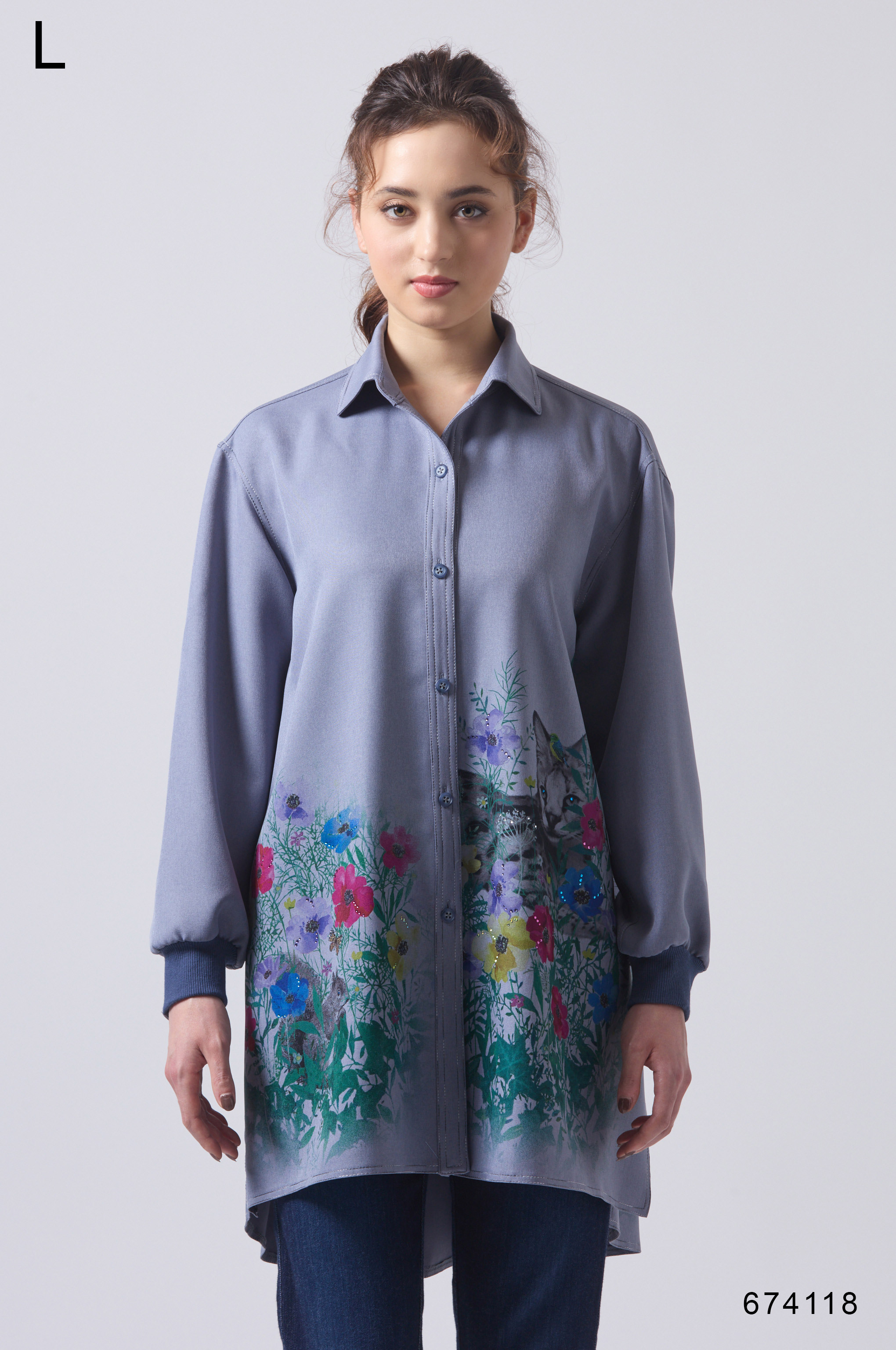 イージーケアのウールライクな素材を使用したブラウス。花やサーバルキャット、ペルシャネコのプリントが愛らしさを引き立てます。日常のスタイルに遊び心を加えたい方におすすめの一着です。