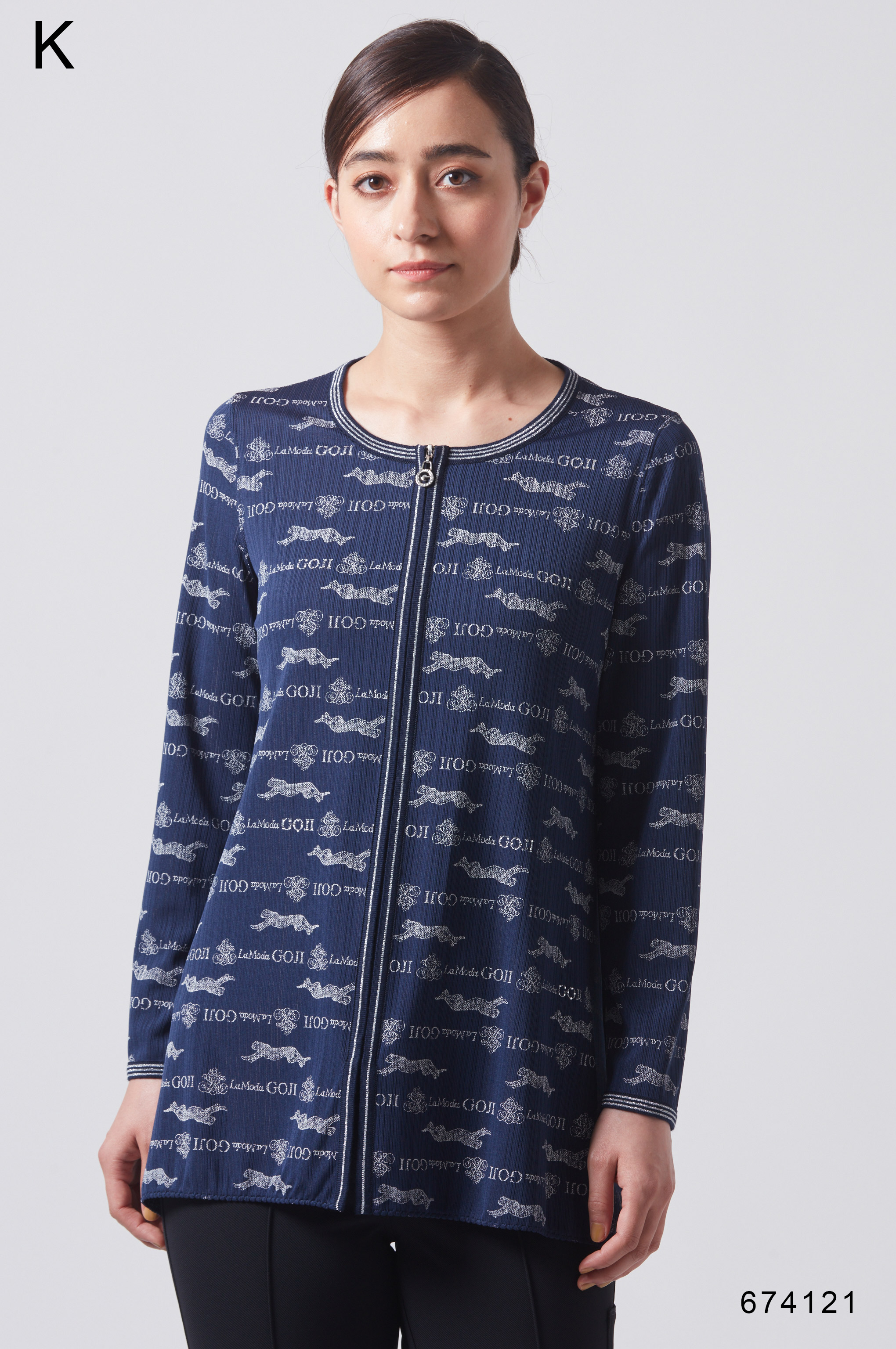 落ち感のあるモダーレ素材にオリジナルロゴと飛びヒョウのプリント。ラメ入りリンキングが高級感を演出し、Aラインシルエットと裾のフレアが美しいデザインです。