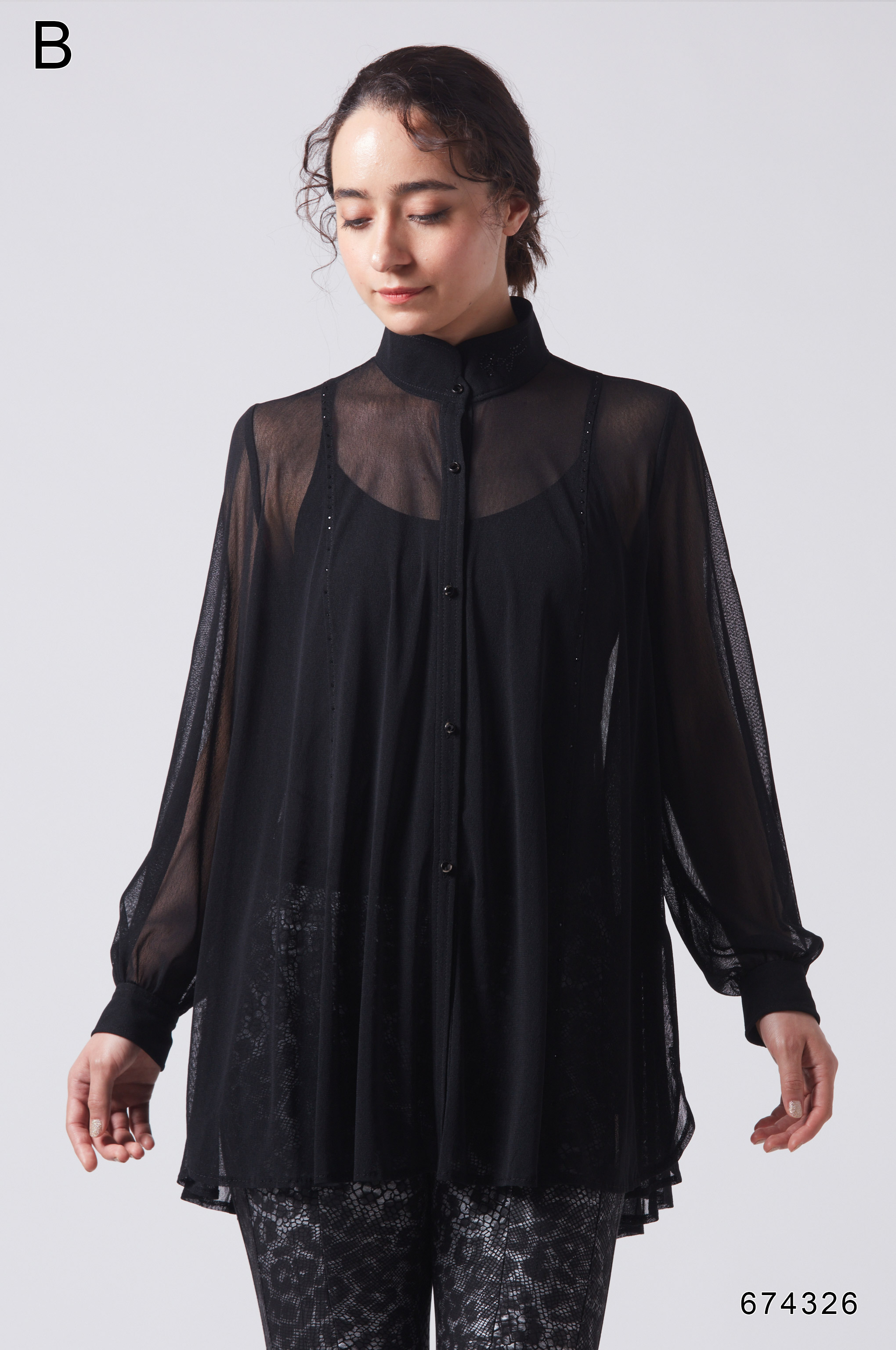 ポリエステルメッシュ素材のブラウス。イージーケアが特徴で、8枚接ぎのフレアデザインがエレガントで分量感たっぷりです。