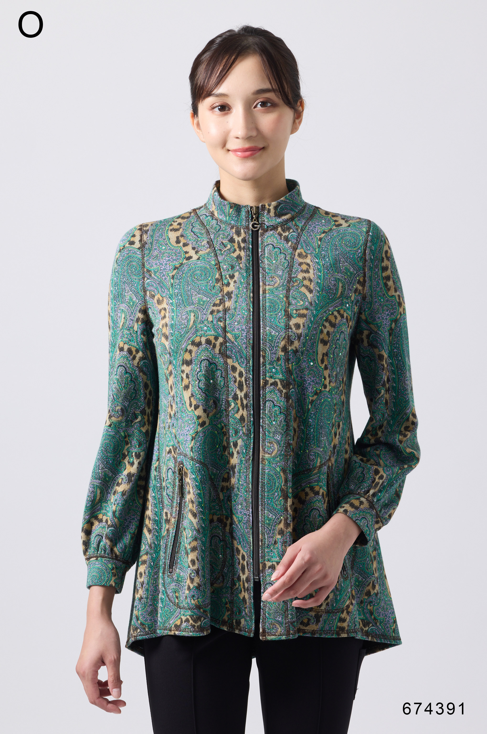 オリジナルペーズリーとヒョウ柄のプリントが特徴のニット素材を使用。後ろ切替フレアーが豊かなボリューム感を演出し、前ファスナーで手軽に羽織れるブラウスです。