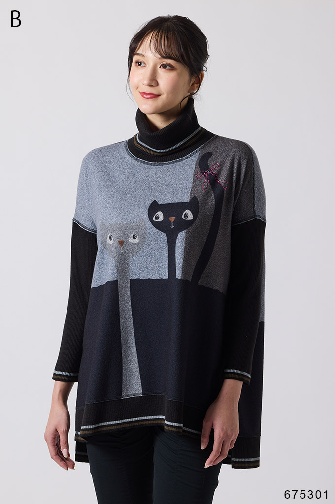 ポップなネコのプリントが施された起毛ニット素材のTシャツ。衿ぐり、袖、裾にニット編地を使用し、温かさと快適さを兼ね備えたデザインです。カジュアルにもおしゃれに楽しめる一枚です。