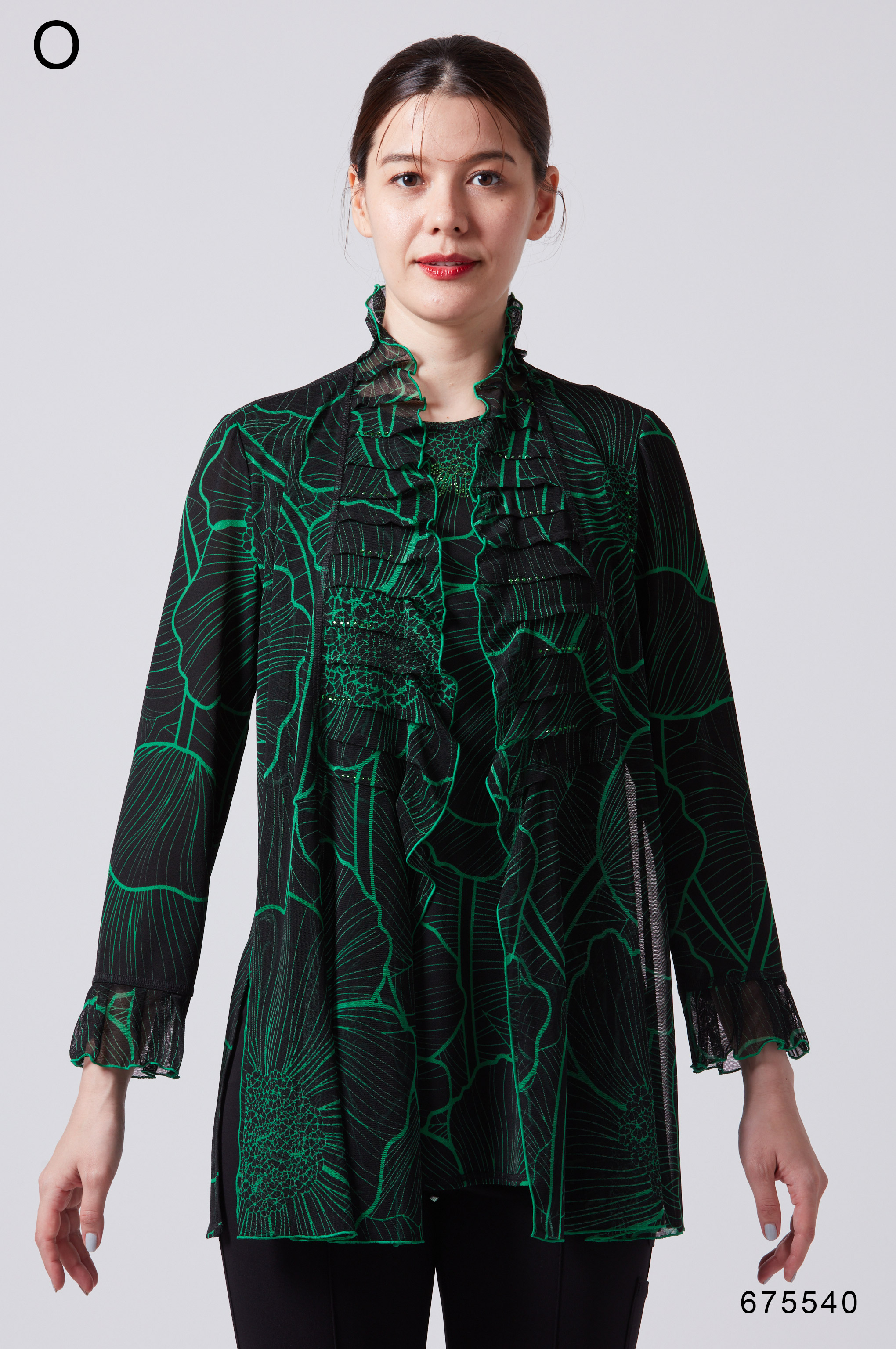 ニット素材とメッシュ素材を組み合わせた花柄プリントが特徴のAラインTシャツ。前面が2枚重ねになったアンサンブル風デザインで、スタイリッシュな印象を演出します。