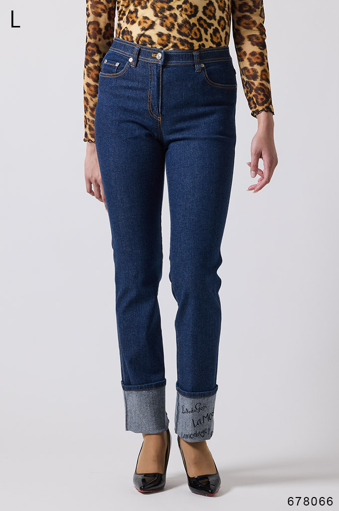 ストレッチデニムで快適な履き心地。太めの裾折り返しでパンツ丈を自由に調整可能。細身のストレートシルエットにオリジナル顔料グリッタープリントがアクセントの一枚です。