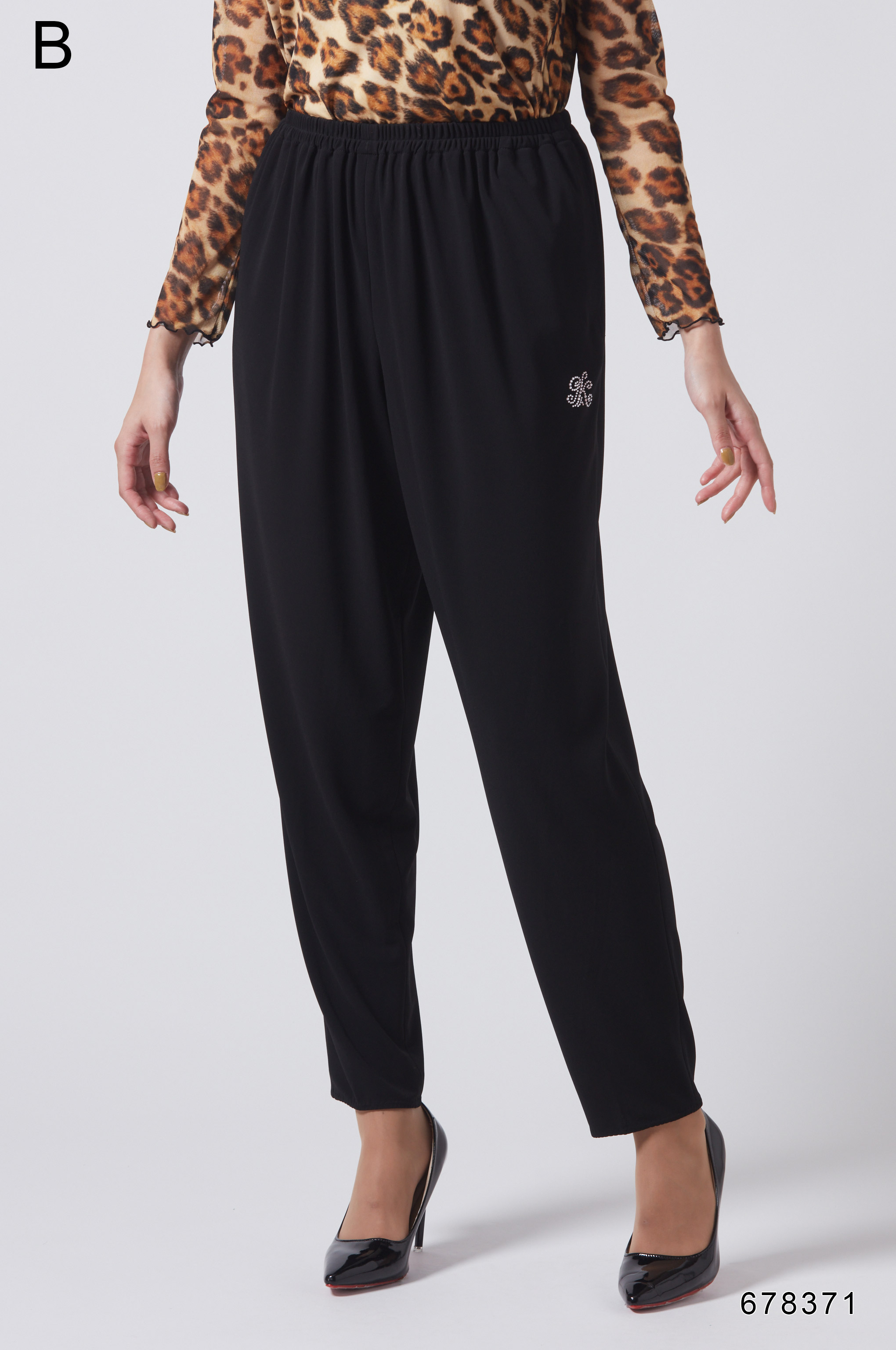 ストレッチ性の素材で落ち感が良く、シワになりにくいパンツ。ウエストはゴムギャザーで体形カバーし、裾幅を細くしてスッキリしたシルエットに仕上げました。