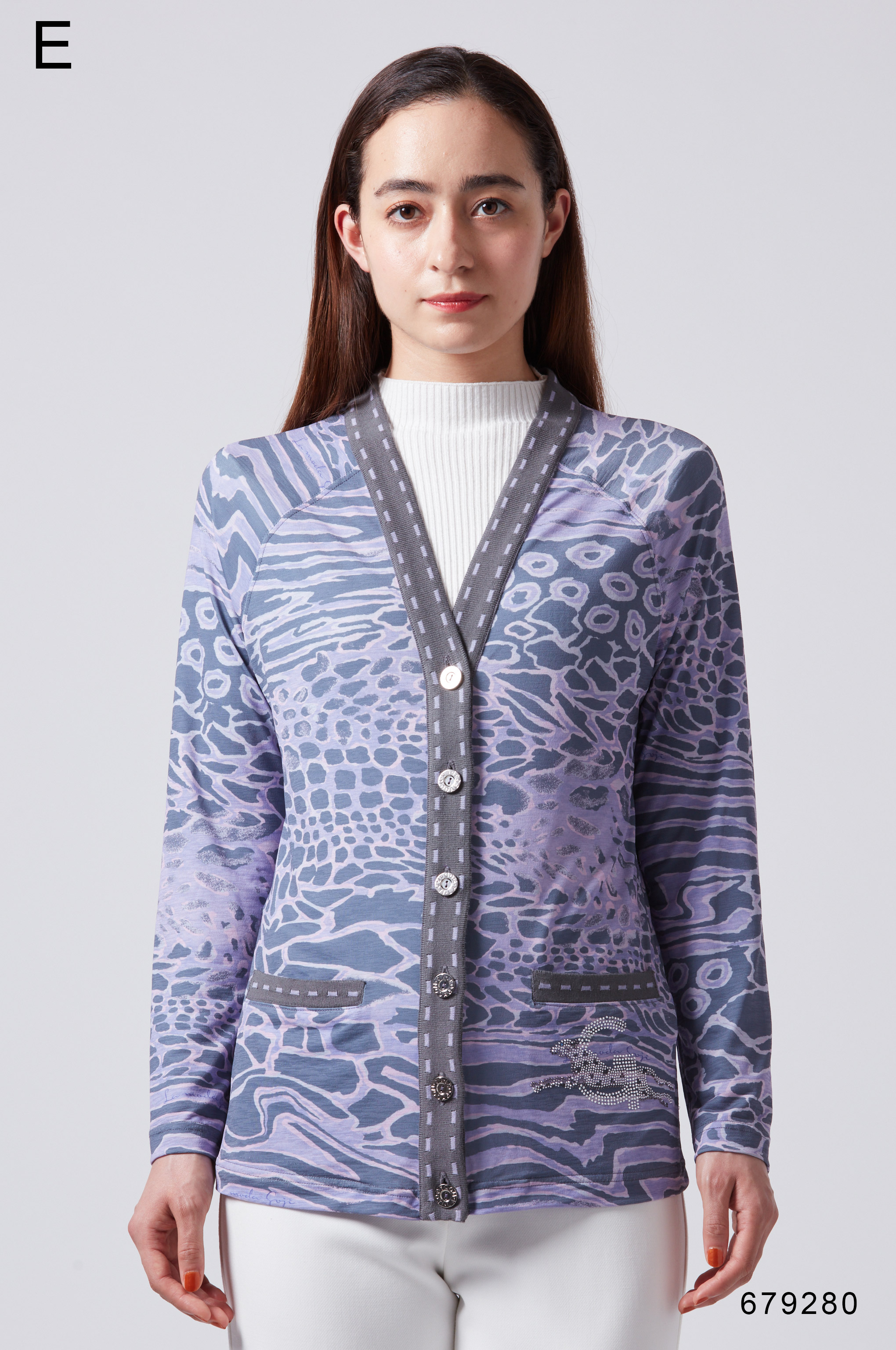 オリジナルのヒョウ柄とロゴプリントが施されたニット素材を使用。前立てとポケット口にはステッチ風の編地を取り入れ、ヒップ周りをカバーする丈でミセスに優しいシルエットです。