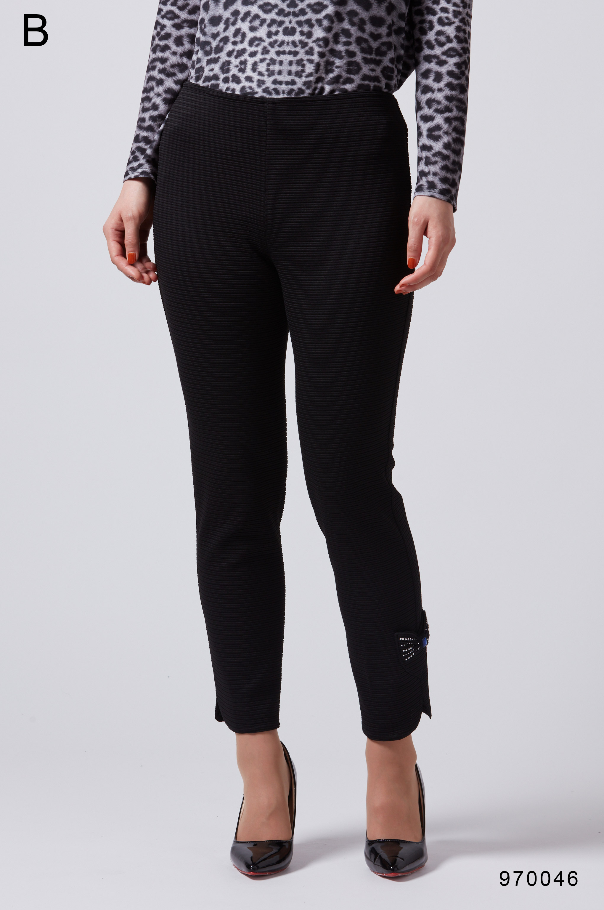 横ボーダーの立体感と2wayストレッチ素材を使用した、ウエストゴムのハイウエストカルソン。左裾にリボン付きミニポケットとアクリルパーツがポイント。