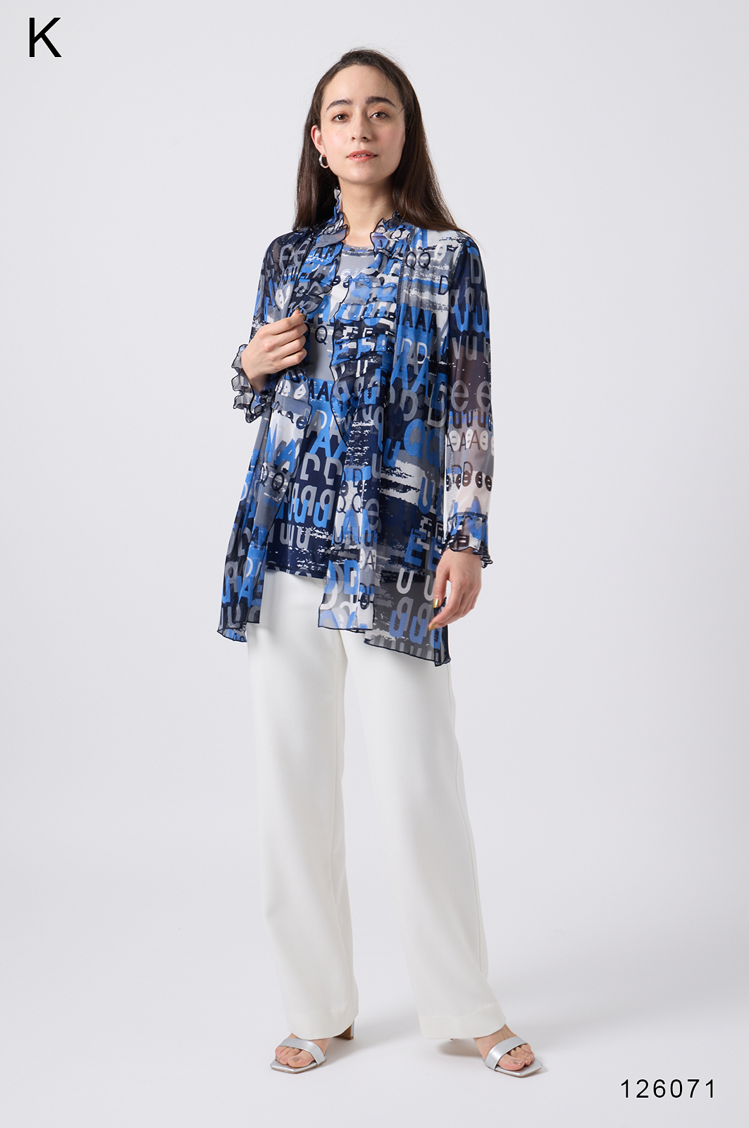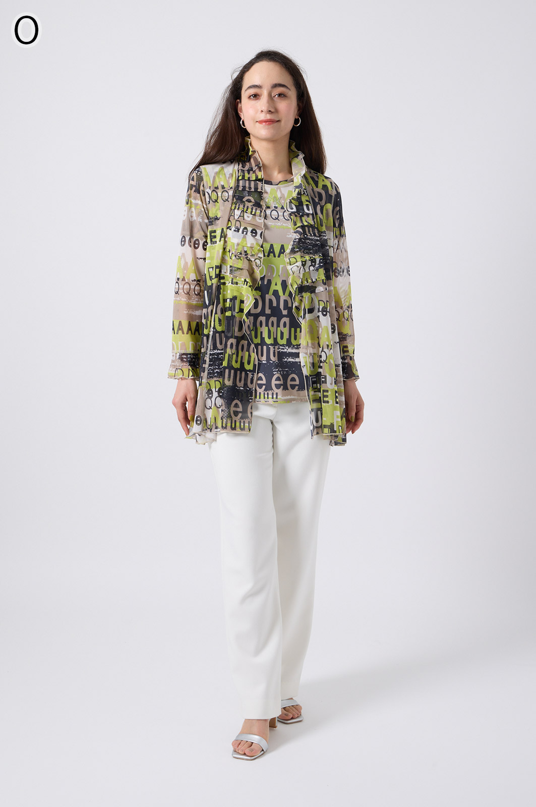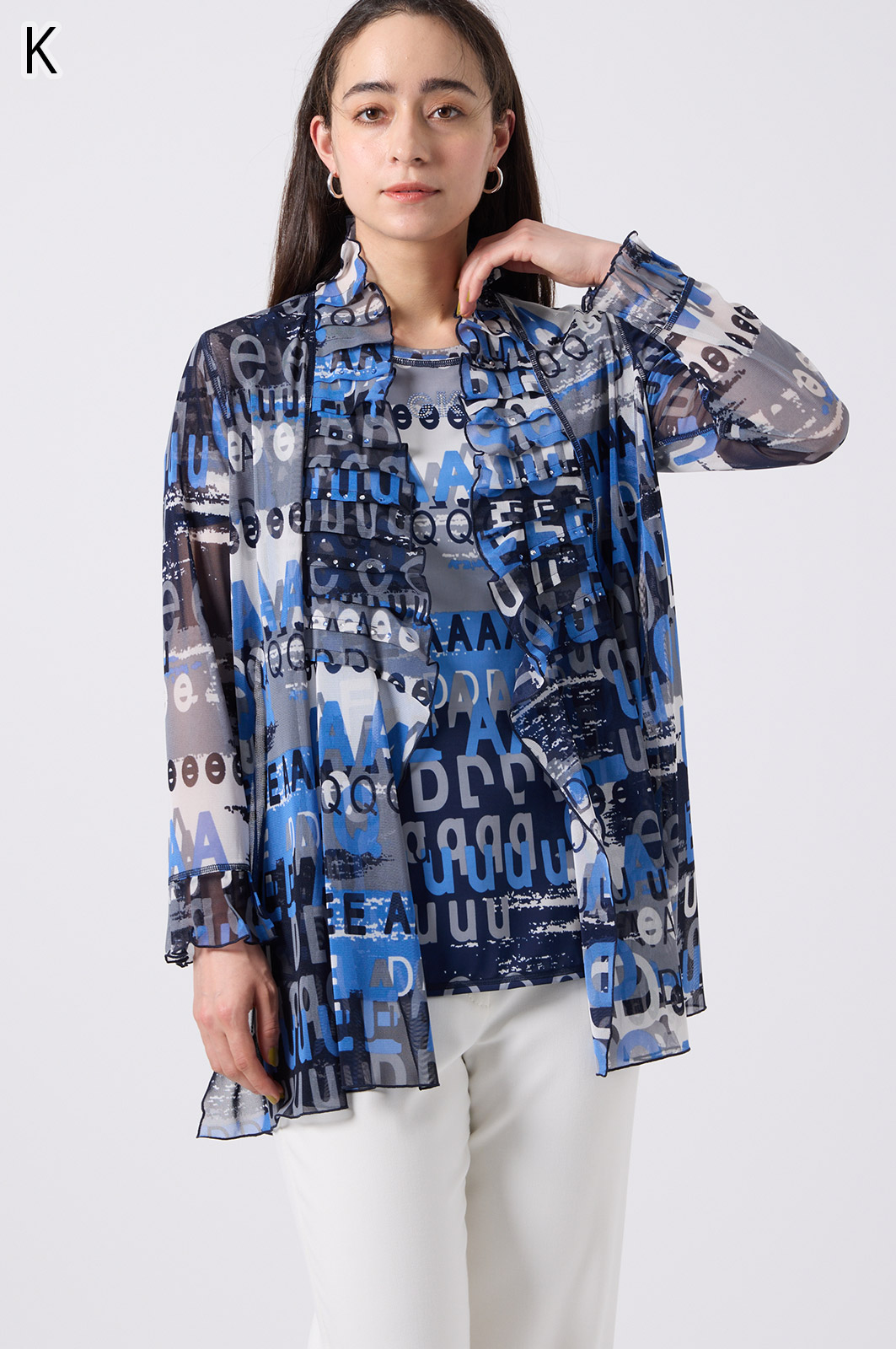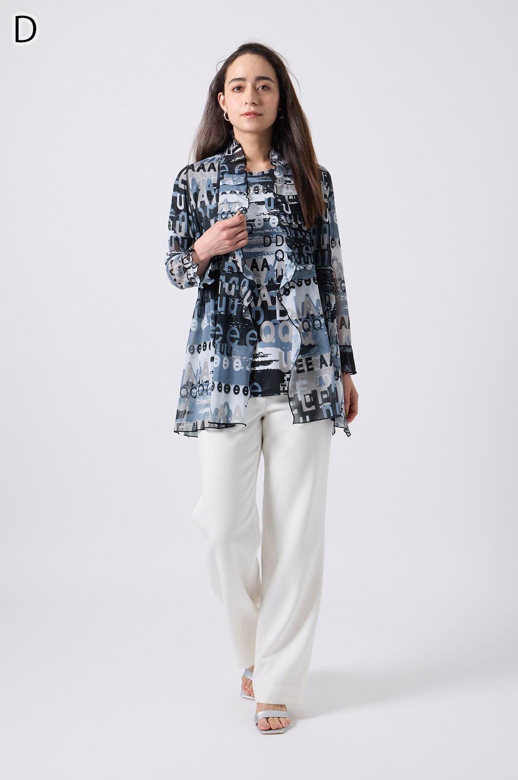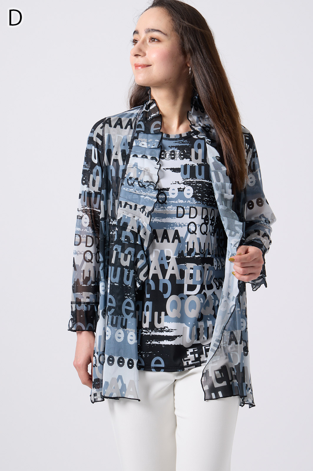 ロゴ入りの幾何学模様が映える軽やかな素材とニットを組み合わせた、Tシャツと羽織りブラウスのセット。重ねるだけで華やかな印象を演出できる着まわし便利なアイテムです。