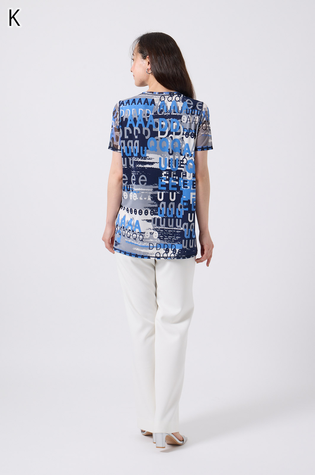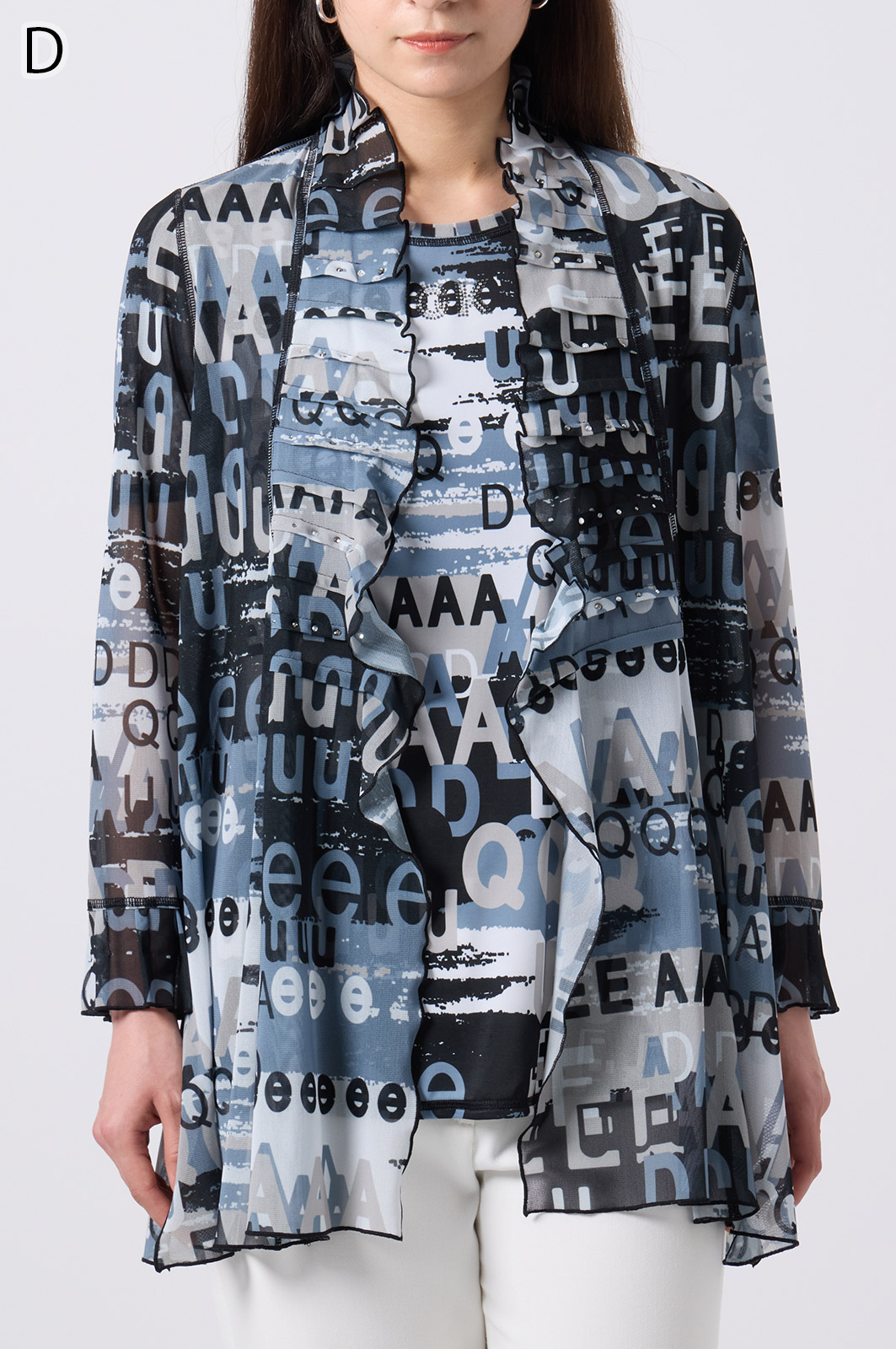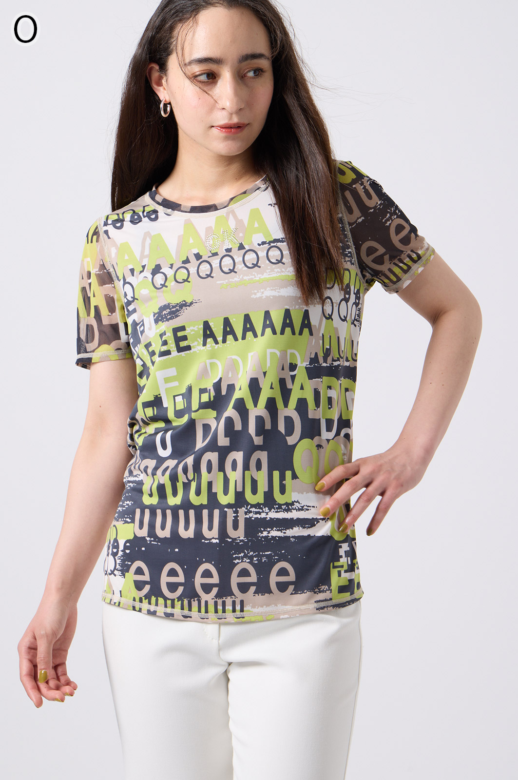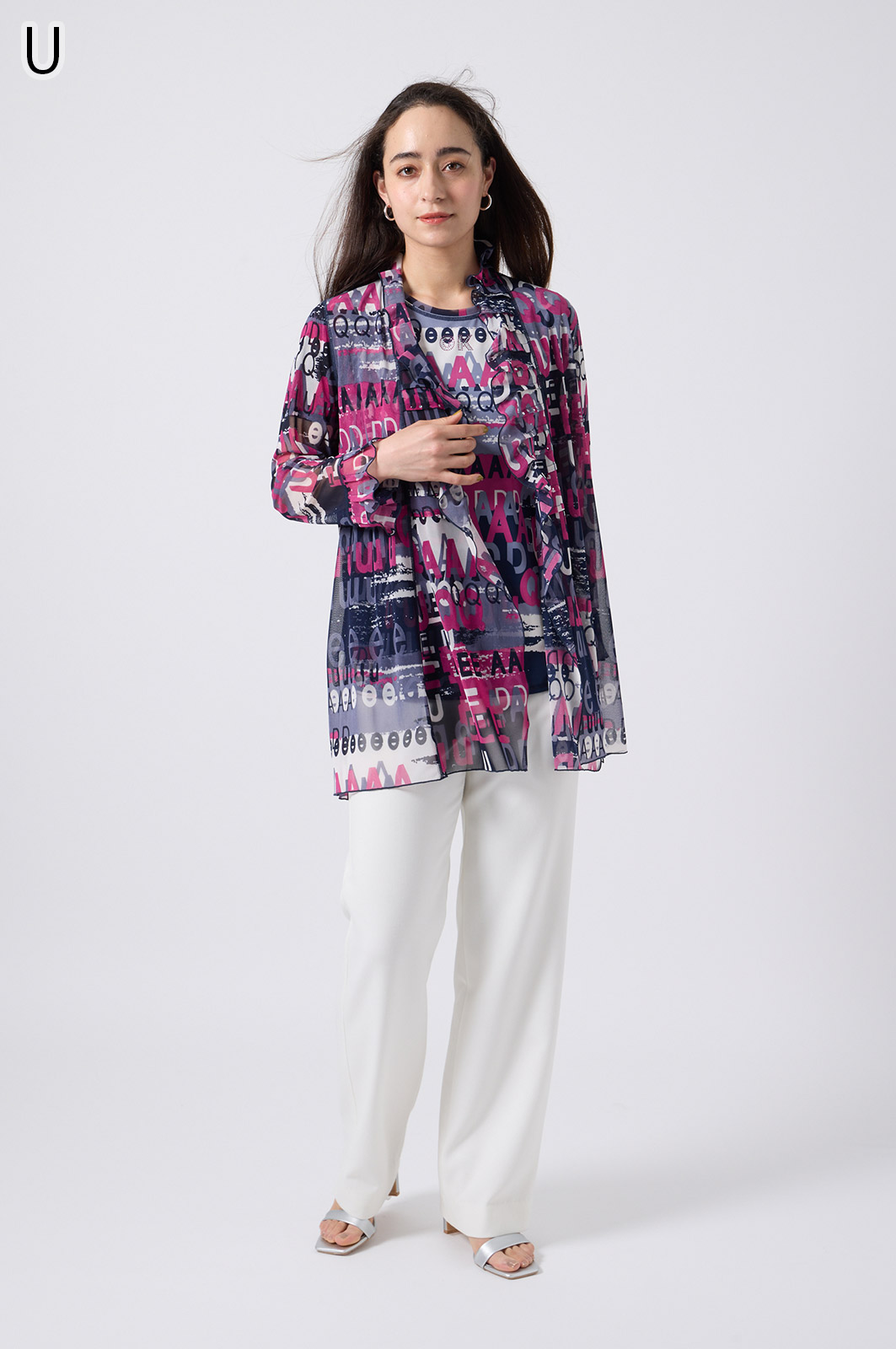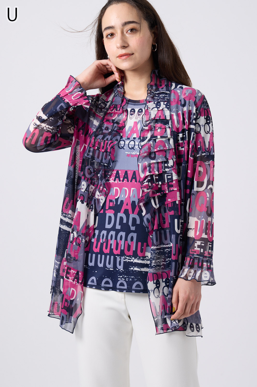 ロゴ入りの幾何学模様が映える軽やかな素材とニットを組み合わせた、Tシャツと羽織りブラウスのセット。重ねるだけで華やかな印象を演出できる着まわし便利なアイテムです。