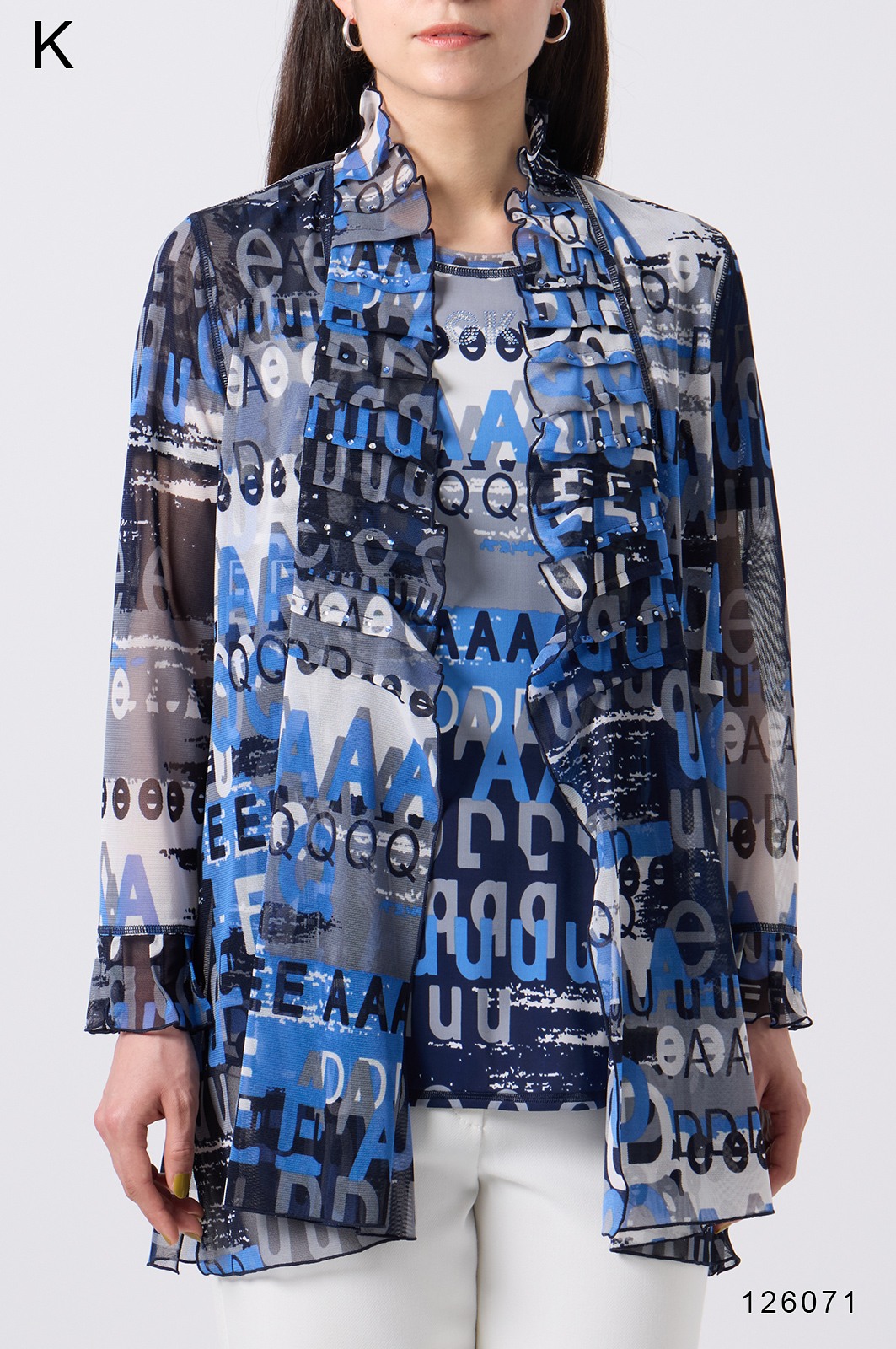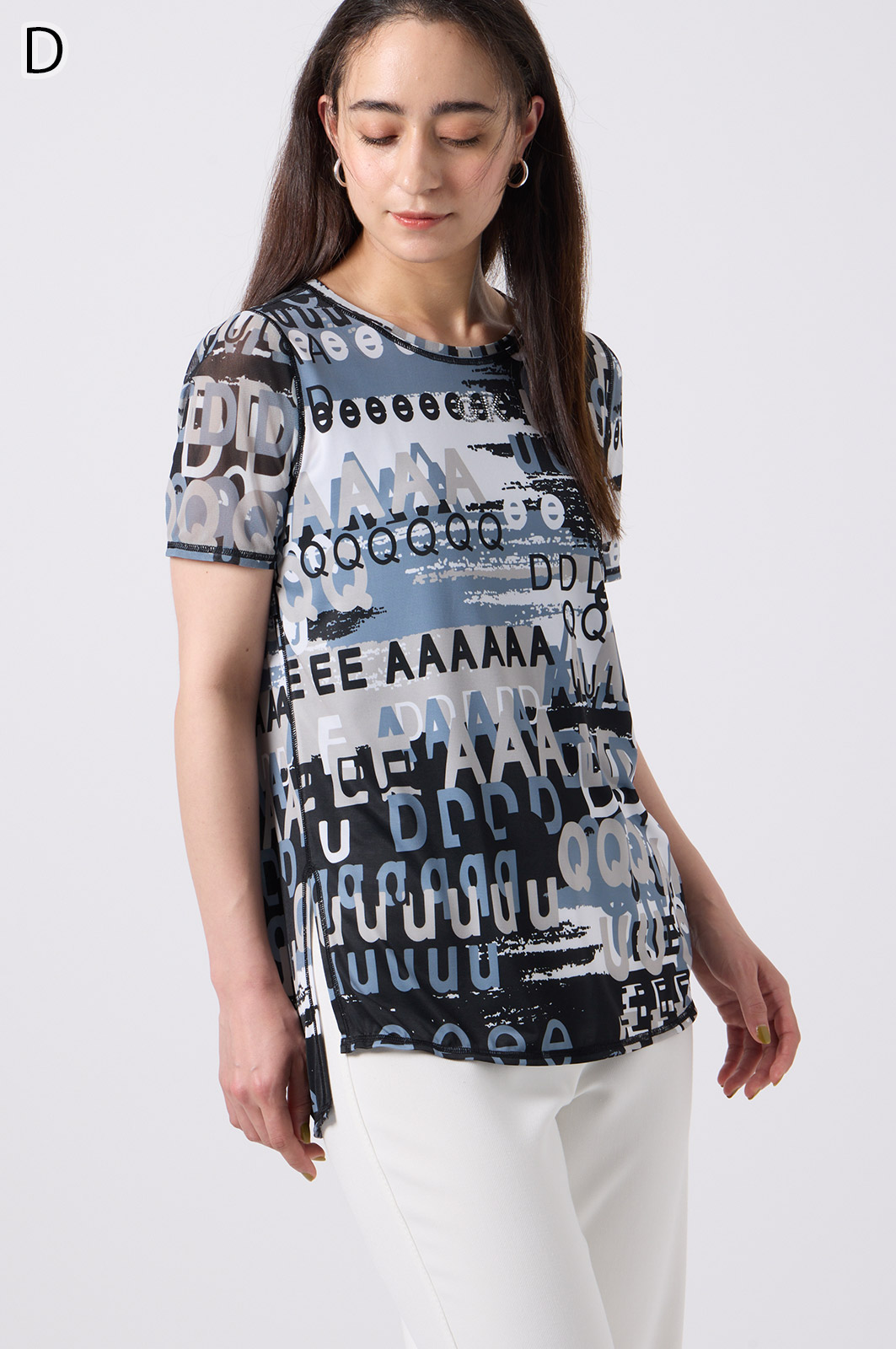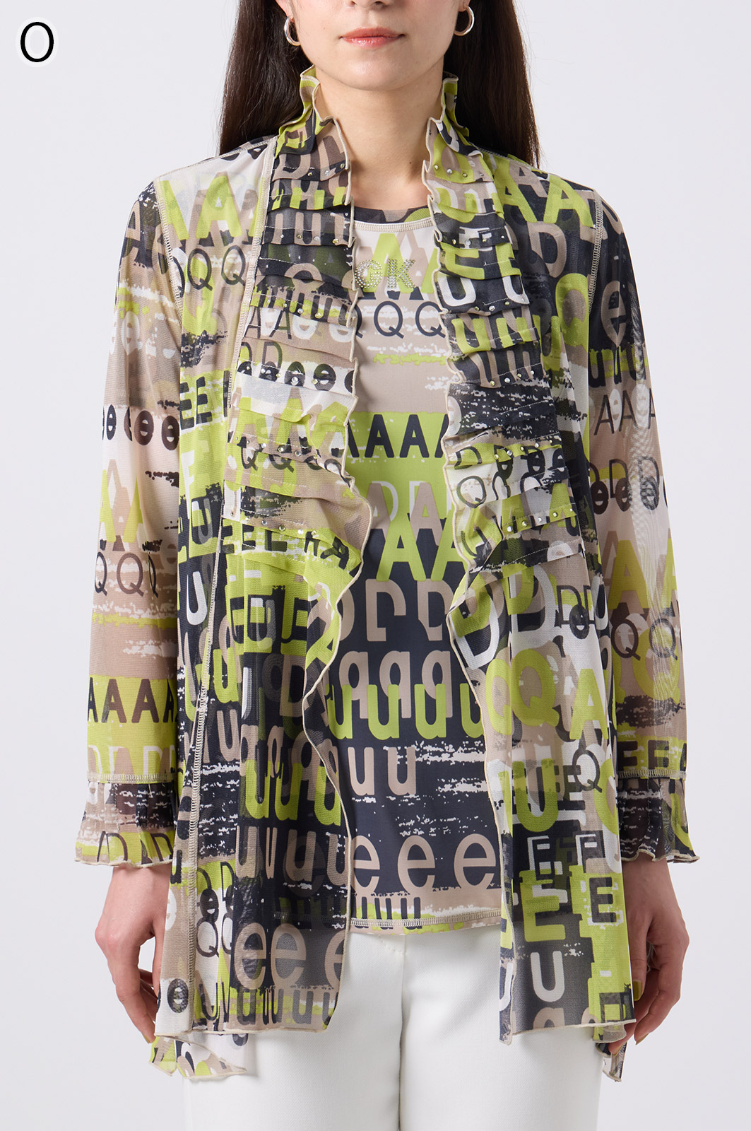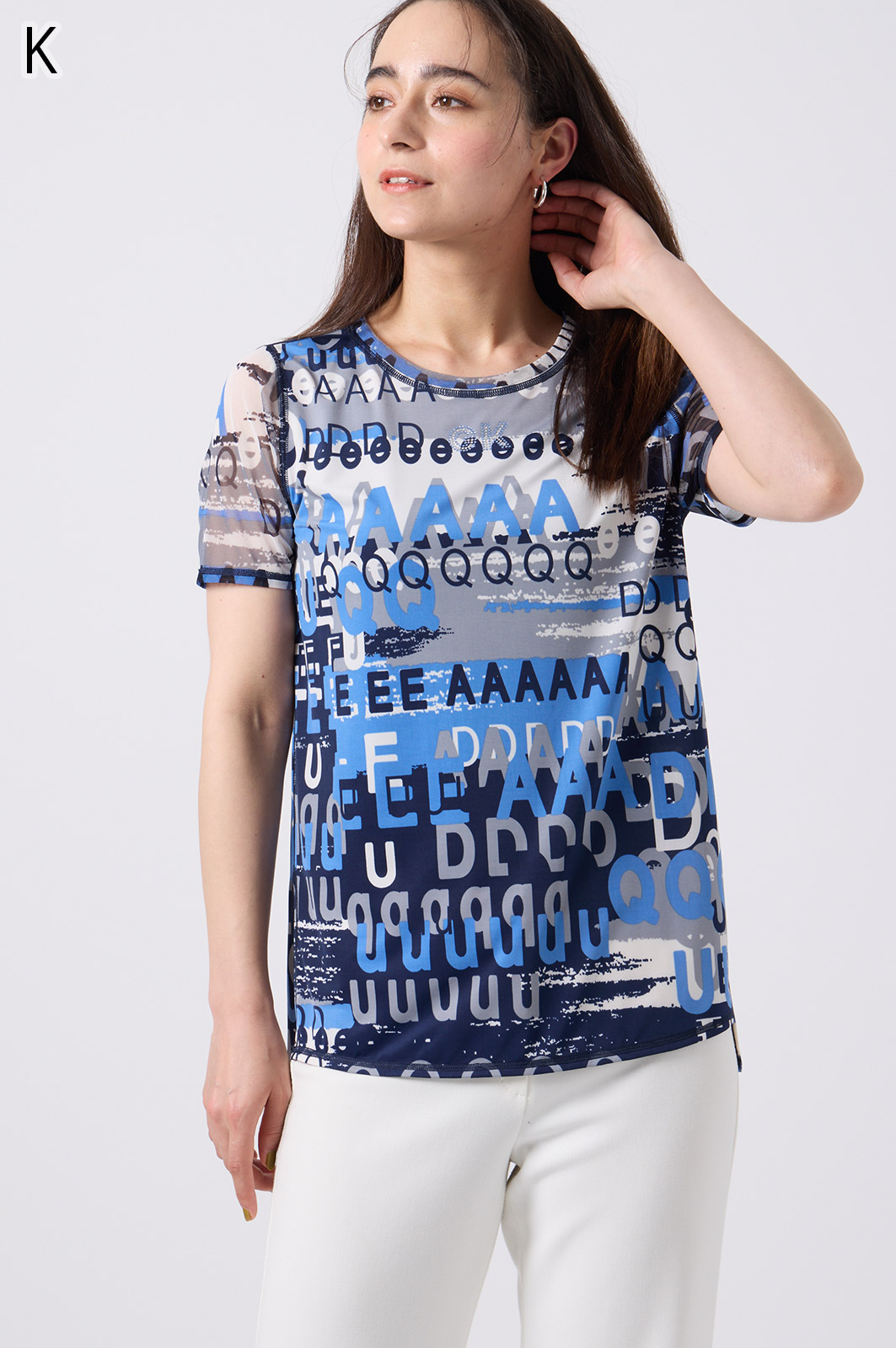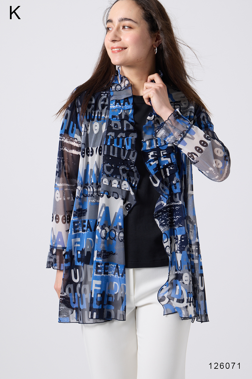 ロゴ入りの幾何学模様が映える軽やかな素材とニットを組み合わせた、Tシャツと羽織りブラウスのセット。重ねるだけで華やかな印象を演出できる着まわし便利なアイテムです。