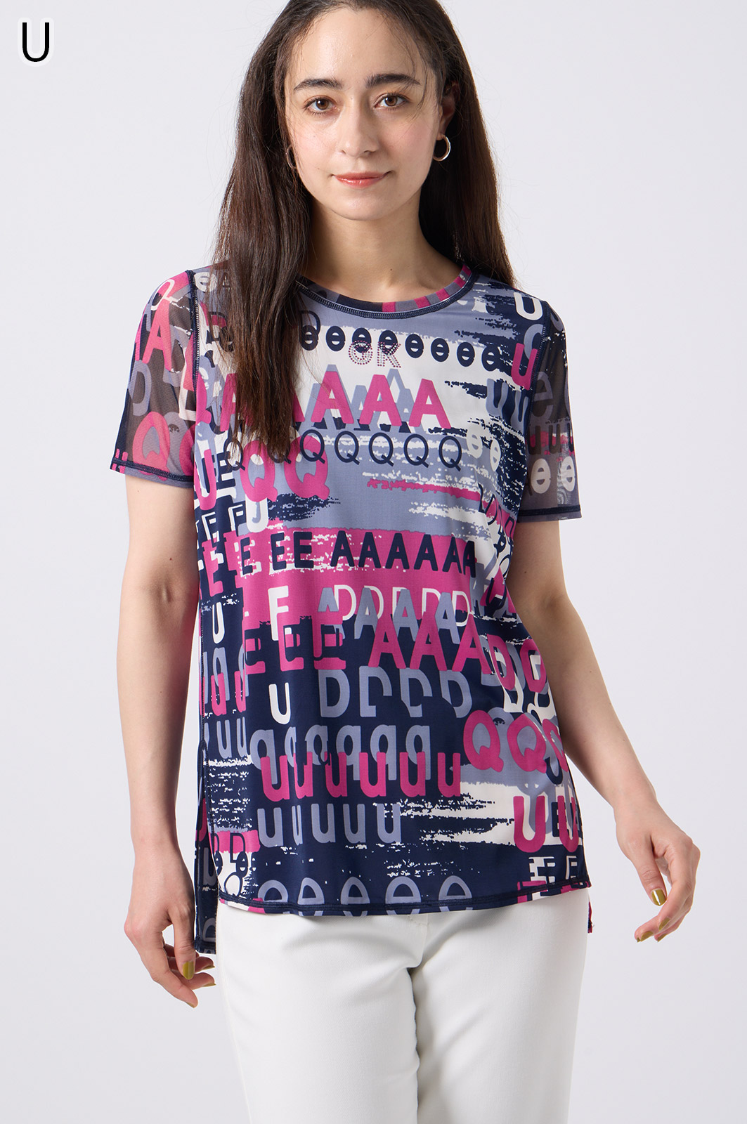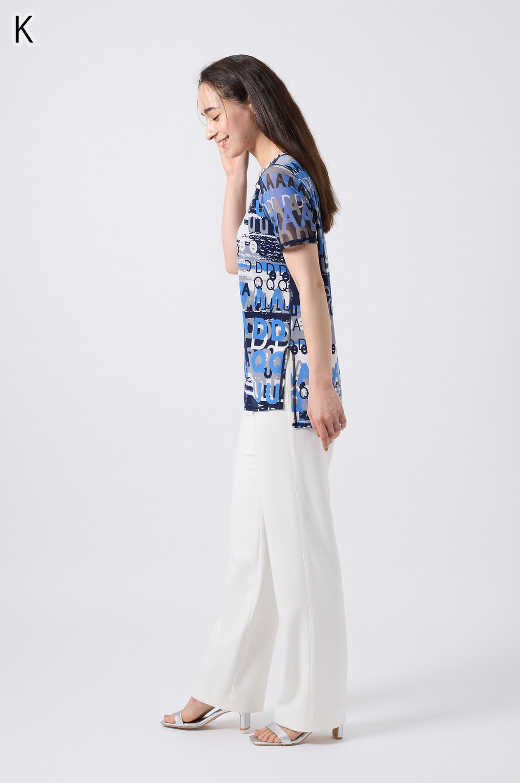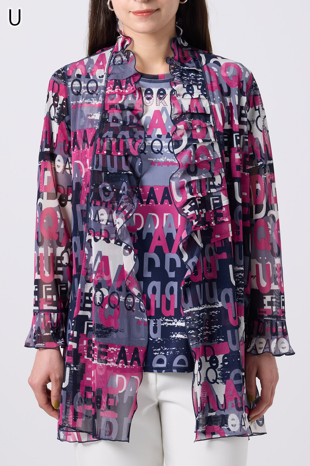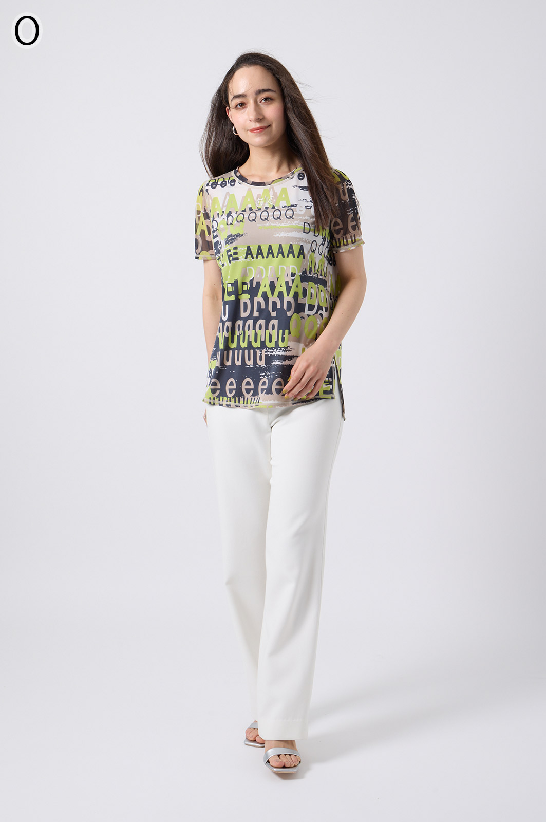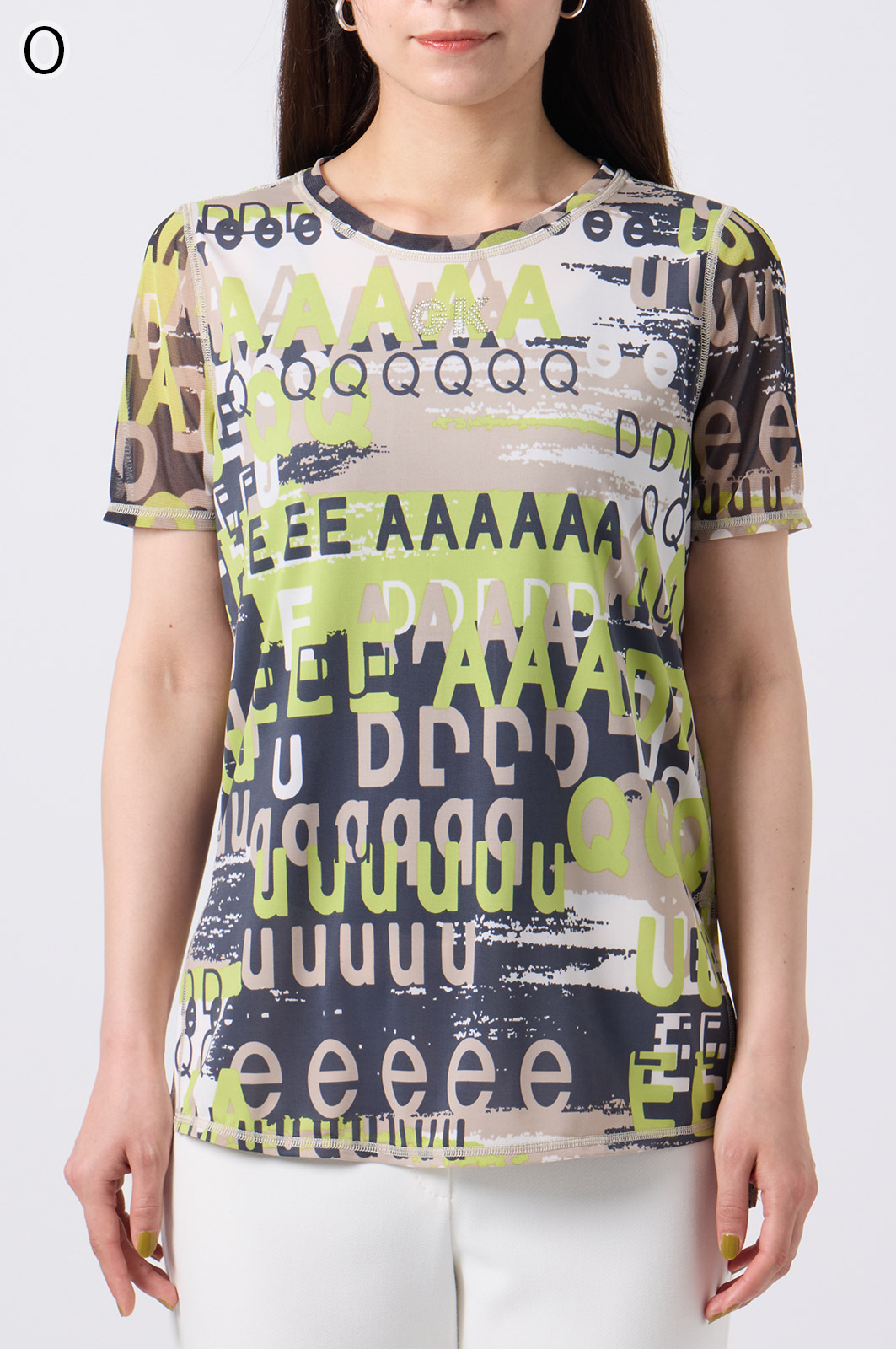 ロゴ入りの幾何学模様が映える軽やかな素材とニットを組み合わせた、Tシャツと羽織りブラウスのセット。重ねるだけで華やかな印象を演出できる着まわし便利なアイテムです。