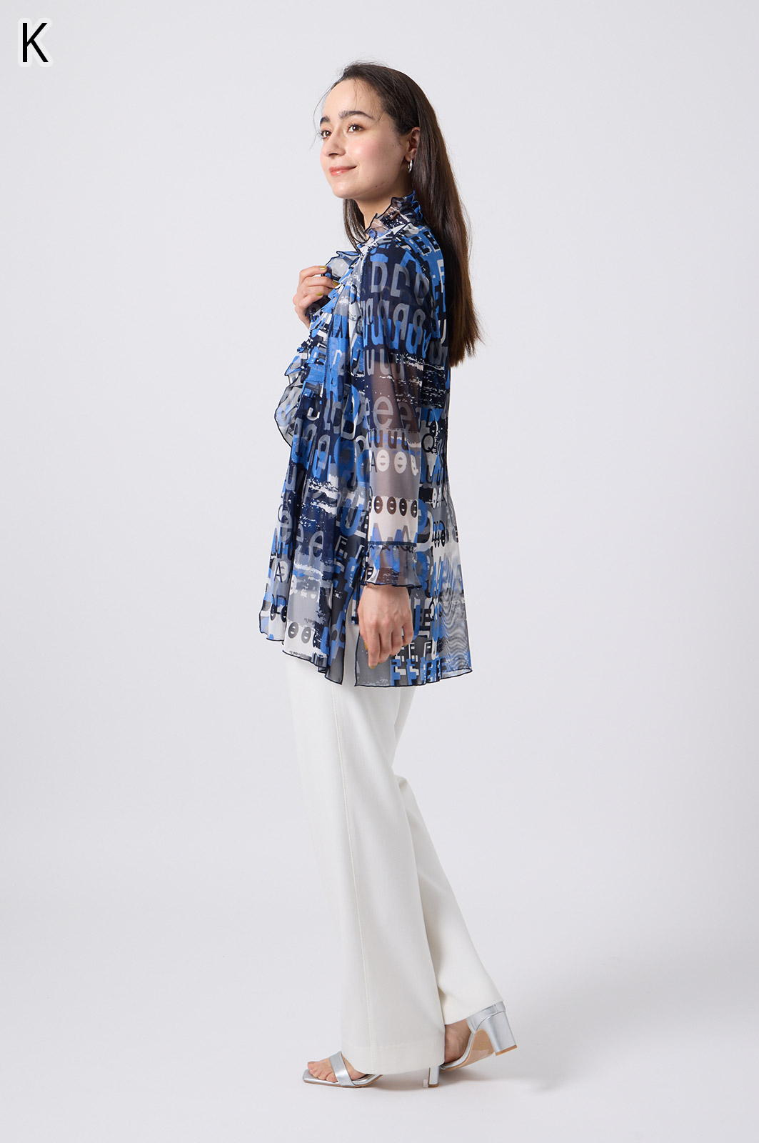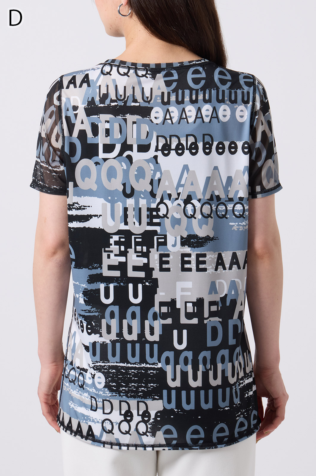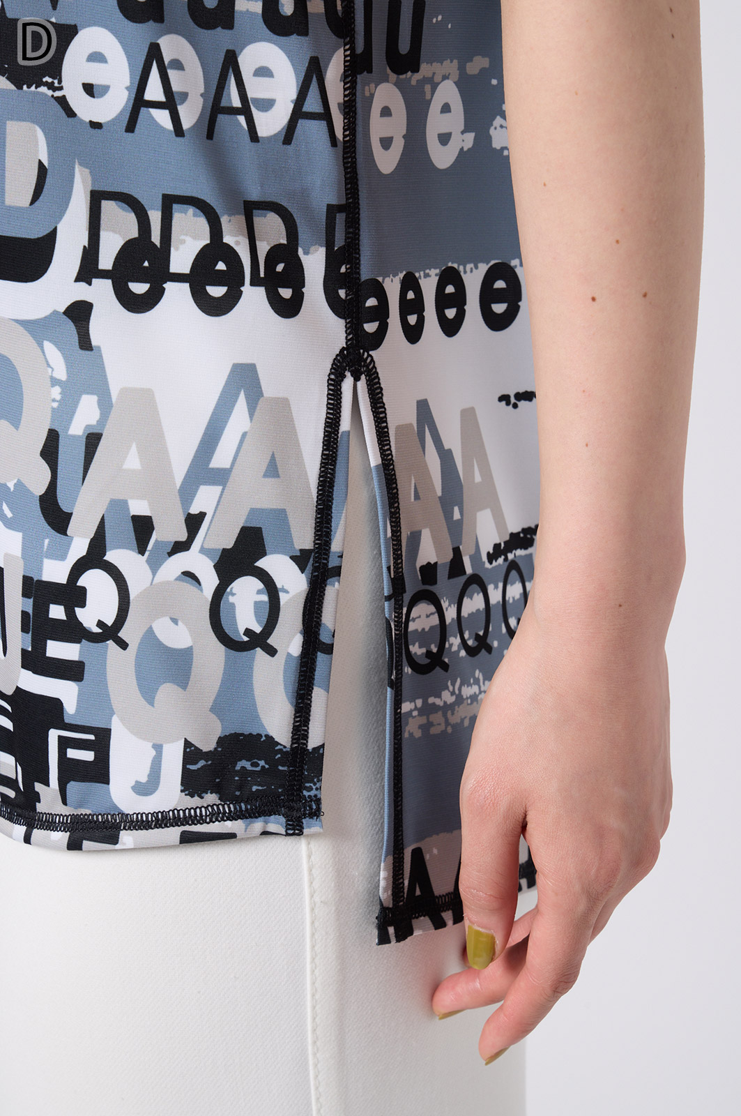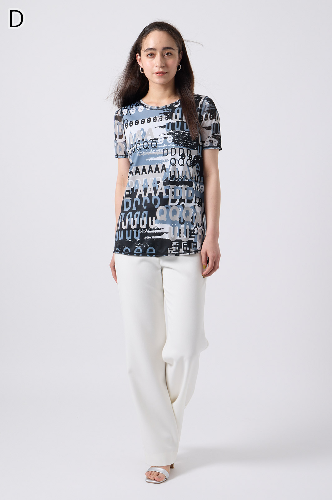 ロゴ入りの幾何学模様が映える軽やかな素材とニットを組み合わせた、Tシャツと羽織りブラウスのセット。重ねるだけで華やかな印象を演出できる着まわし便利なアイテムです。