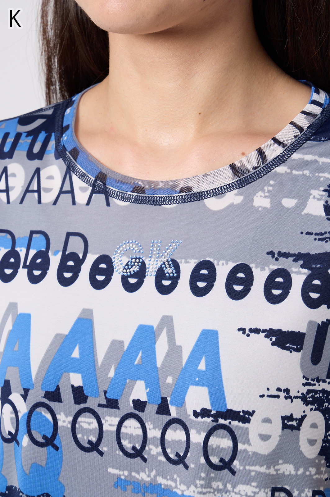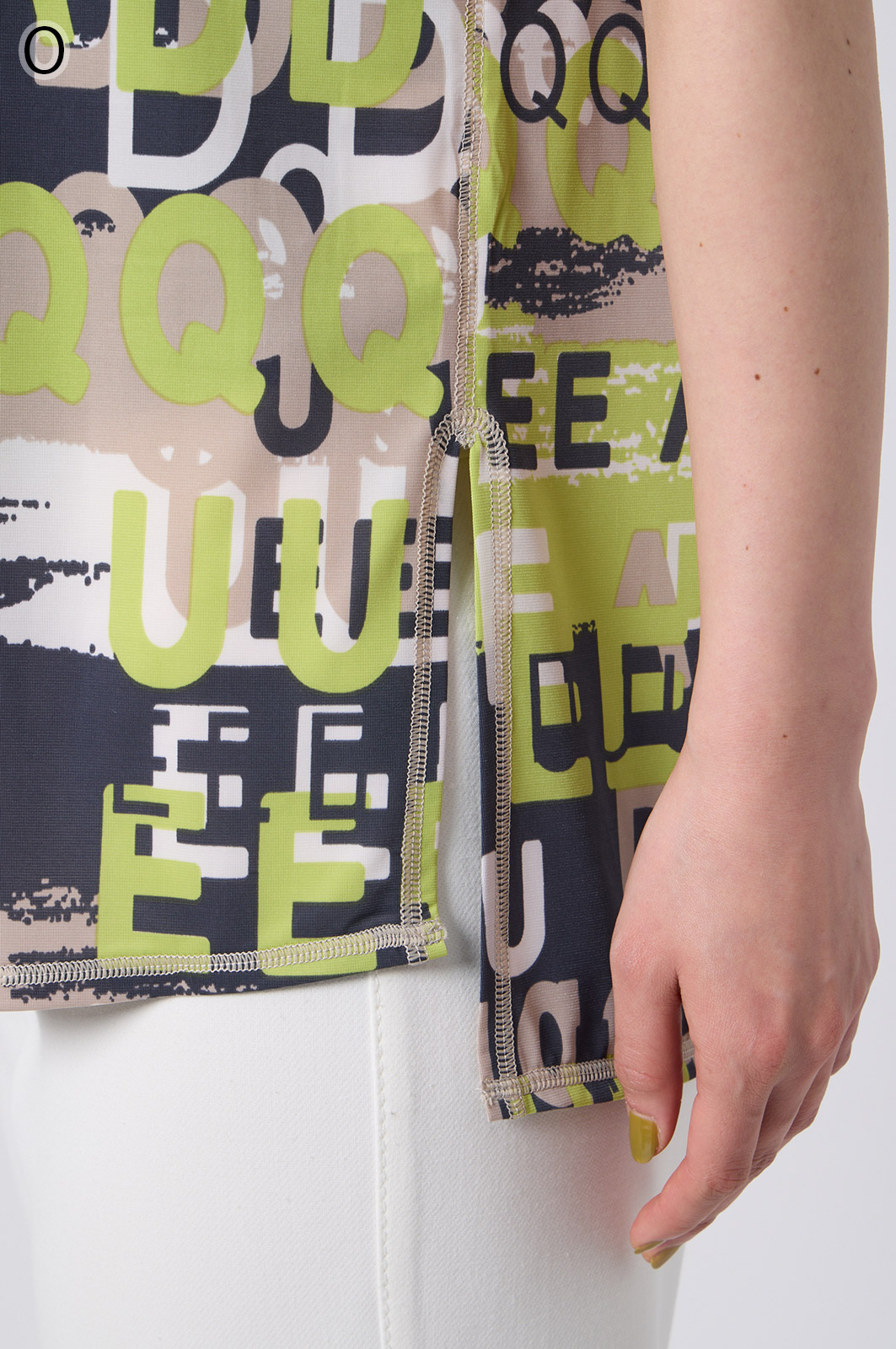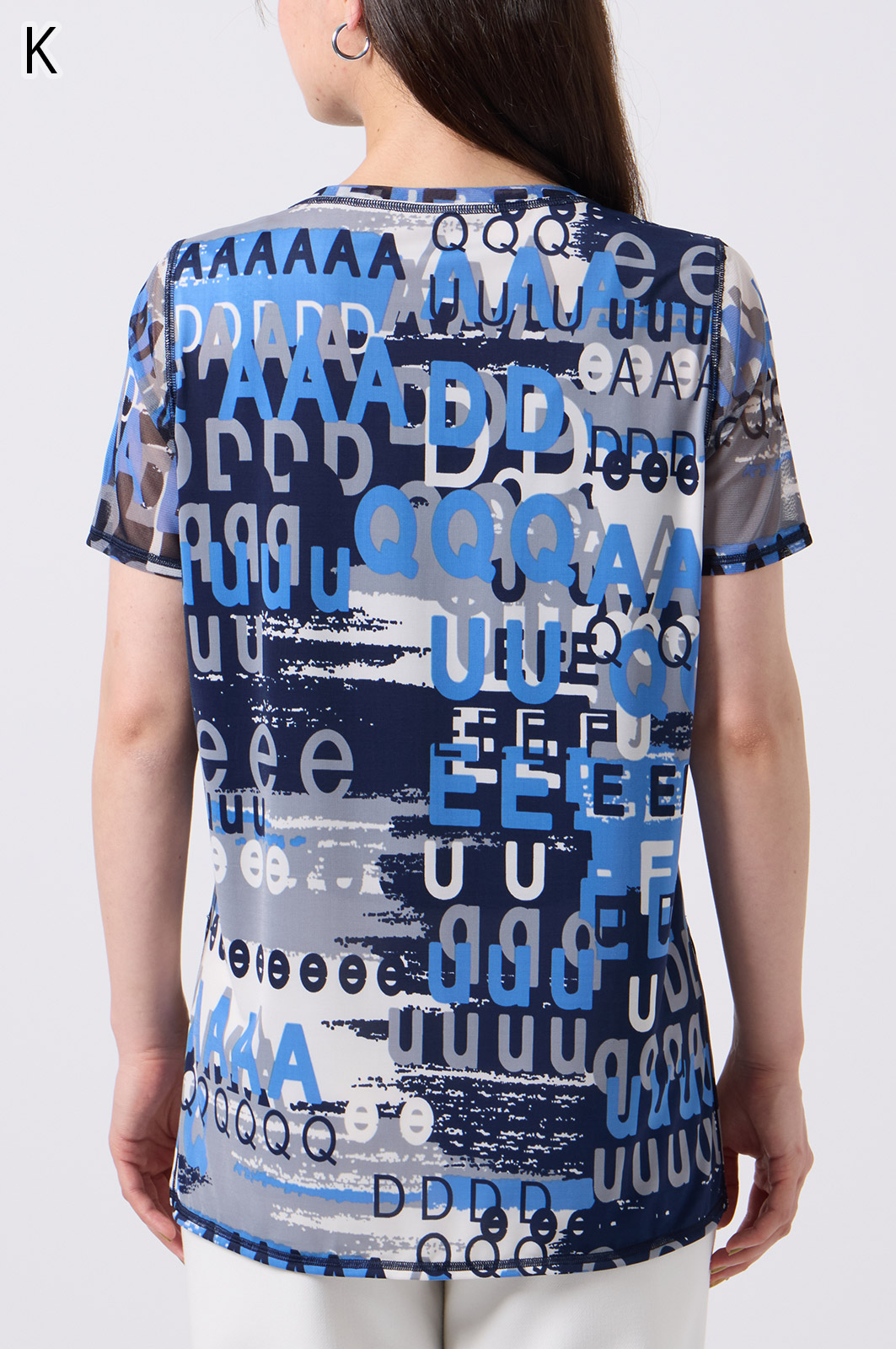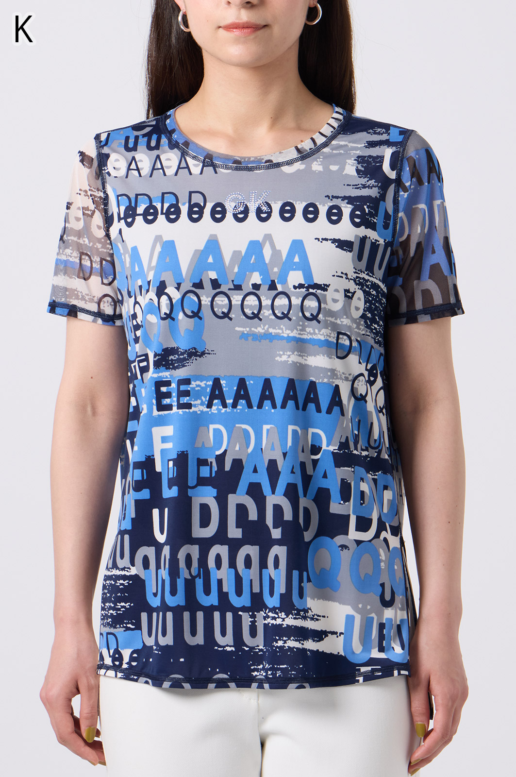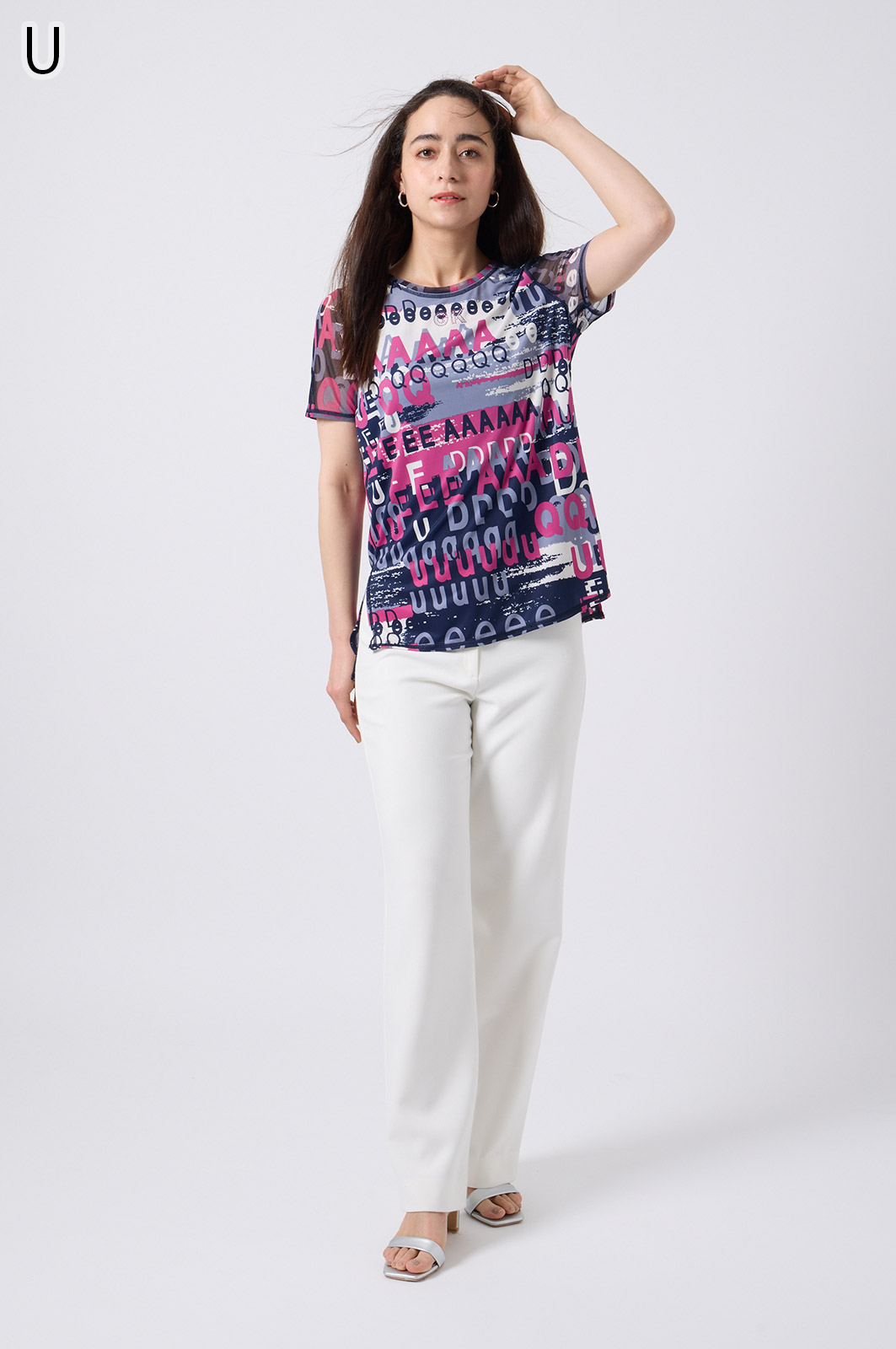 ロゴ入りの幾何学模様が映える軽やかな素材とニットを組み合わせた、Tシャツと羽織りブラウスのセット。重ねるだけで華やかな印象を演出できる着まわし便利なアイテムです。