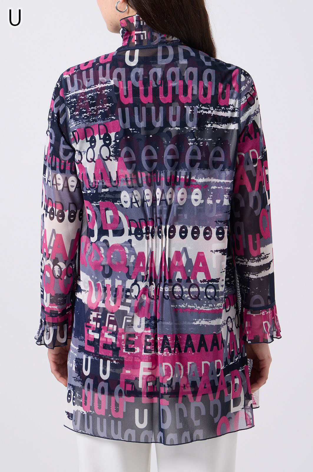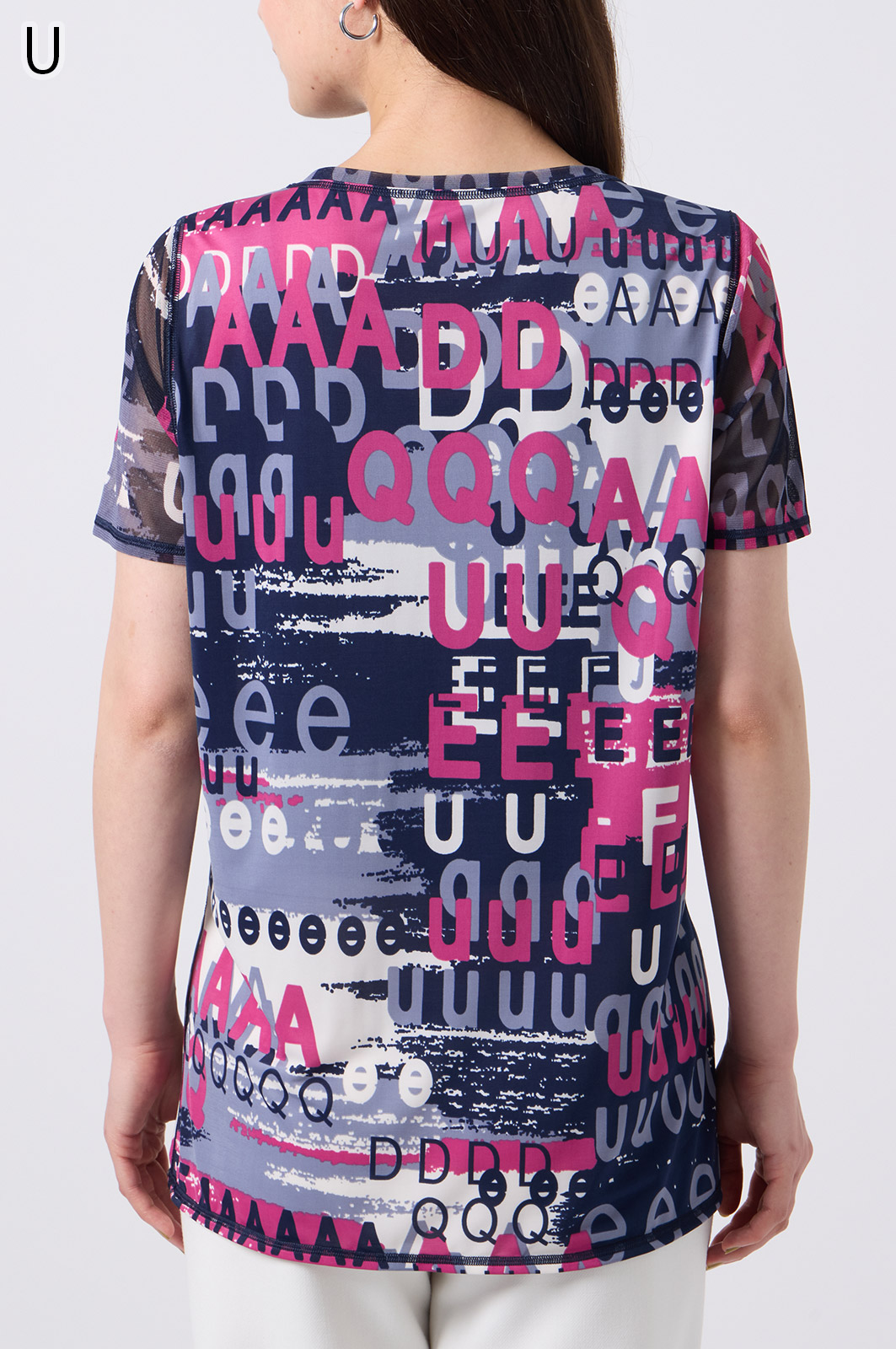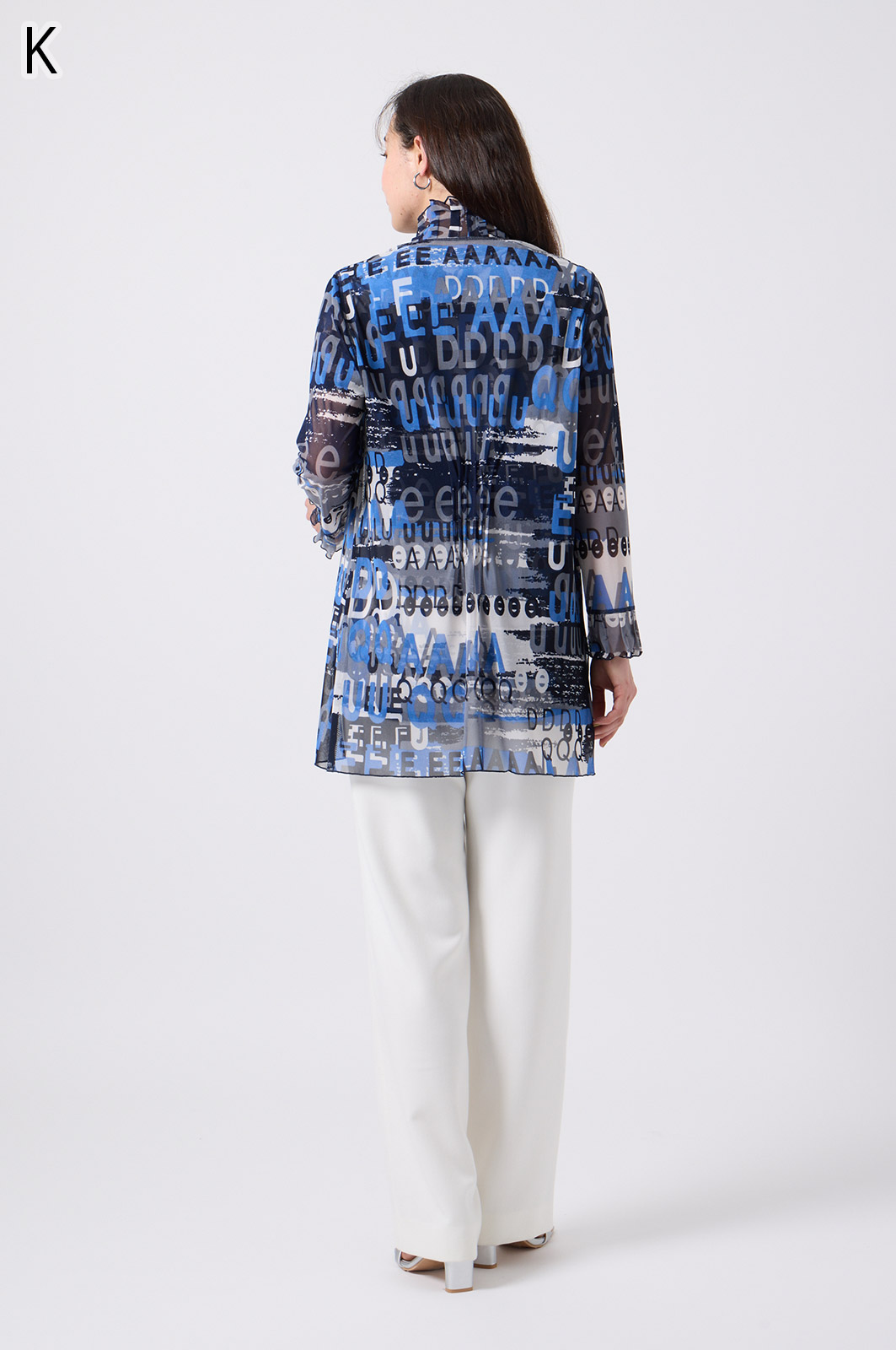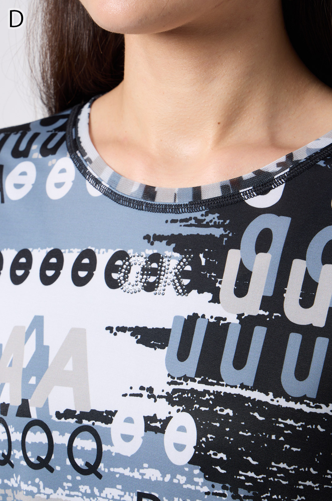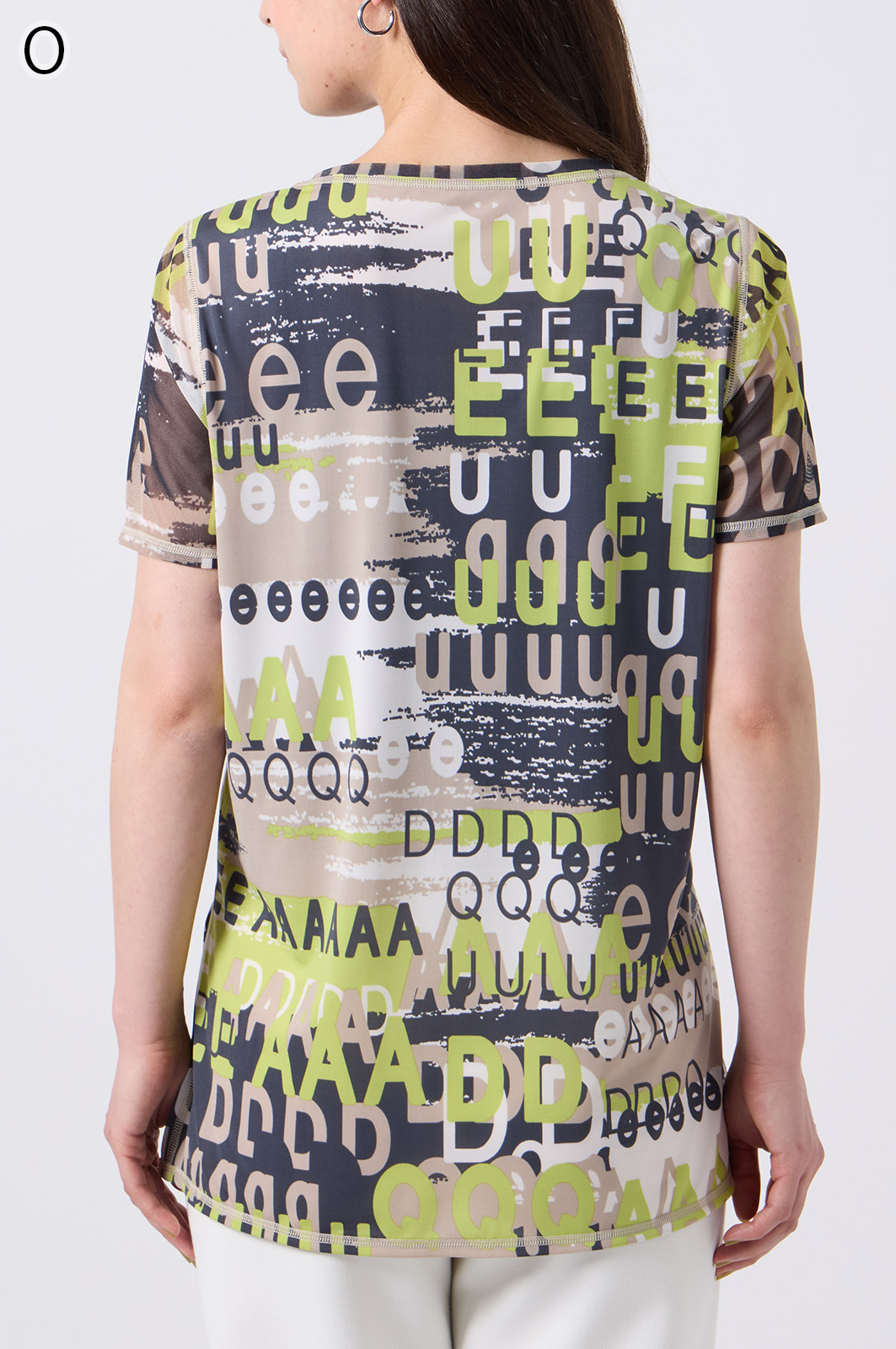 ロゴ入りの幾何学模様が映える軽やかな素材とニットを組み合わせた、Tシャツと羽織りブラウスのセット。重ねるだけで華やかな印象を演出できる着まわし便利なアイテムです。