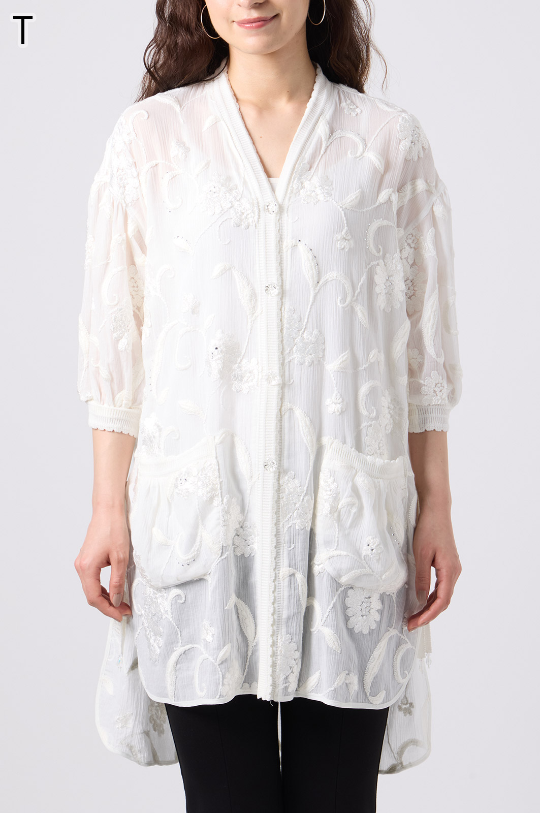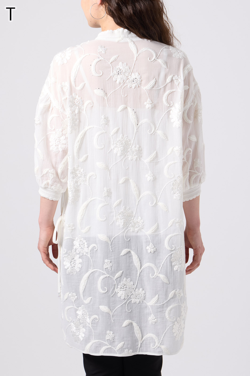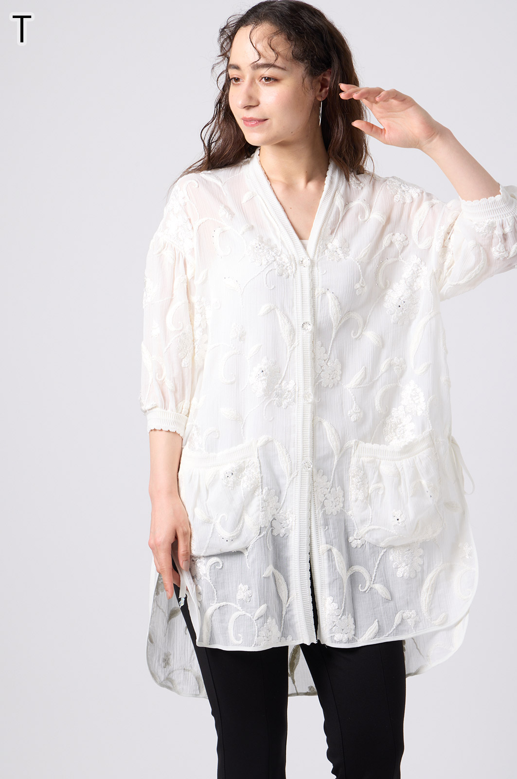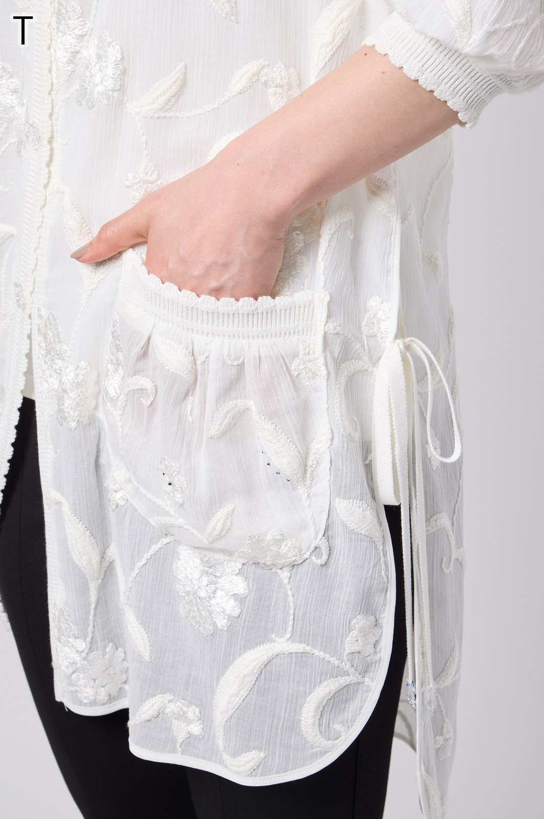 軽やかな綿混素材に、立体感のある花の刺しゅうが華やかな印象。さらっと羽織れるニット使いで、着心地も抜群。イタリー製生地ならではの上品さが光る、大人のためのブラウスです。