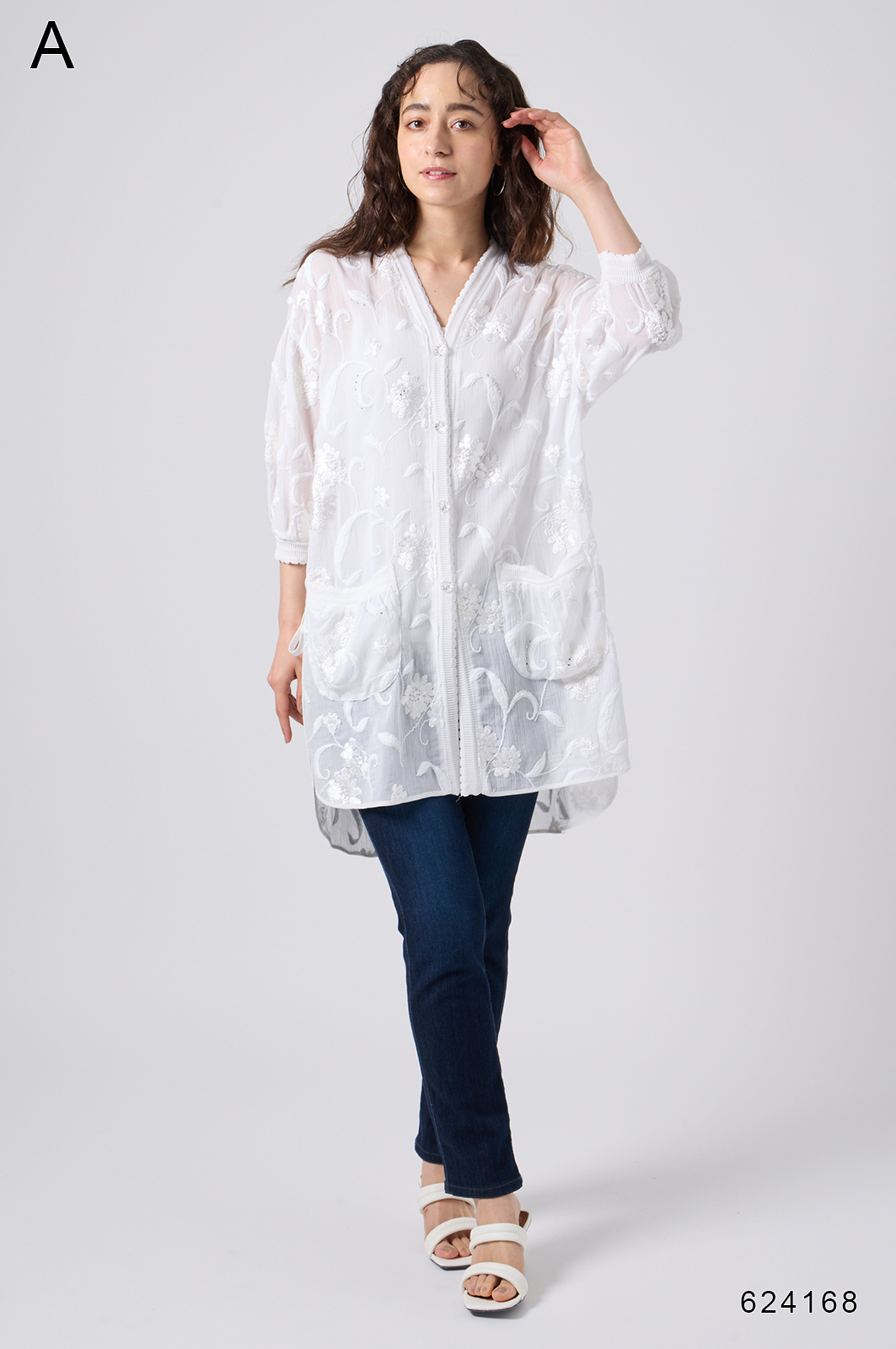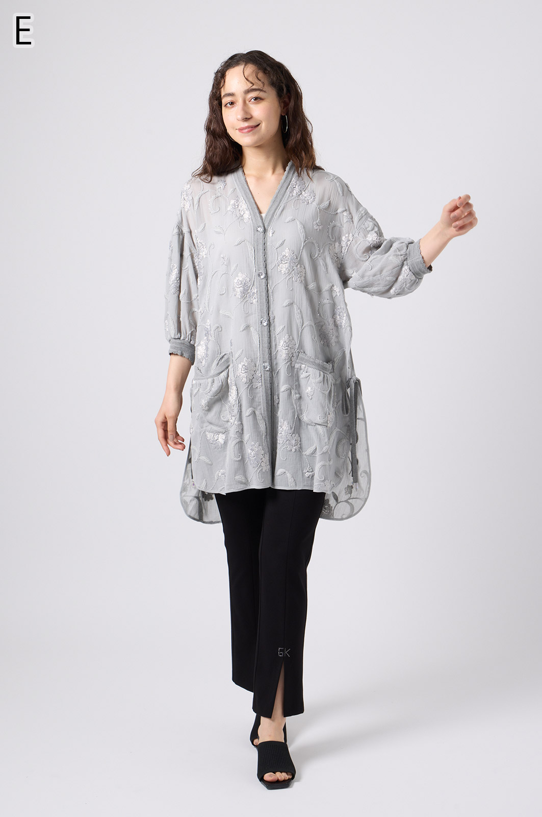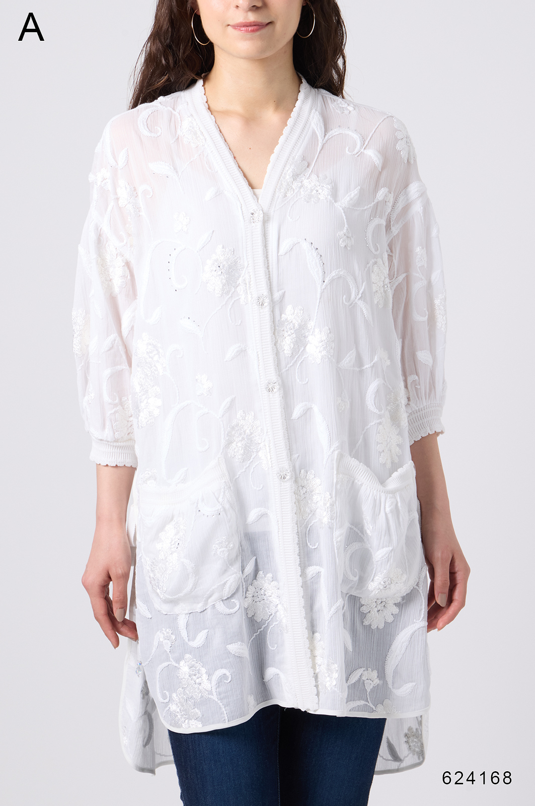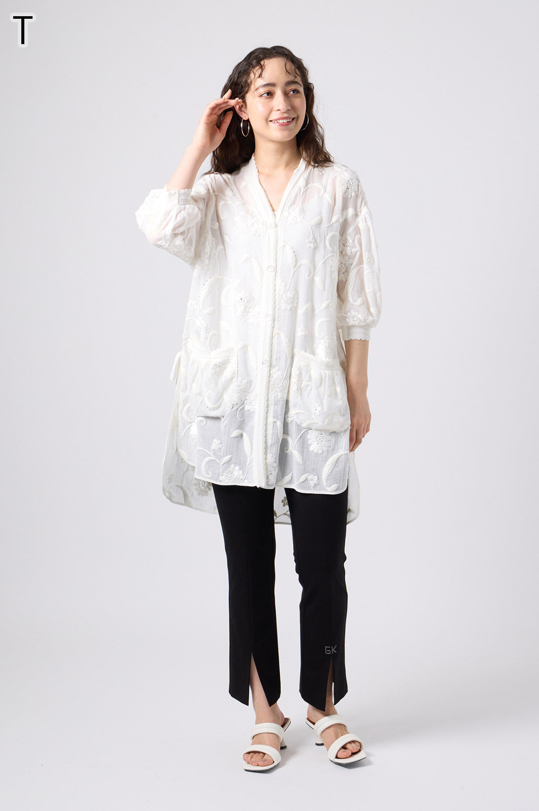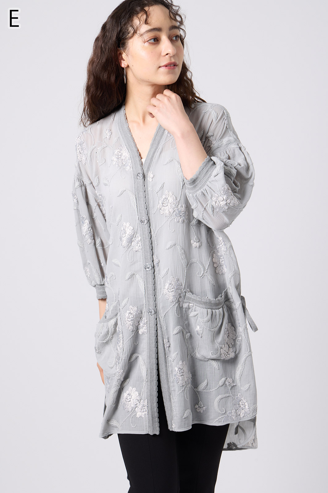 軽やかな綿混素材に、立体感のある花の刺しゅうが華やかな印象。さらっと羽織れるニット使いで、着心地も抜群。イタリー製生地ならではの上品さが光る、大人のためのブラウスです。