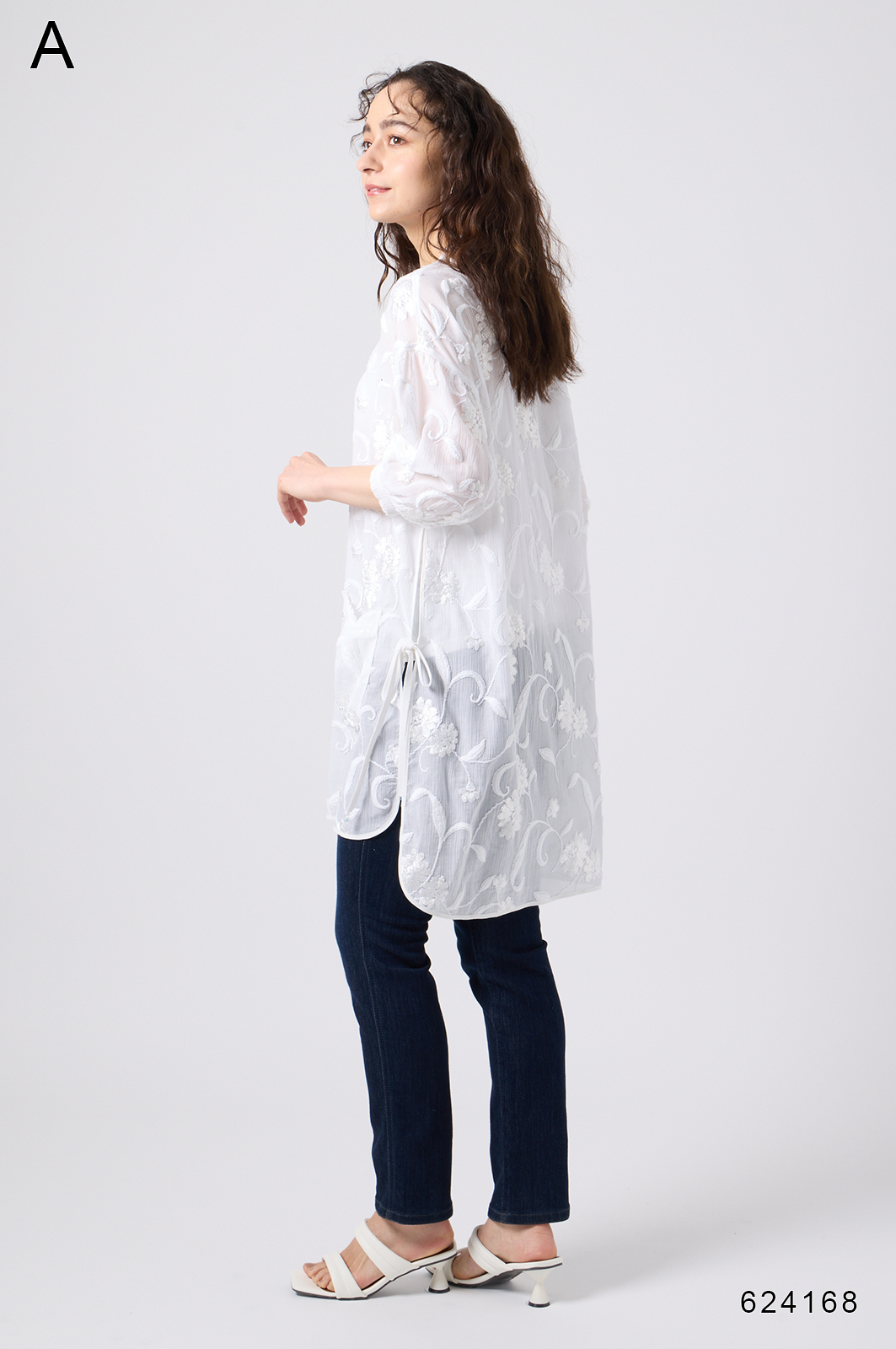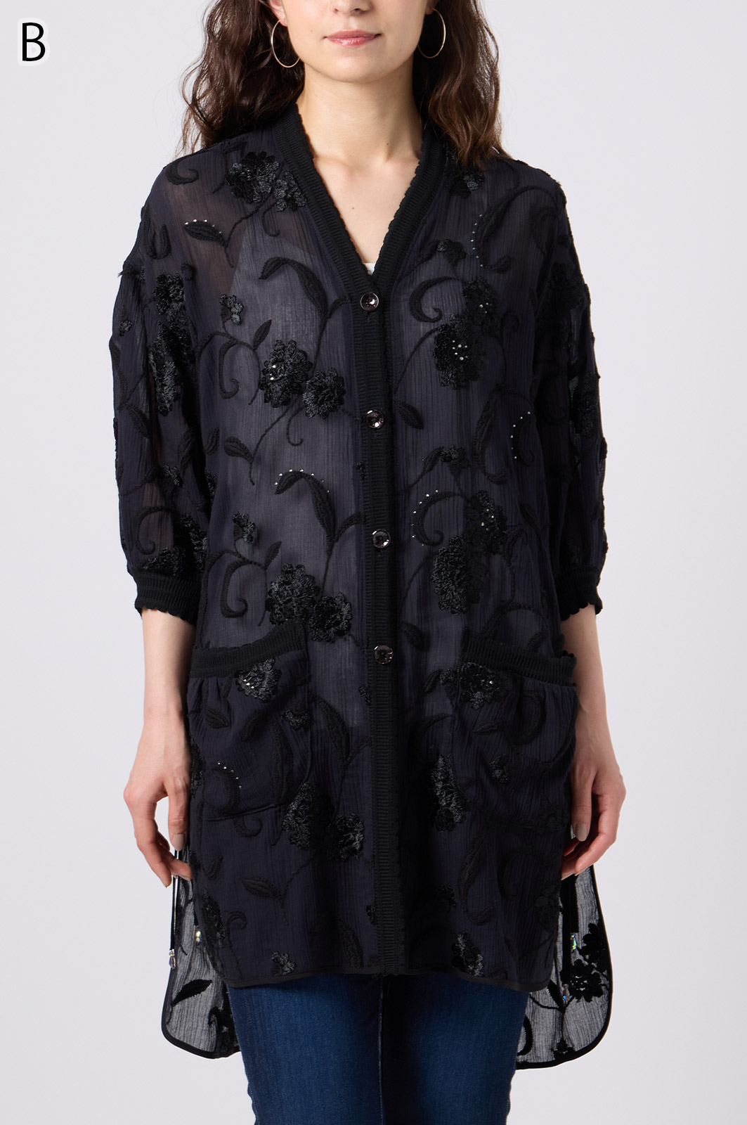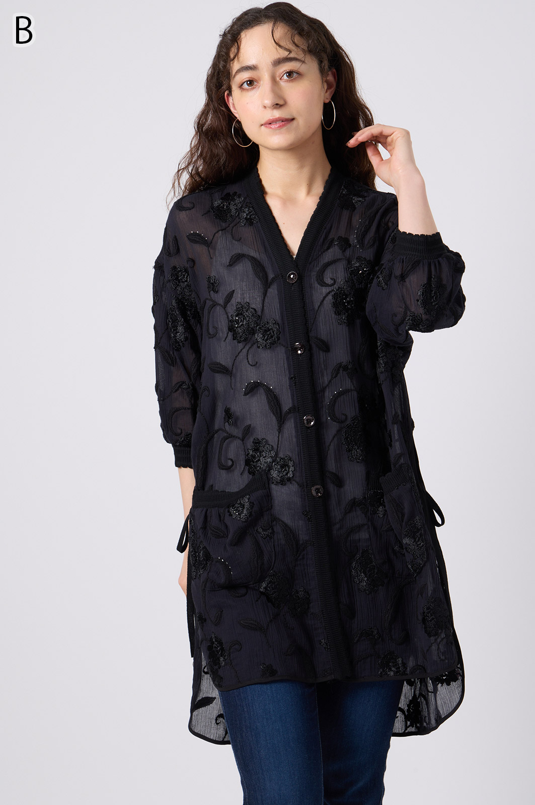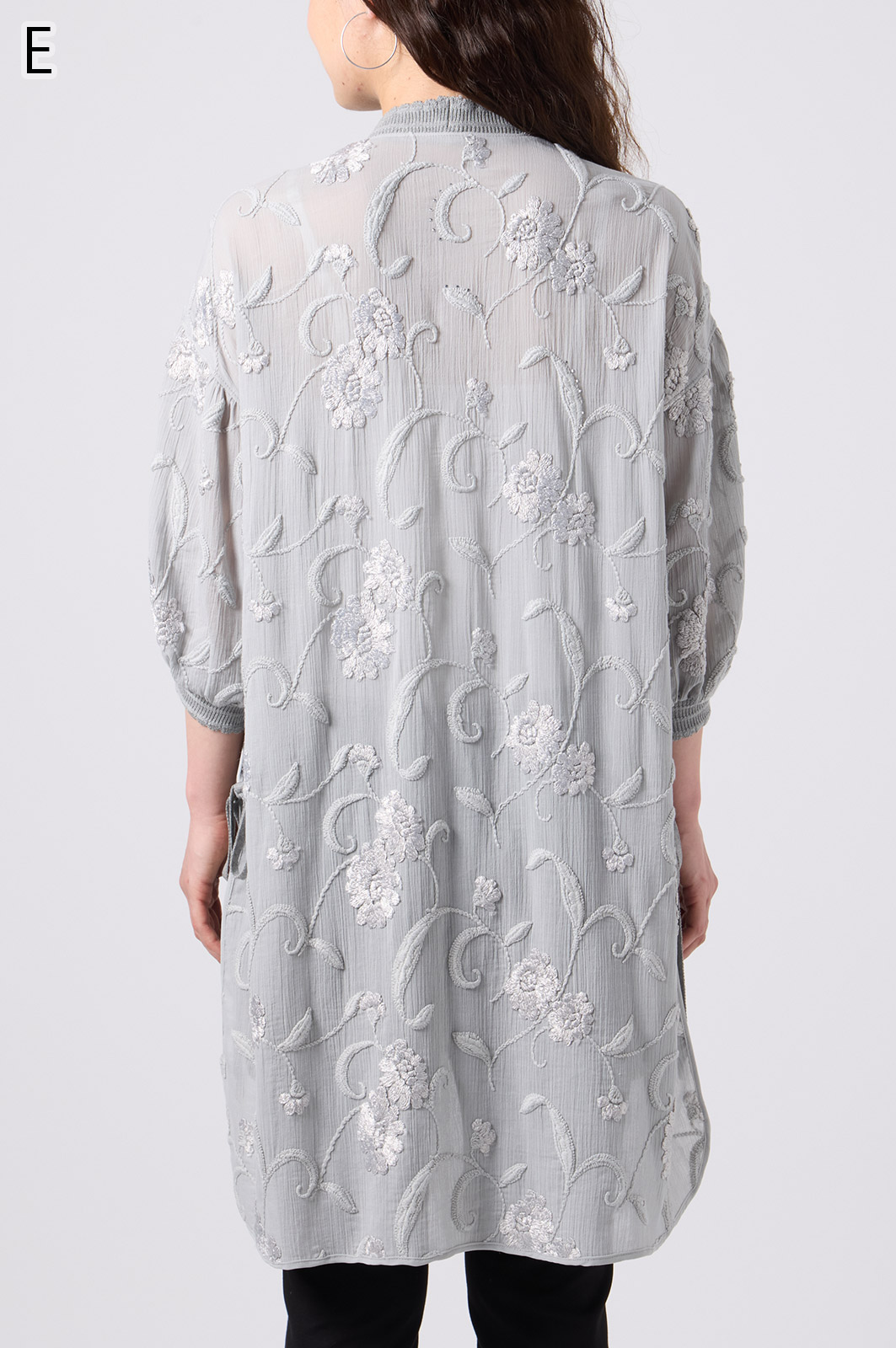 軽やかな綿混素材に、立体感のある花の刺しゅうが華やかな印象。さらっと羽織れるニット使いで、着心地も抜群。イタリー製生地ならではの上品さが光る、大人のためのブラウスです。