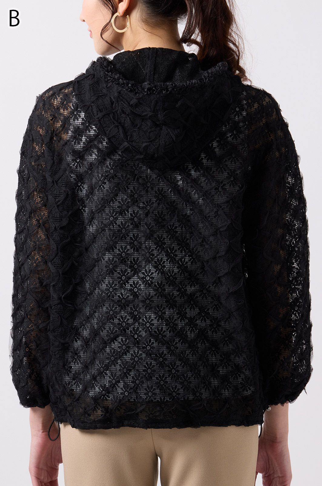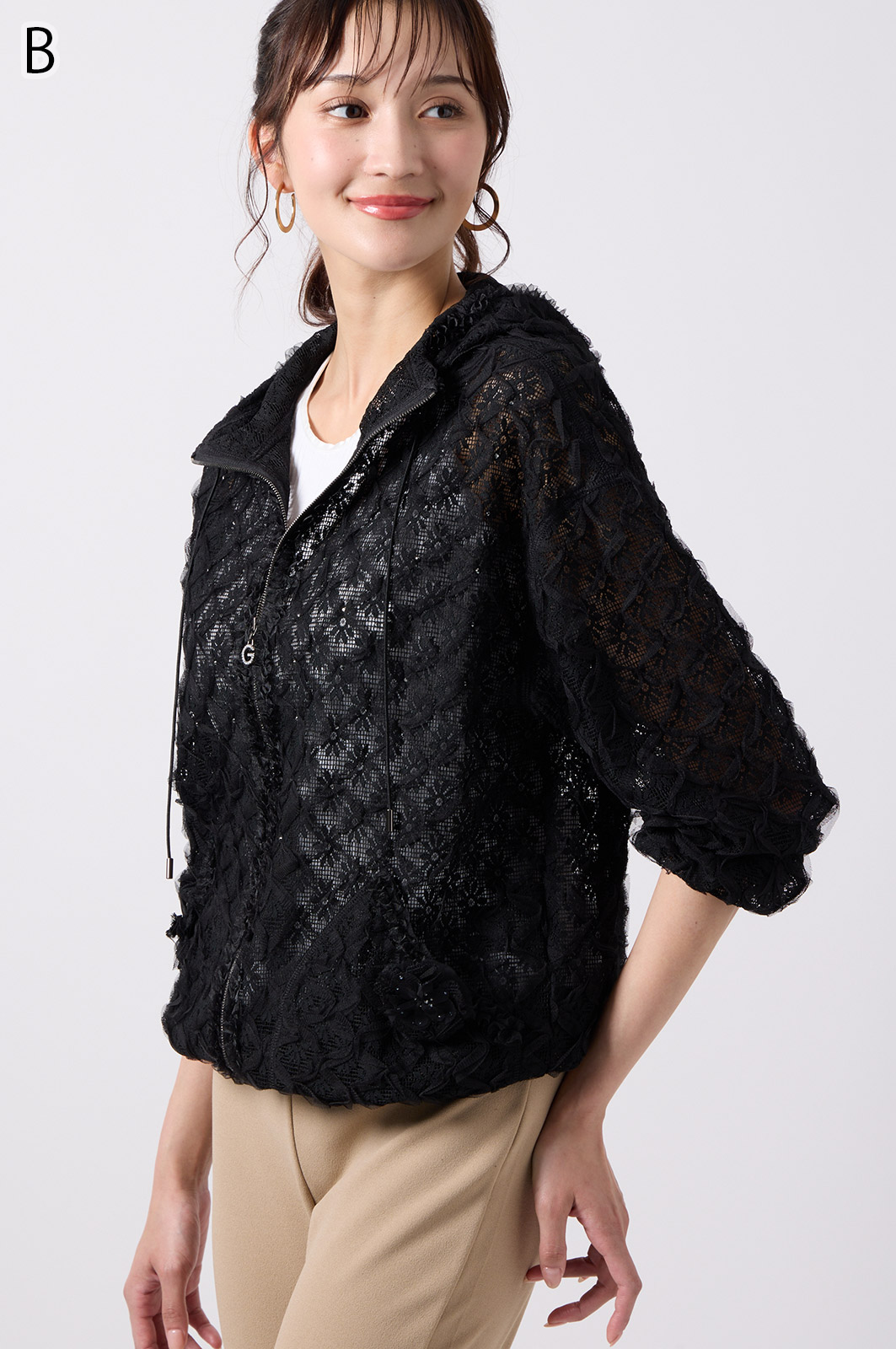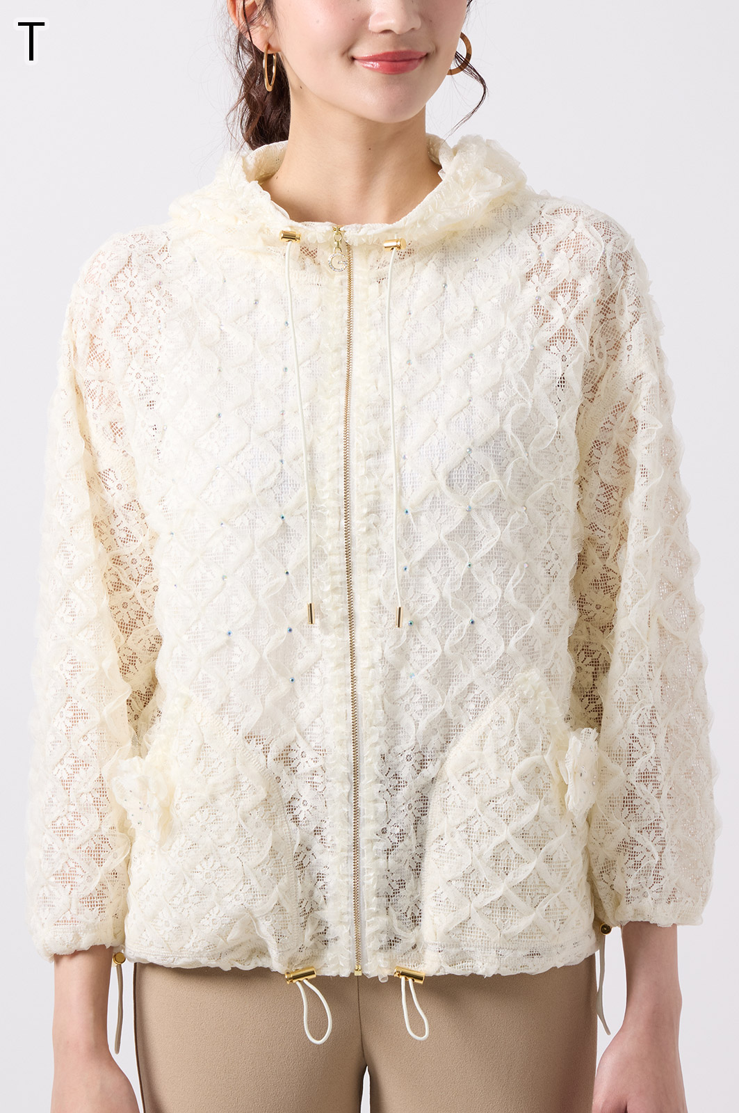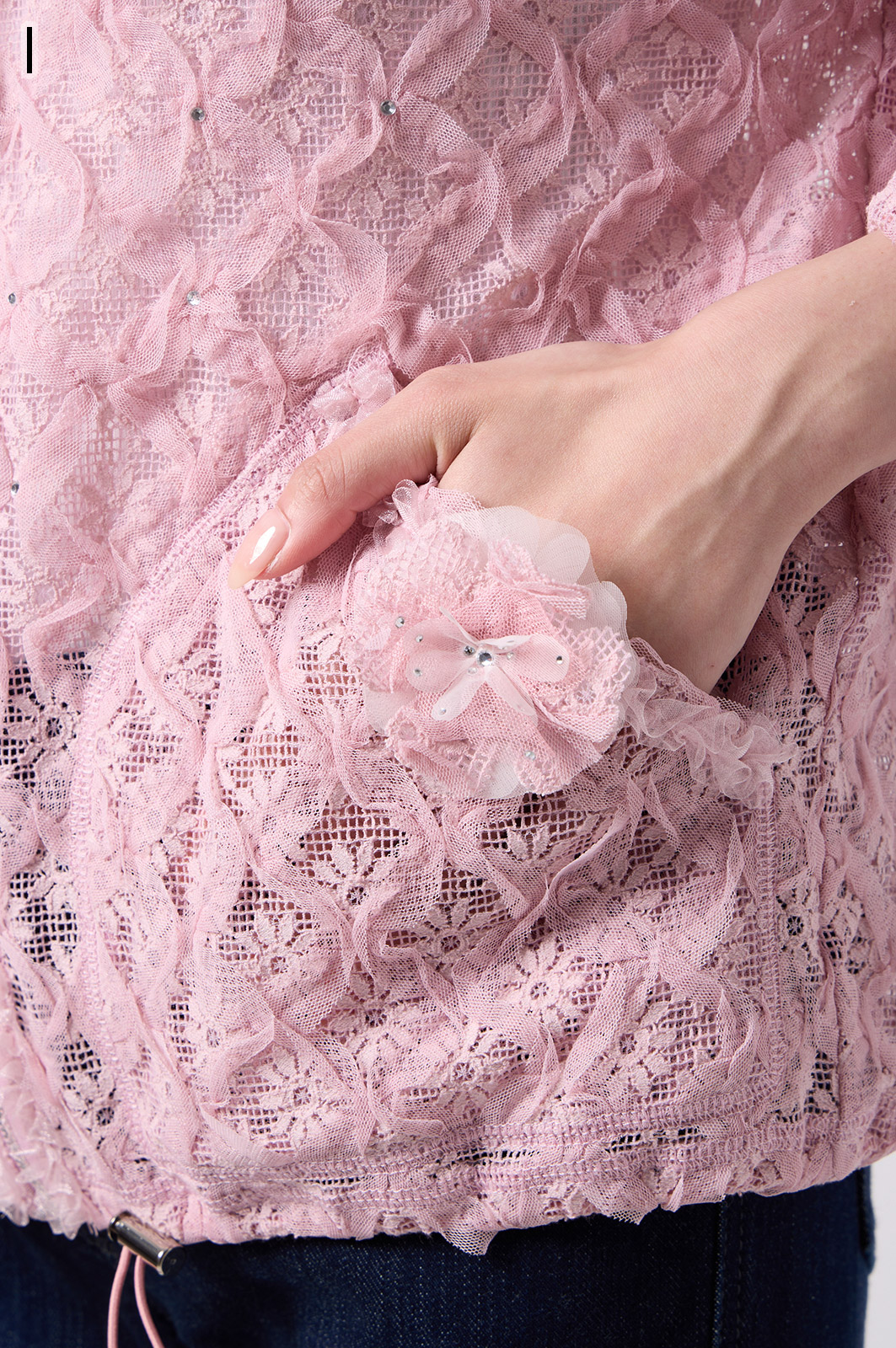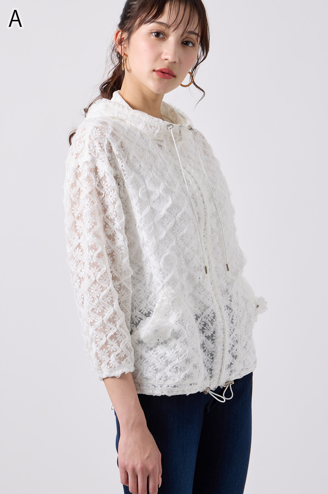 レースの上にメッシュ生地を交差させて重ねた、立体感あるデザイン。カジュアルなパーカーを女性らしくやわらかな雰囲気に仕上げました。