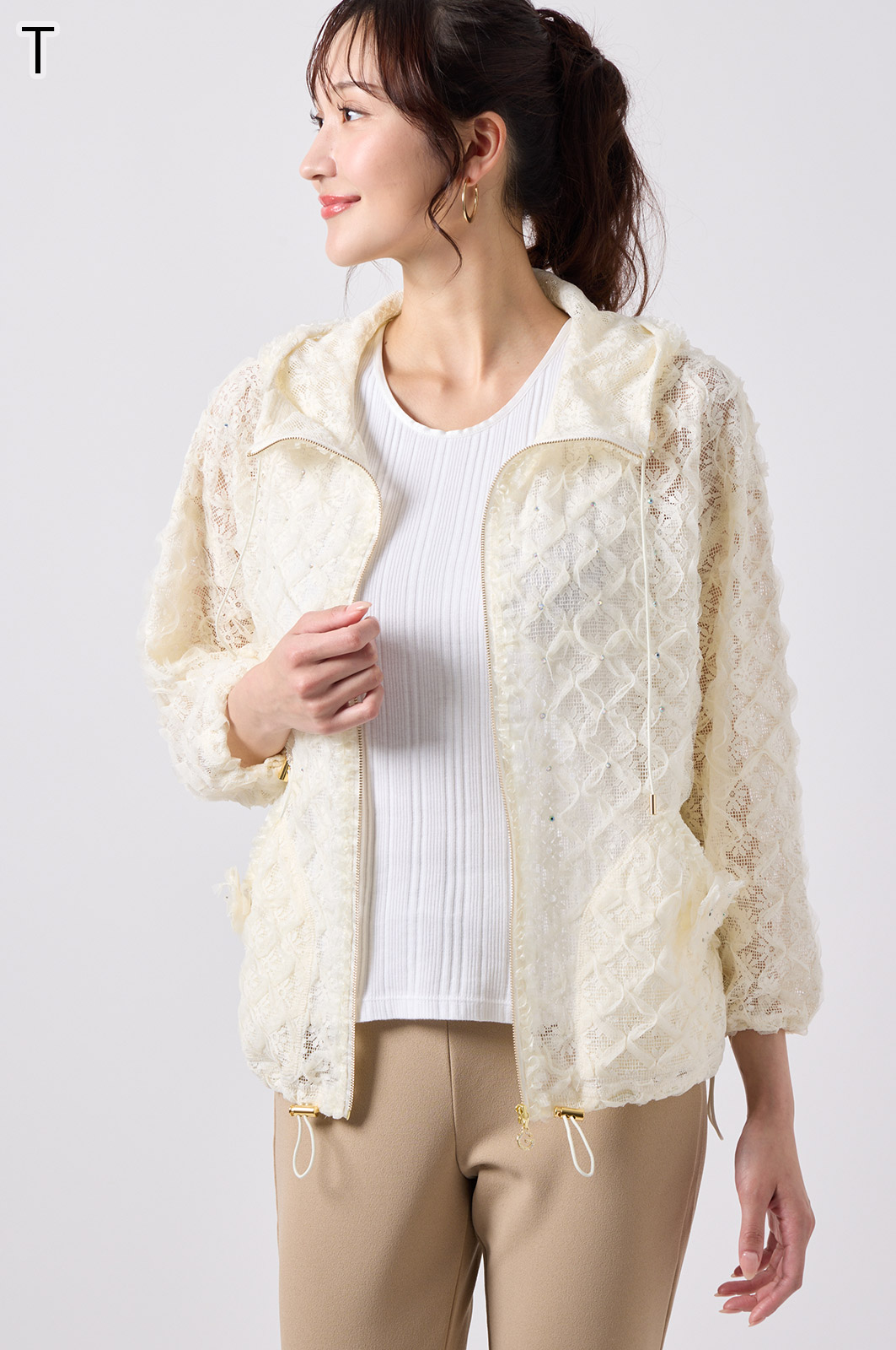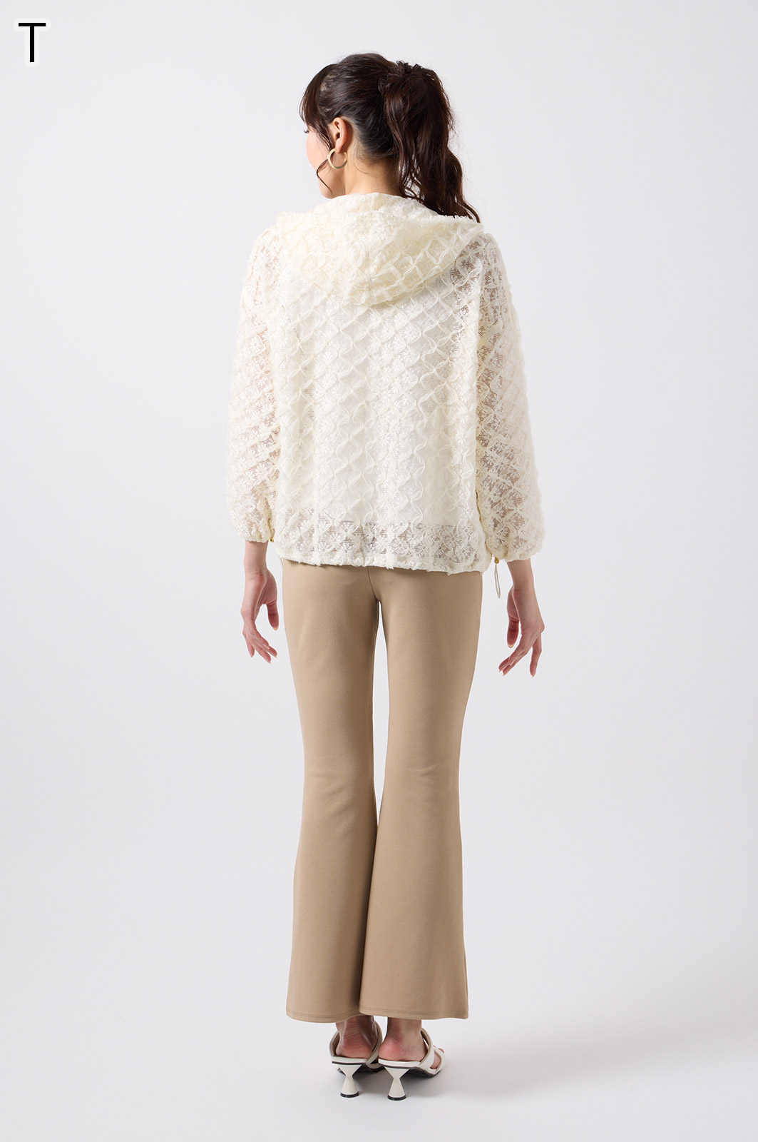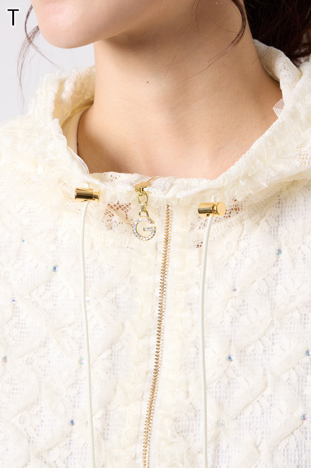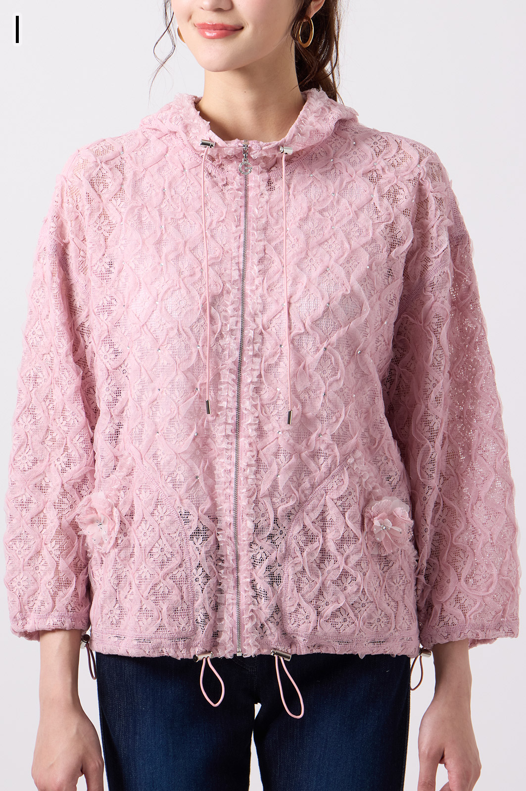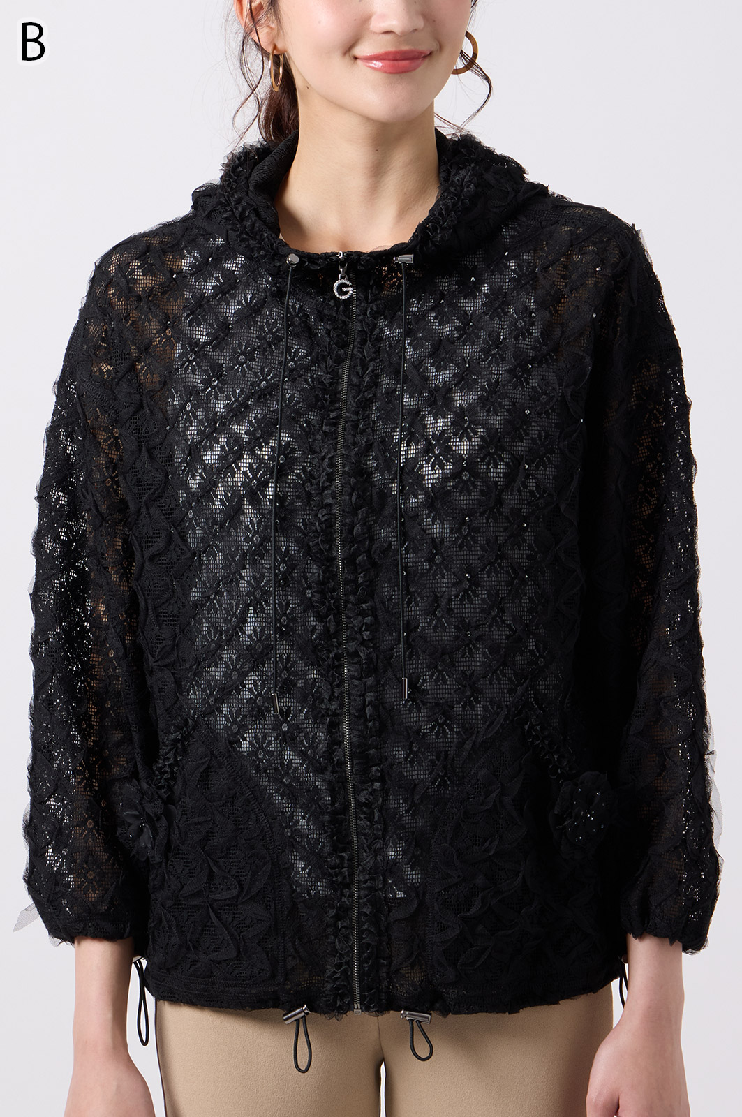 レースの上にメッシュ生地を交差させて重ねた、立体感あるデザイン。カジュアルなパーカーを女性らしくやわらかな雰囲気に仕上げました。