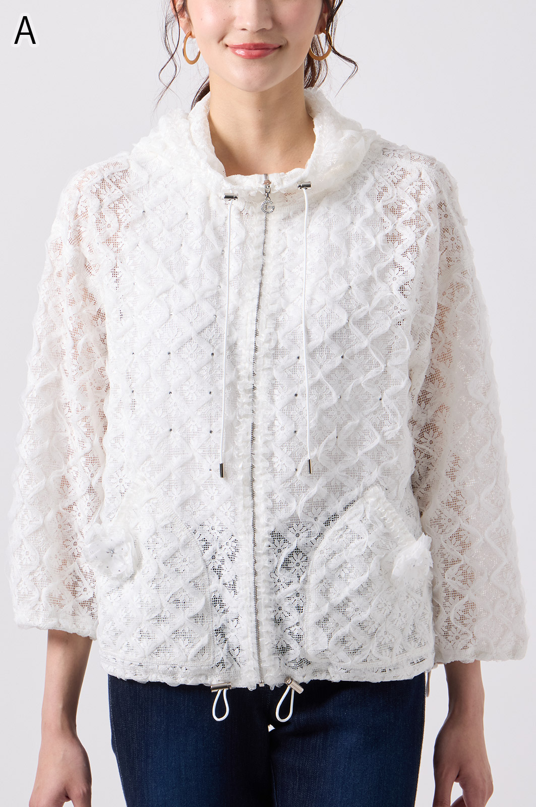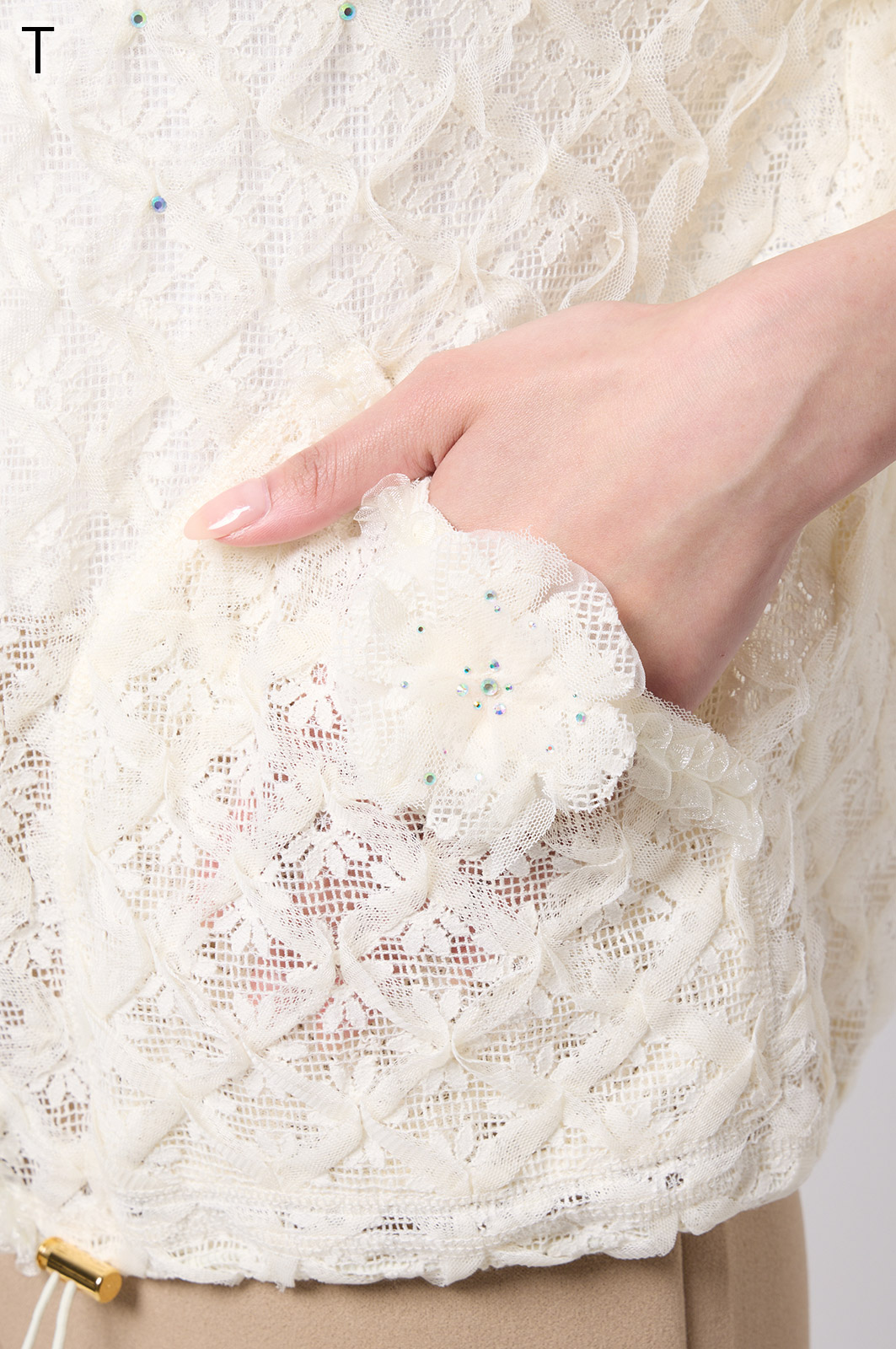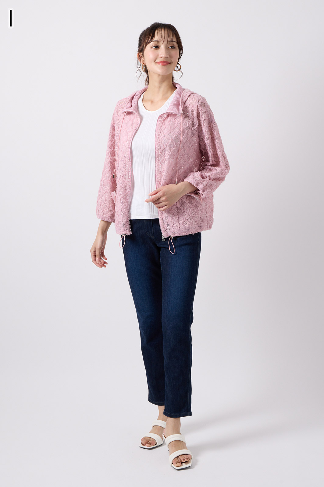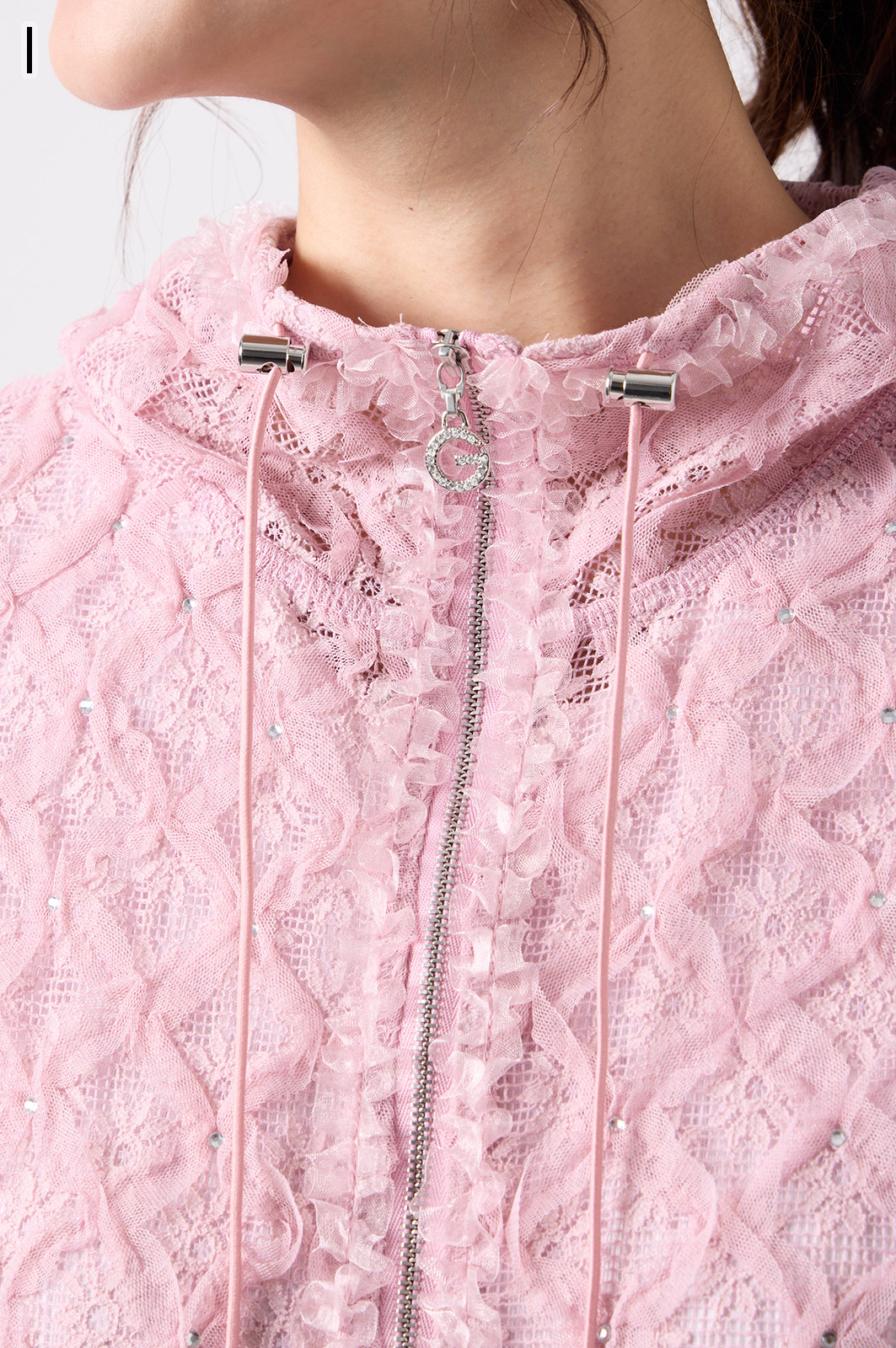 レースの上にメッシュ生地を交差させて重ねた、立体感あるデザイン。カジュアルなパーカーを女性らしくやわらかな雰囲気に仕上げました。