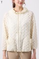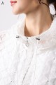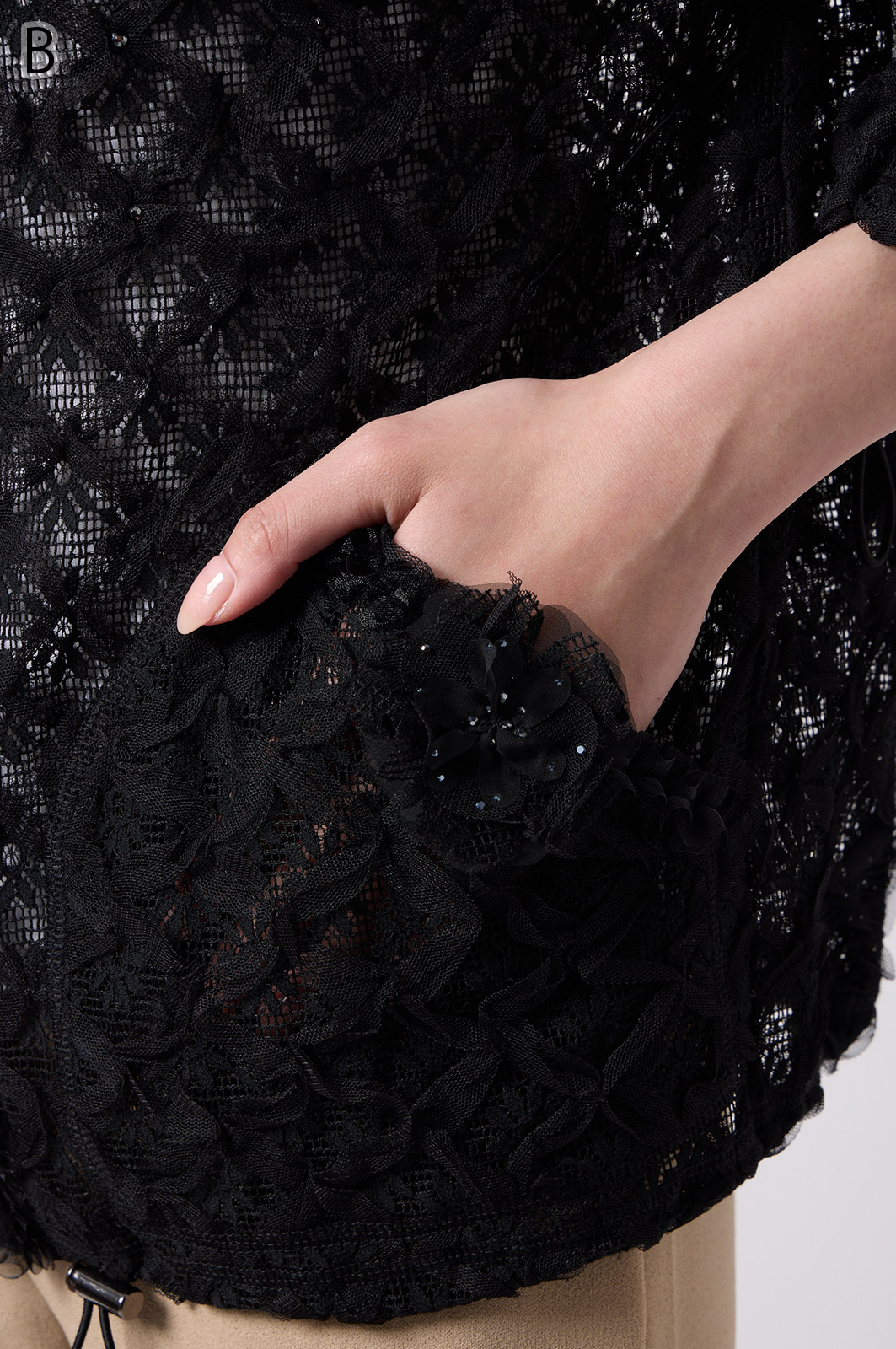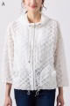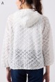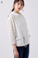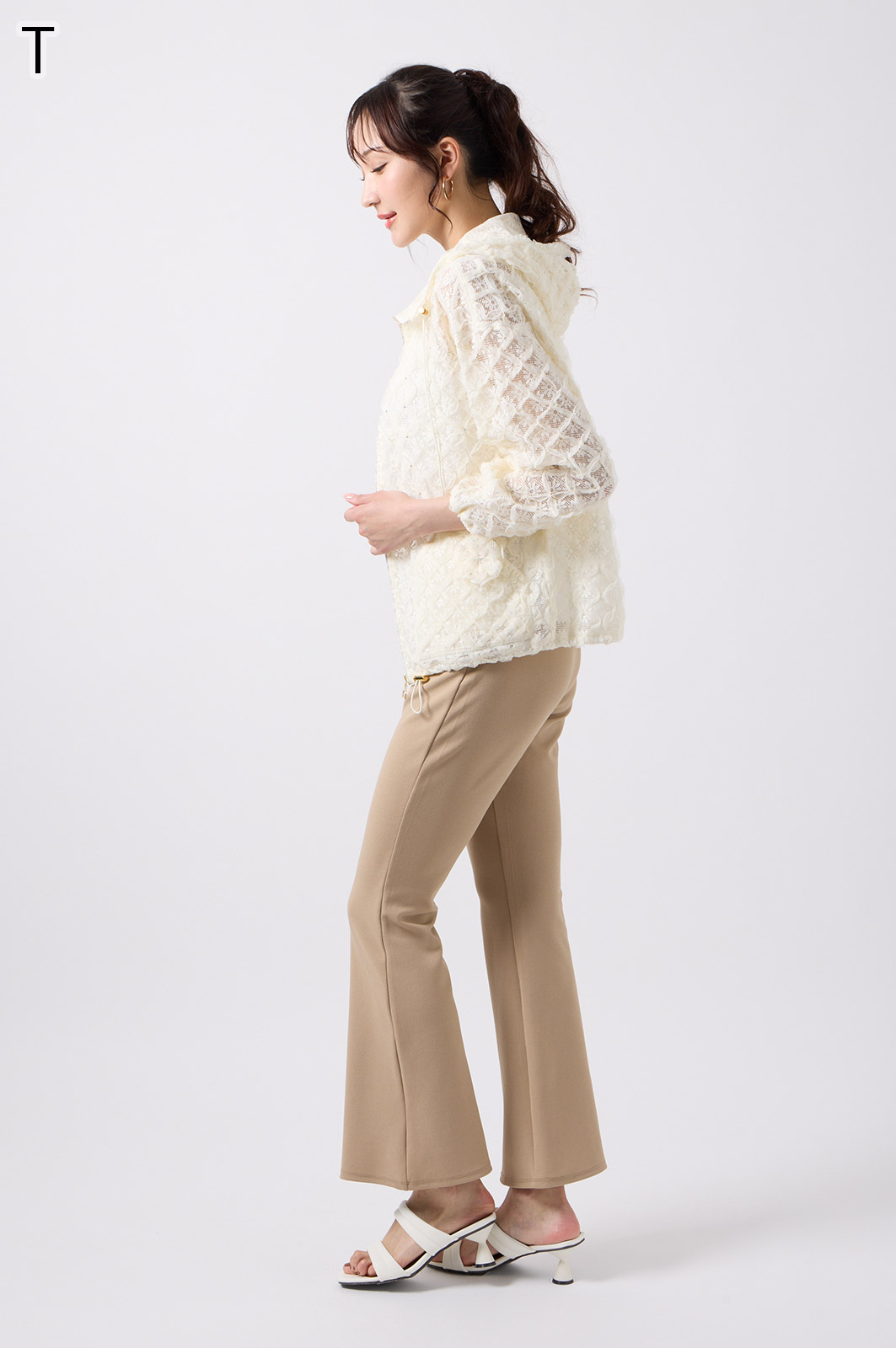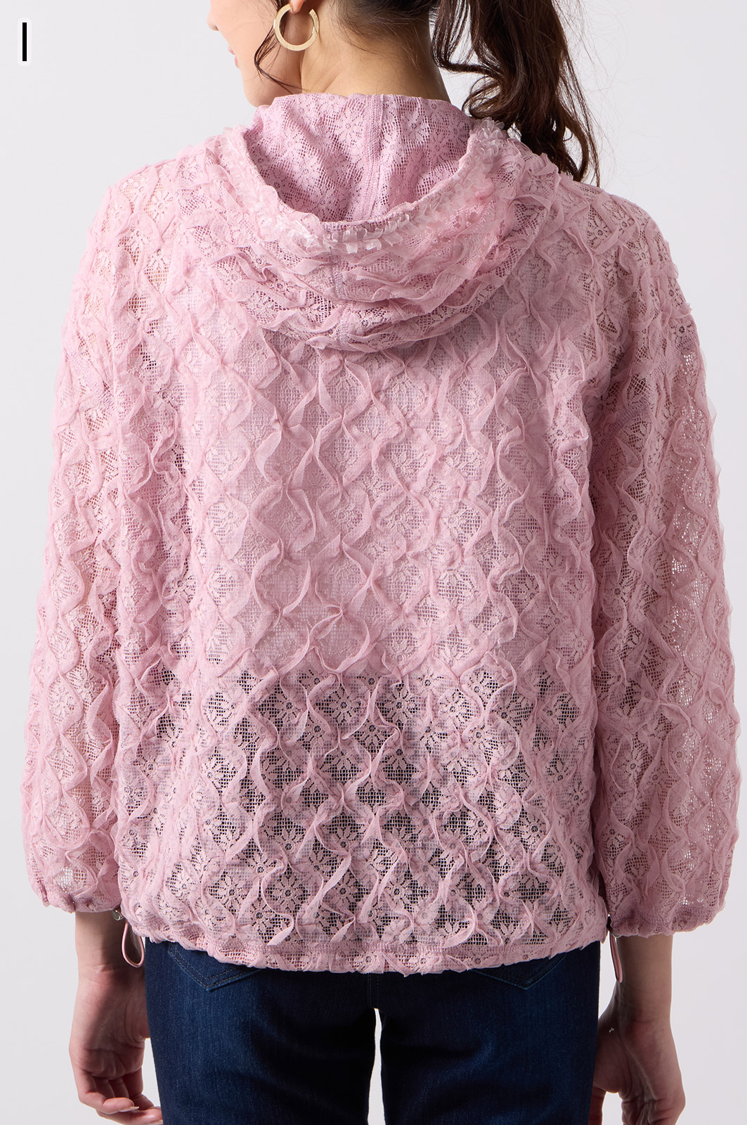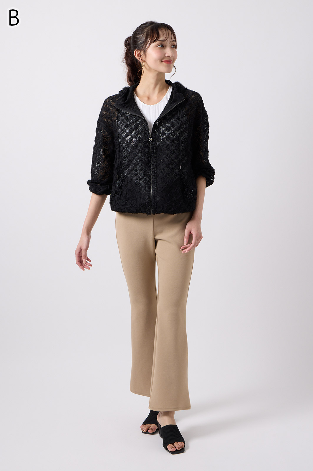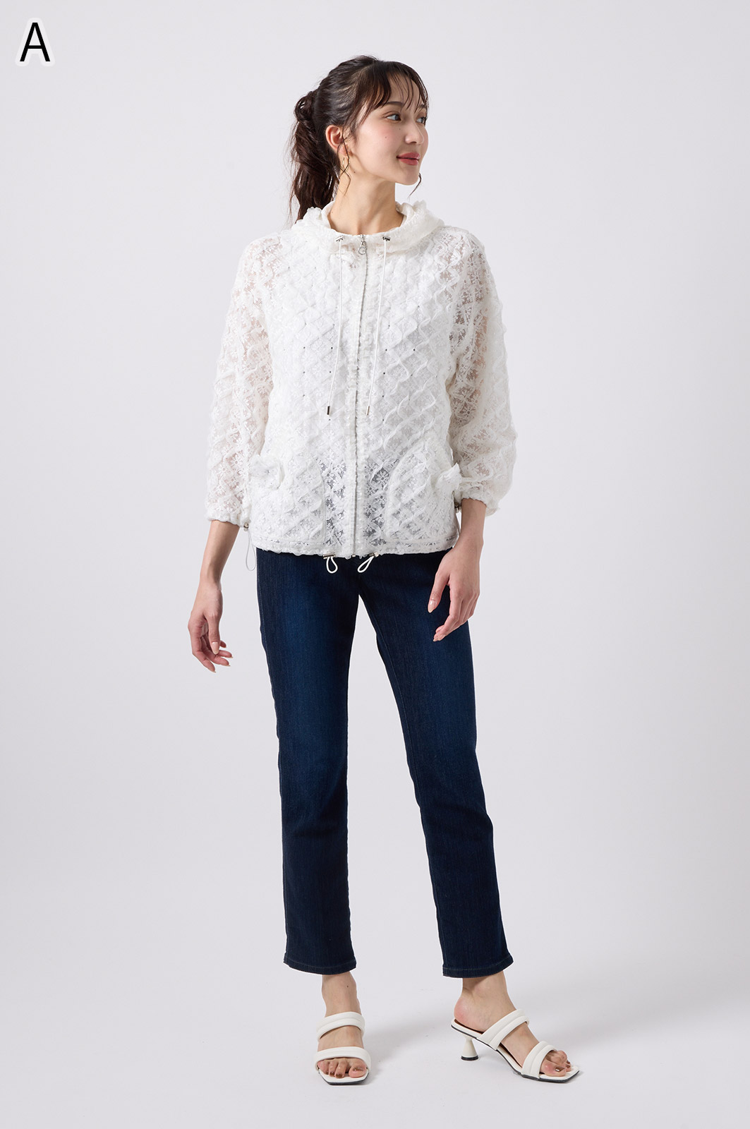 レースの上にメッシュ生地を交差させて重ねた、立体感あるデザイン。カジュアルなパーカーを女性らしくやわらかな雰囲気に仕上げました。